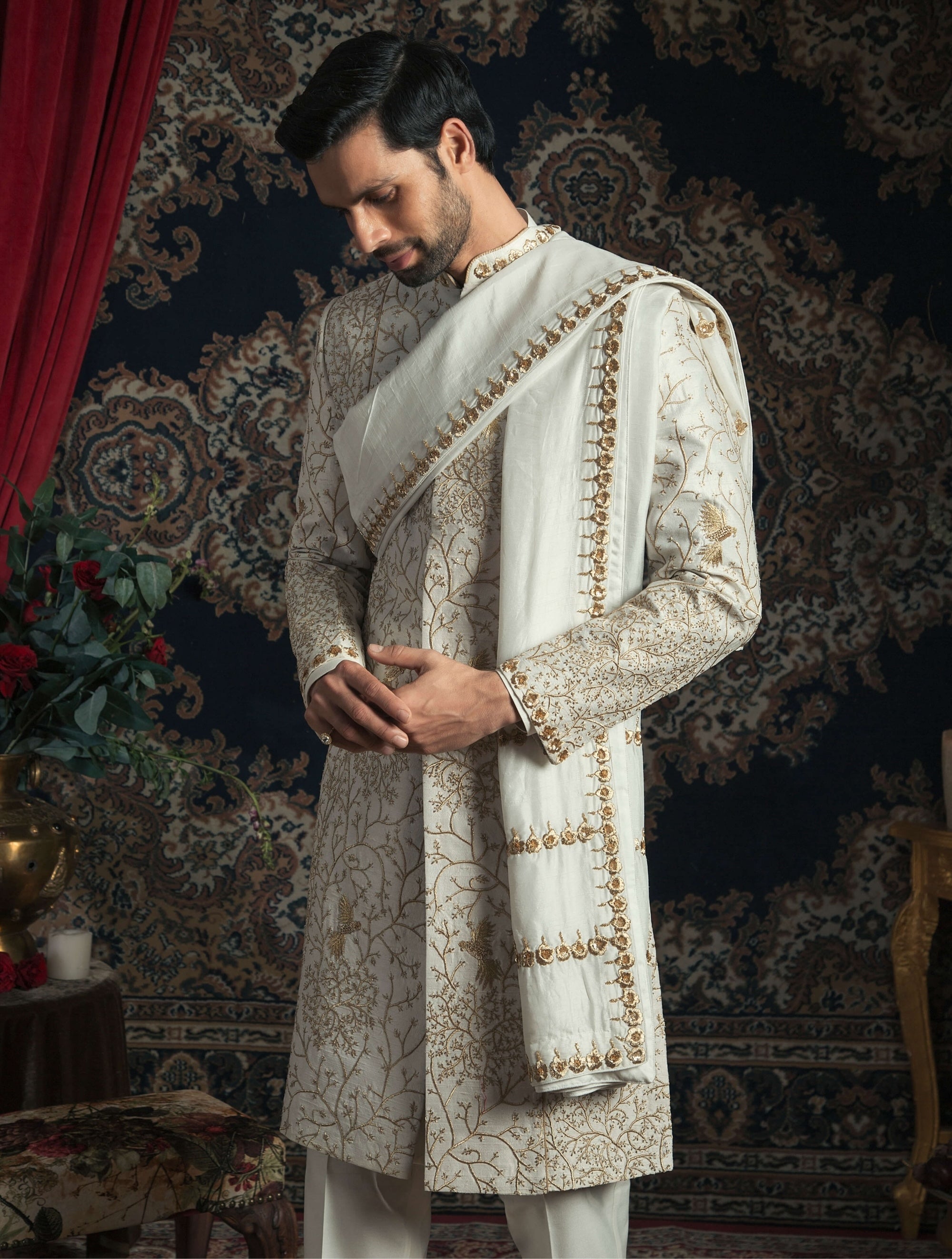 Experience timeless elegance with our ivory sherwani set, a sophisticated ensemble that blends classic style with intricate artistry. This exquisite set features an ivory sherwani adorned with a unique jungle theme embroidery, showcasing intricate tilla, katdana, and sequin work, all crafted from a luxurious blend of raw silk and cotton silk. The soft ivory hue is enhanced by the detailed embroidery, creating a refined and majestic appearance.