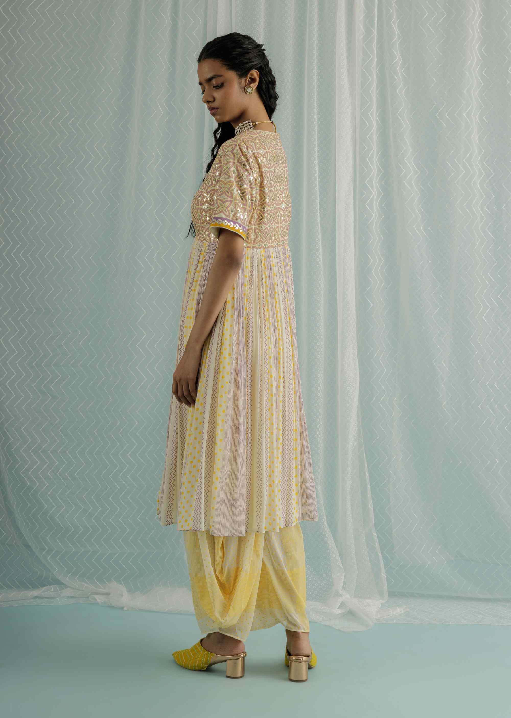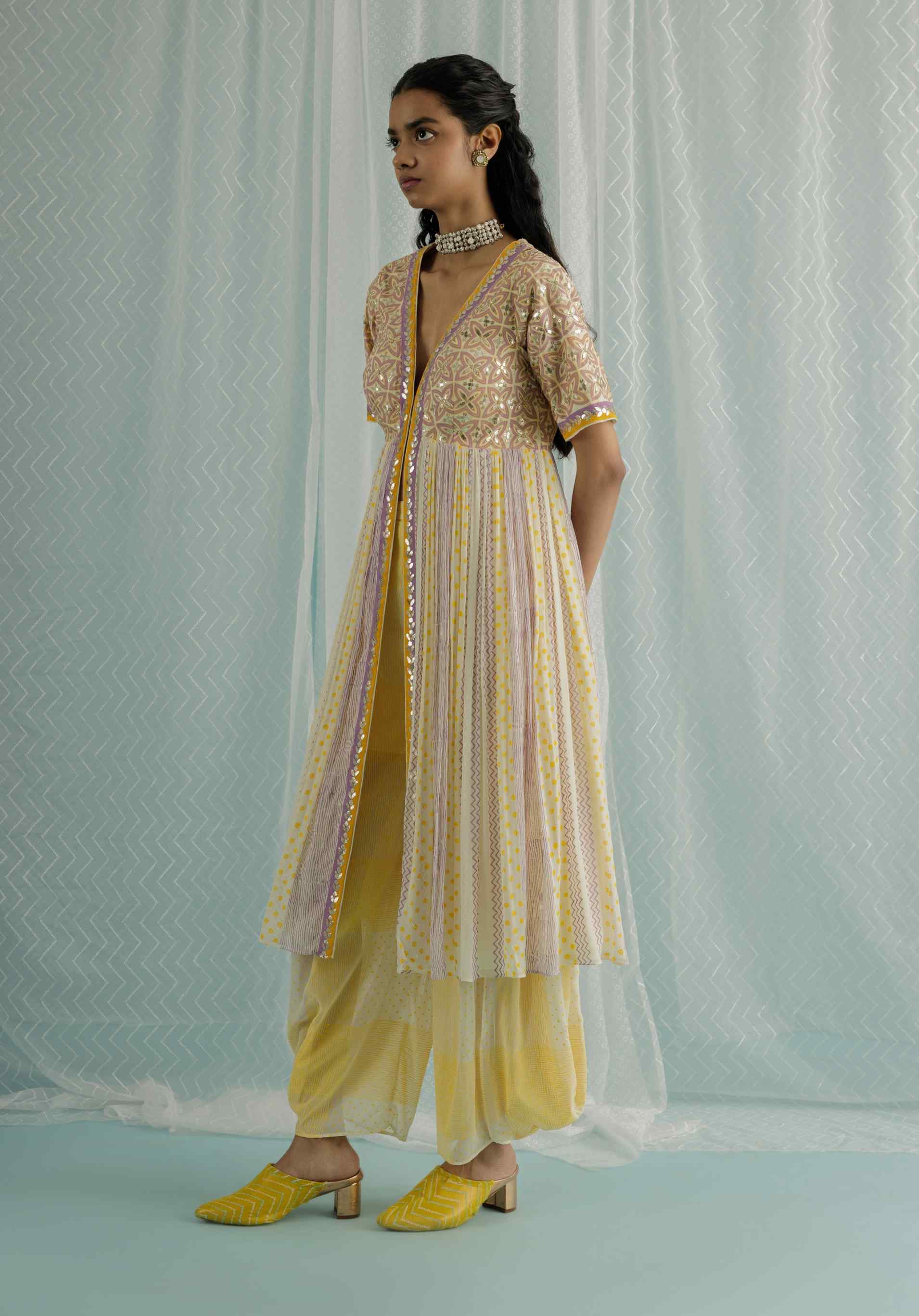 Discover the refined charm of our ivory georgette kurta, a stunning piece that combines traditional artistry with contemporary flair. This elegant kurta features custom block printing in soft shades of lilac and yellow, which is further enhanced by intricate hand embroidery with gota, sequin, and bead work. The detailing adds a touch of sophistication and texture to the kurta’s flowing silhouette. Paired with stylish printed dhoti pants, this ensemble offers a unique and fashionable look that's perfect for festive occasions or special events. Embrace the perfect blend of grace and modernity with this exquisite kurta.