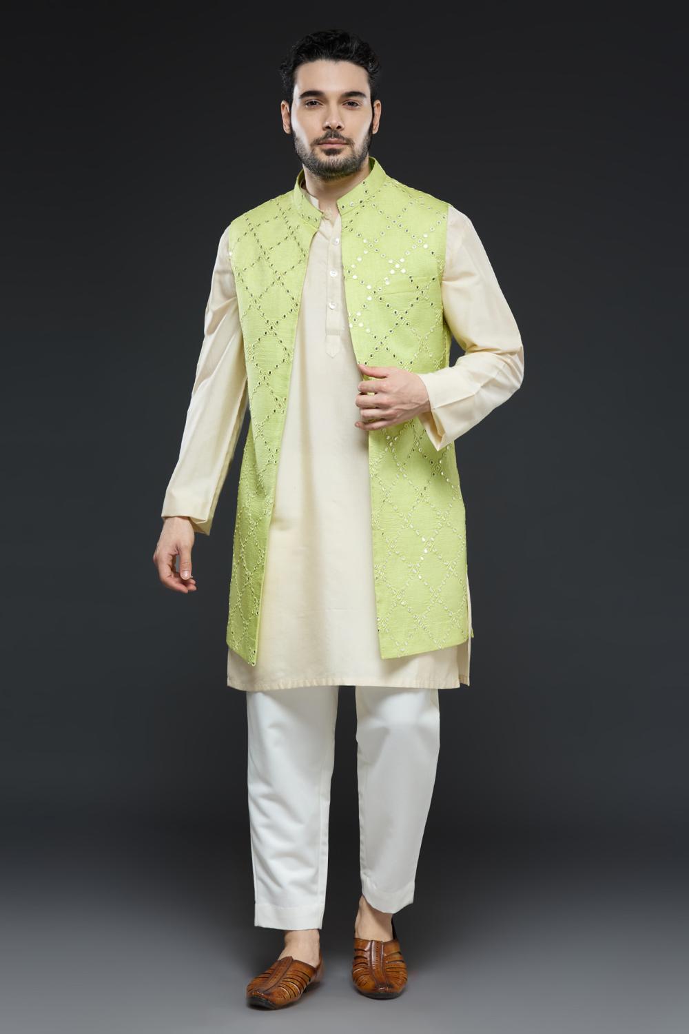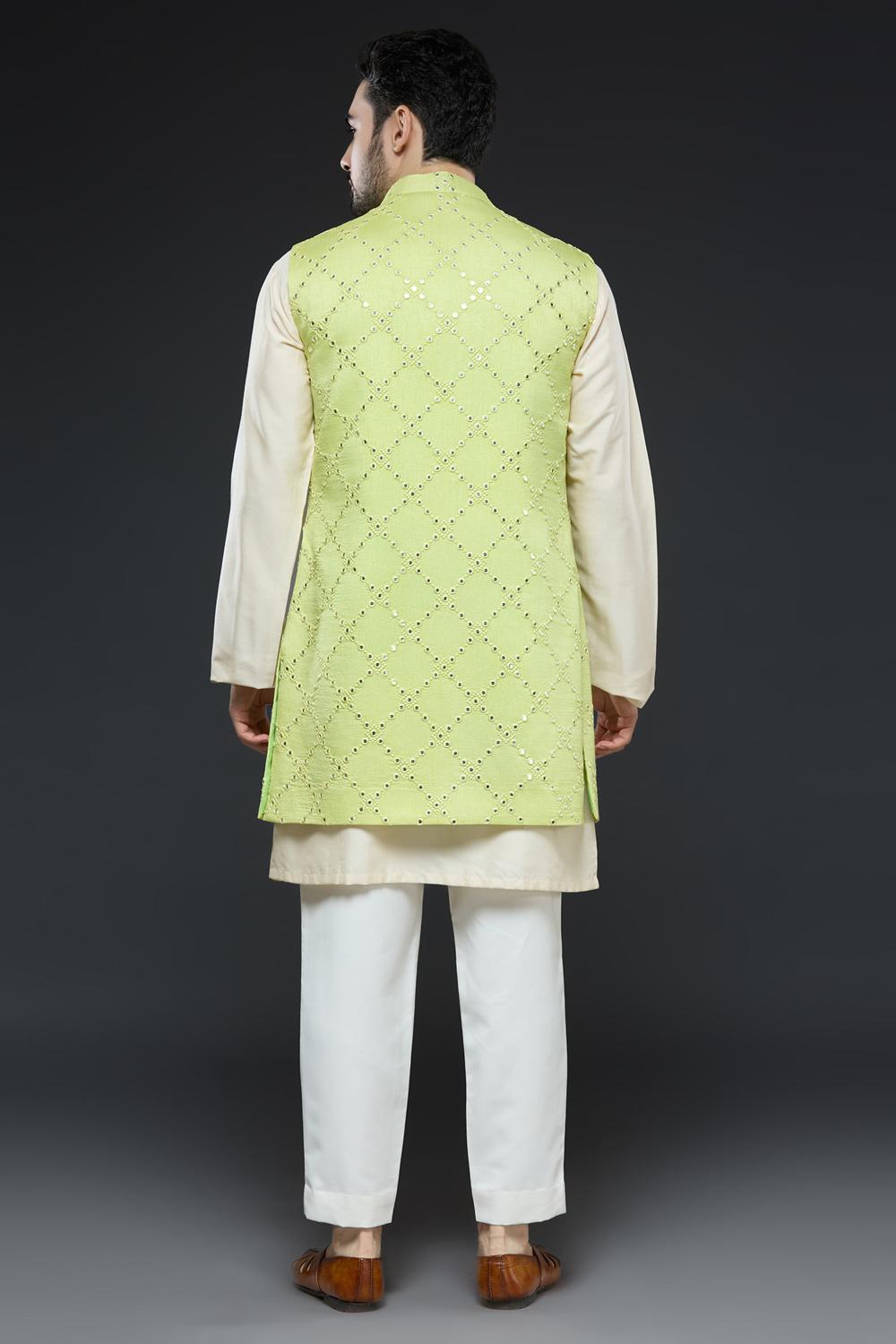 Ivory kurta and slim pant set paired with bright green long open jacket