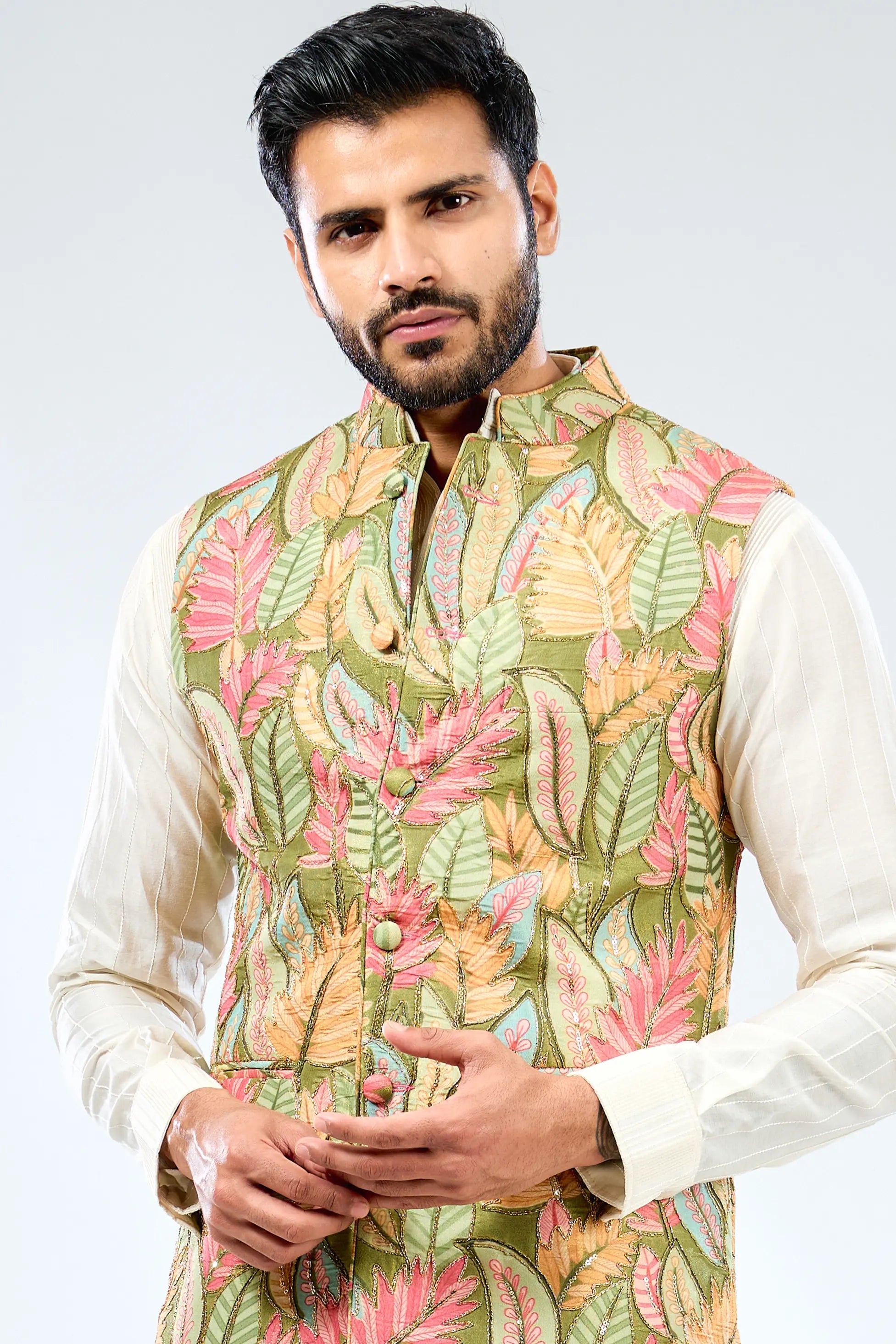 Discover timeless elegance with our ivory kurta, beautifully paired with a vibrant multicolor bundi and matching ivory pants. This sophisticated ensemble is perfect for festive occasions and celebrations, showcasing a perfect blend of tradition and contemporary style. Elevate your ethnic wardrobe with this chic outfit that radiates grace and charm.