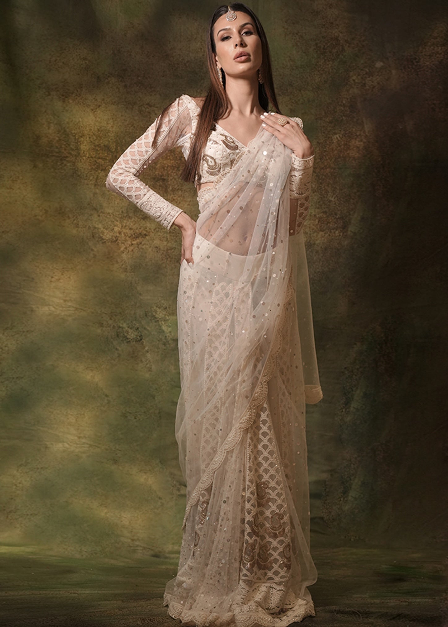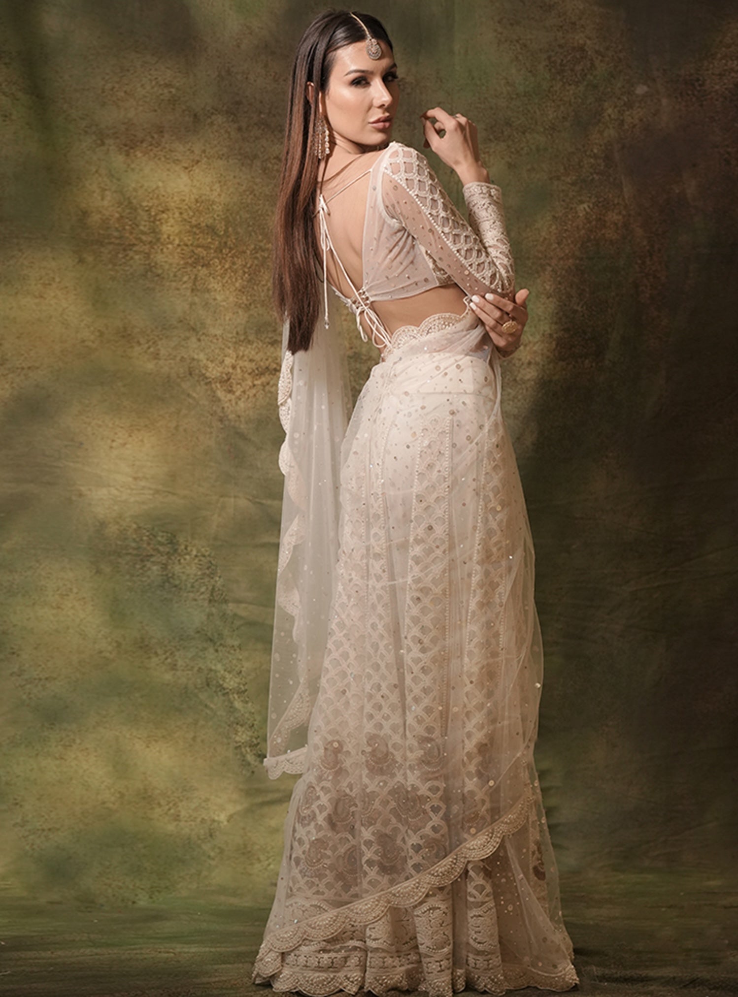 Experience timeless sophistication with this elegant outfit, where graceful ivory hues are beautifully adorned with intricate pearl embroidery. The pre-stitched skirt saree features exquisite lucknowi thread work, enhanced with shimmering stones, pearls, and sequins. Paired with a net dupatta that boasts a delicate pearl border and a full-sleeve blouse, the ensemble exudes refined charm.