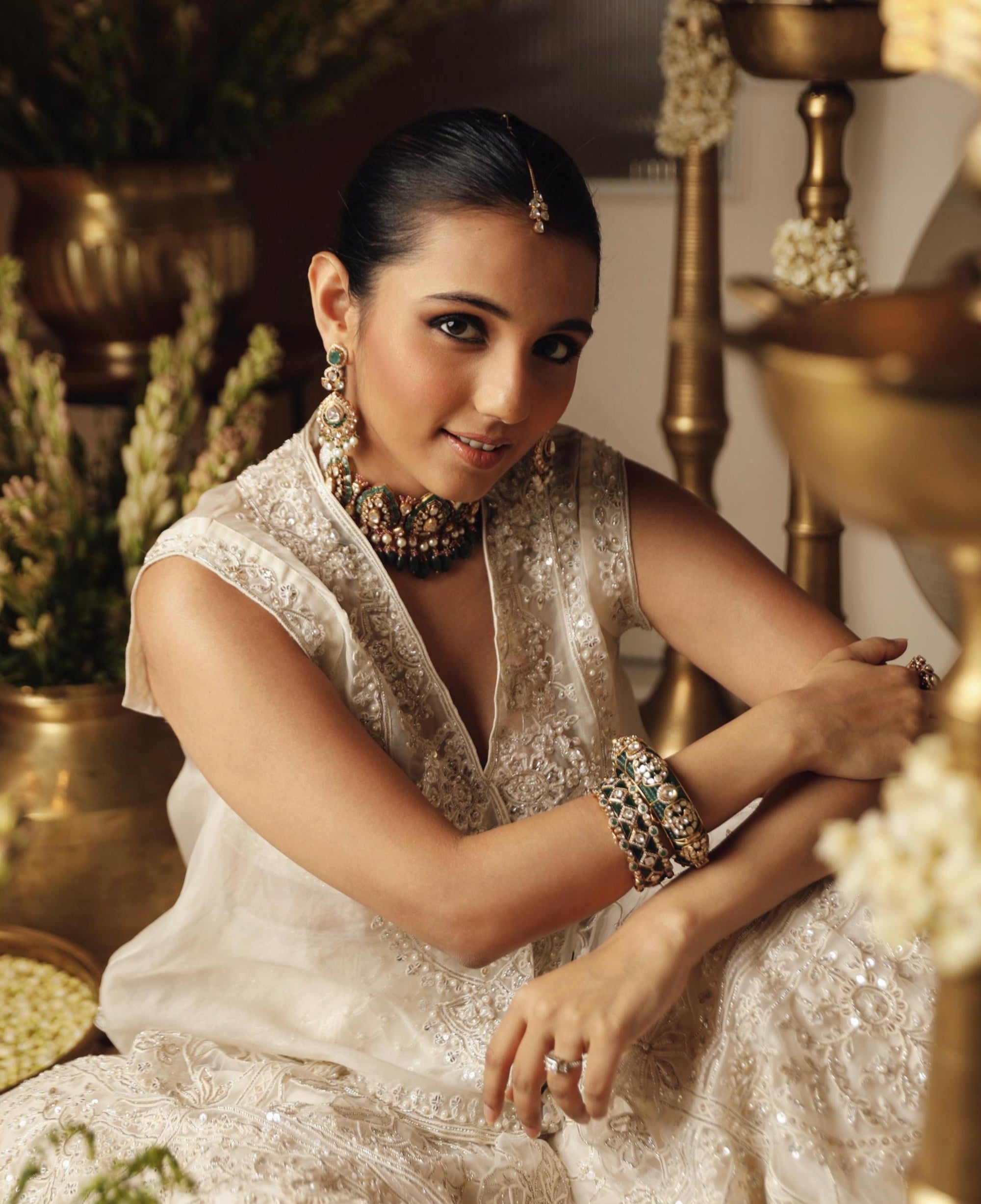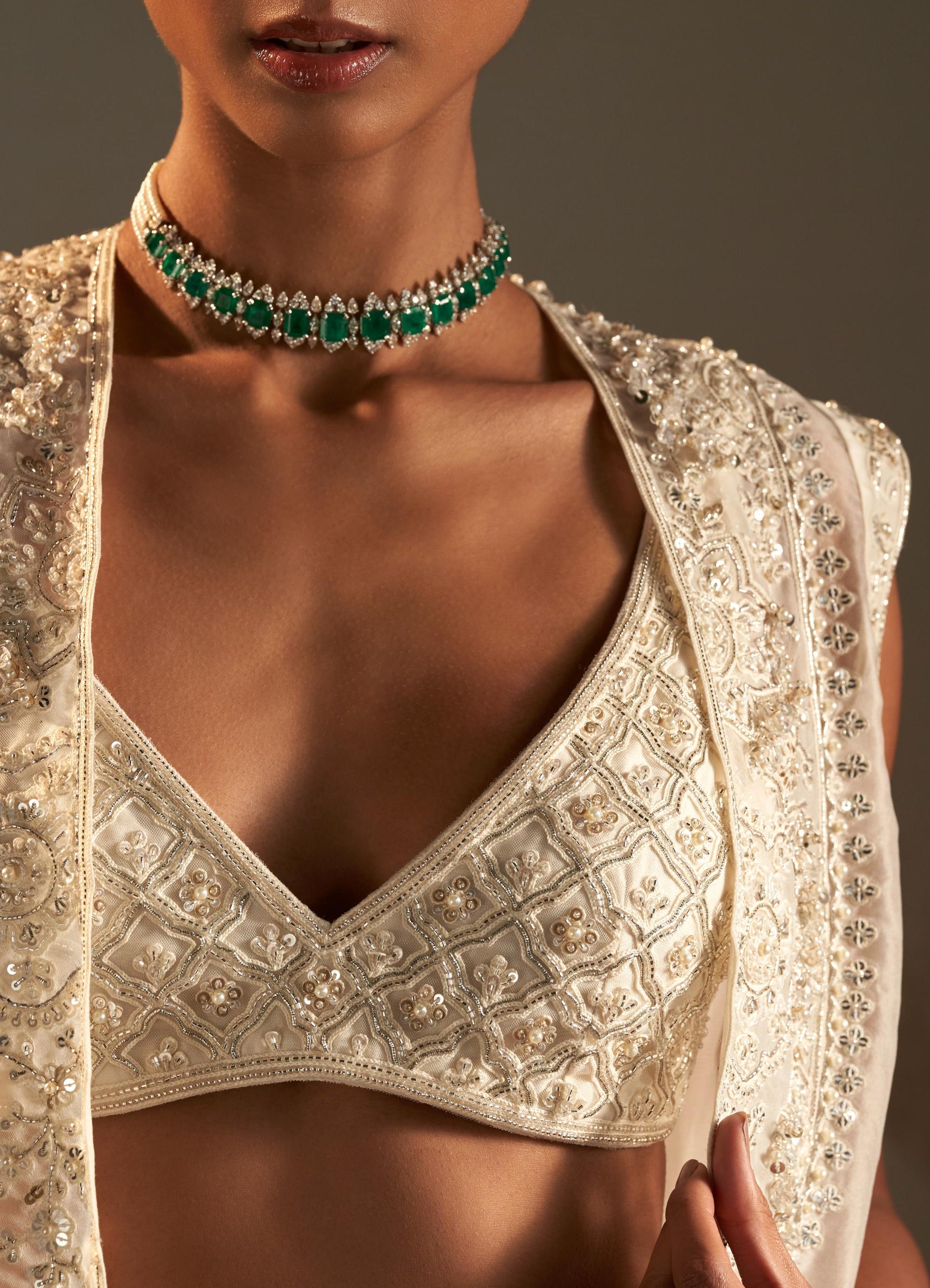 The Ivory Moti Safarnama Lehenga Set captures the grace of tradition with the softness of modern elegance. Embellished with pearl-inspired detailing, this ethereal ivory ensemble brings a touch of serenity and sophistication to any celebration. The flowing lehenga, paired with a delicately crafted blouse and dupatta, creates a luminous silhouette that moves with poetic charm. Perfect for day weddings, bridal events, or festive gatherings, this look is a celebration of timeless beauty in its most graceful form.