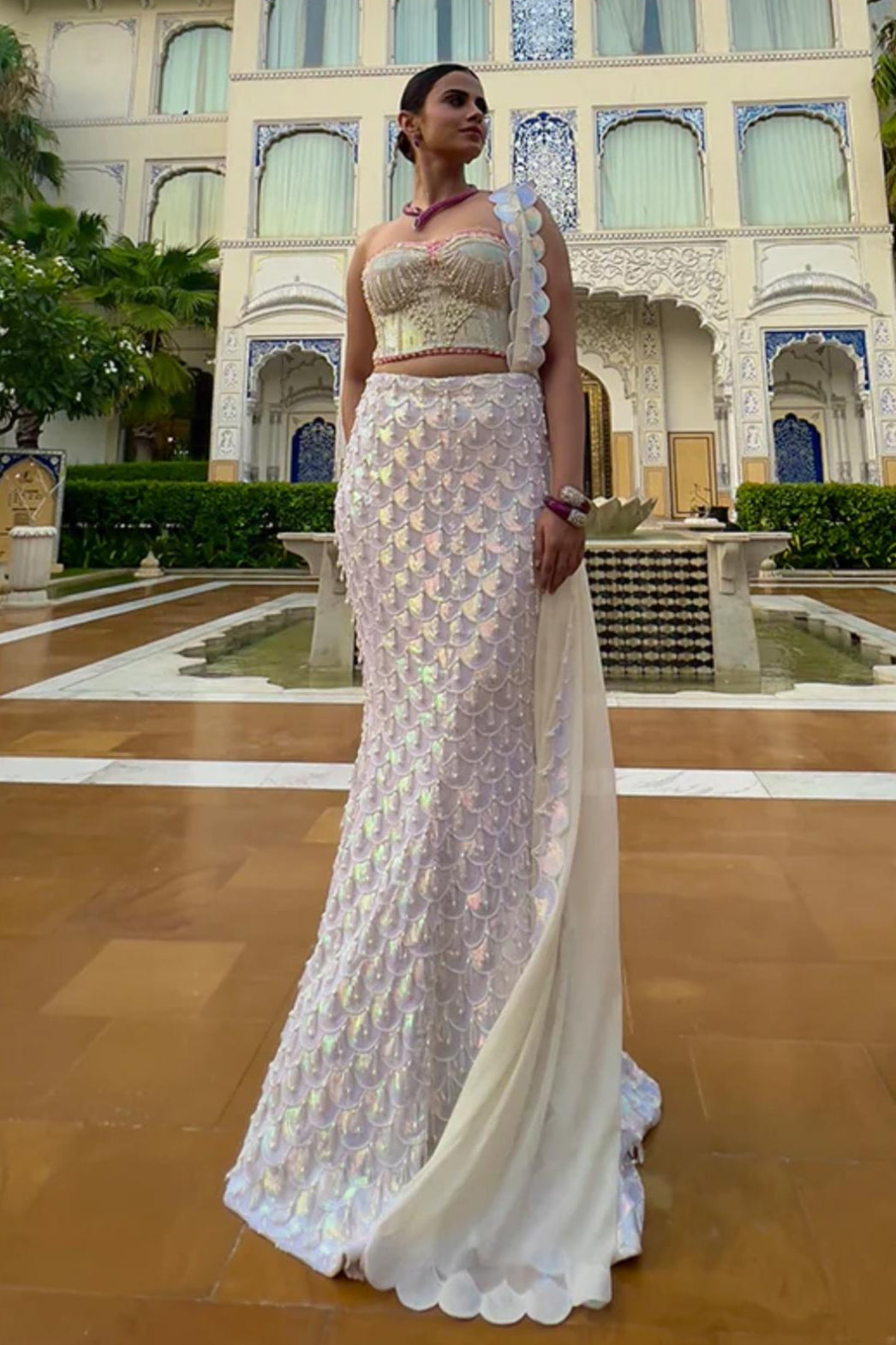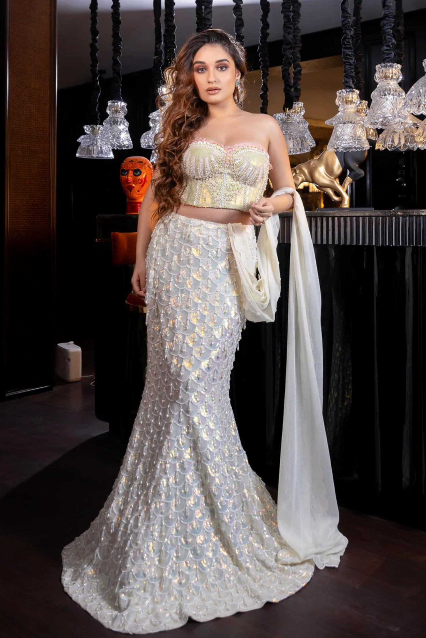 The Mermaid Saree is an enchanting ensemble that mimics the shimmer of ocean scales, embroidered with our signature sequins and delicate pearl tassels. Paired with a mystically handcrafted bustier top, adorned with a swirl of signature pearls, this look captures fantasy and finesse in one. A bold yet graceful choice, the Mermaid Saree is perfect for those who want to make a statement with elegance and edge.