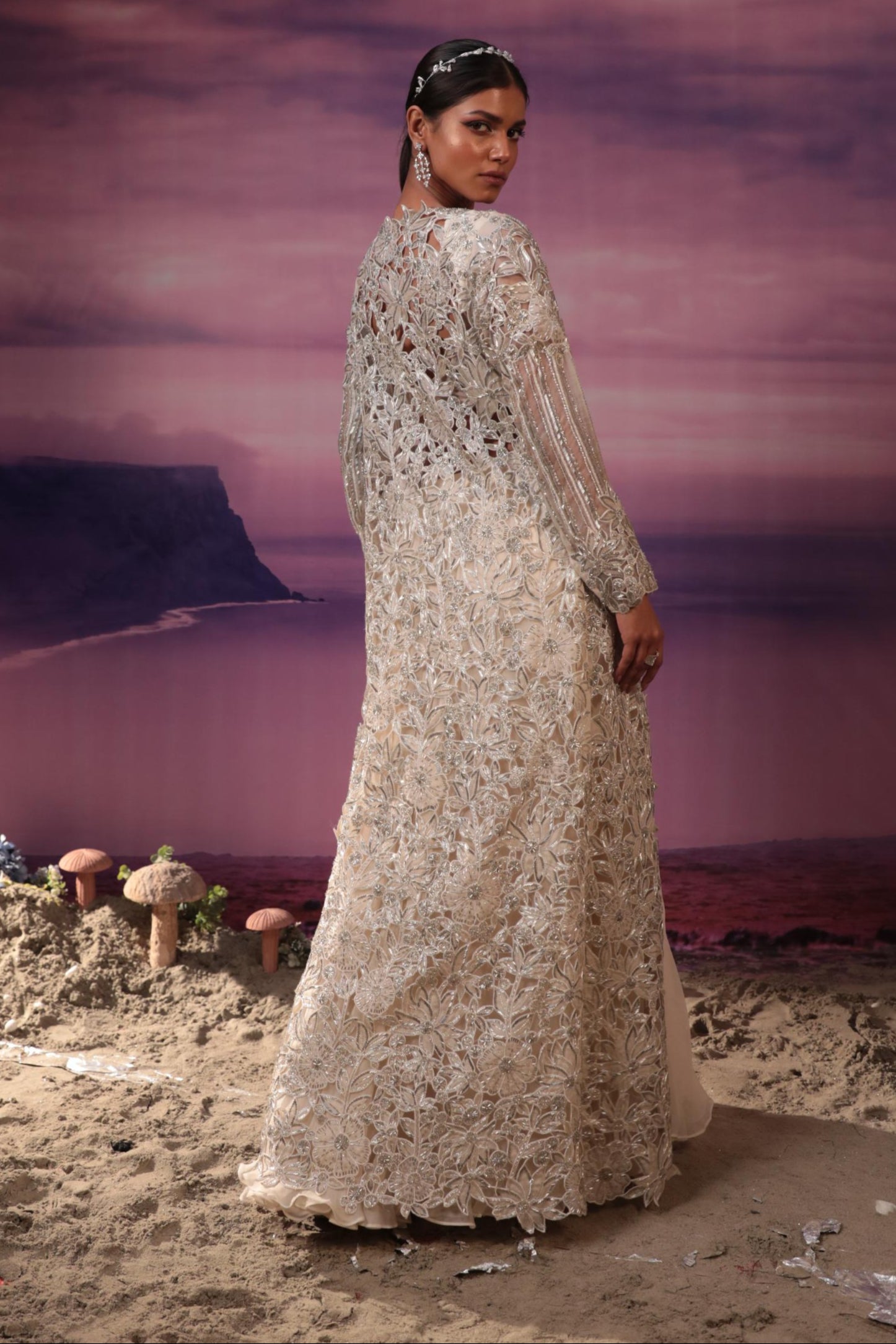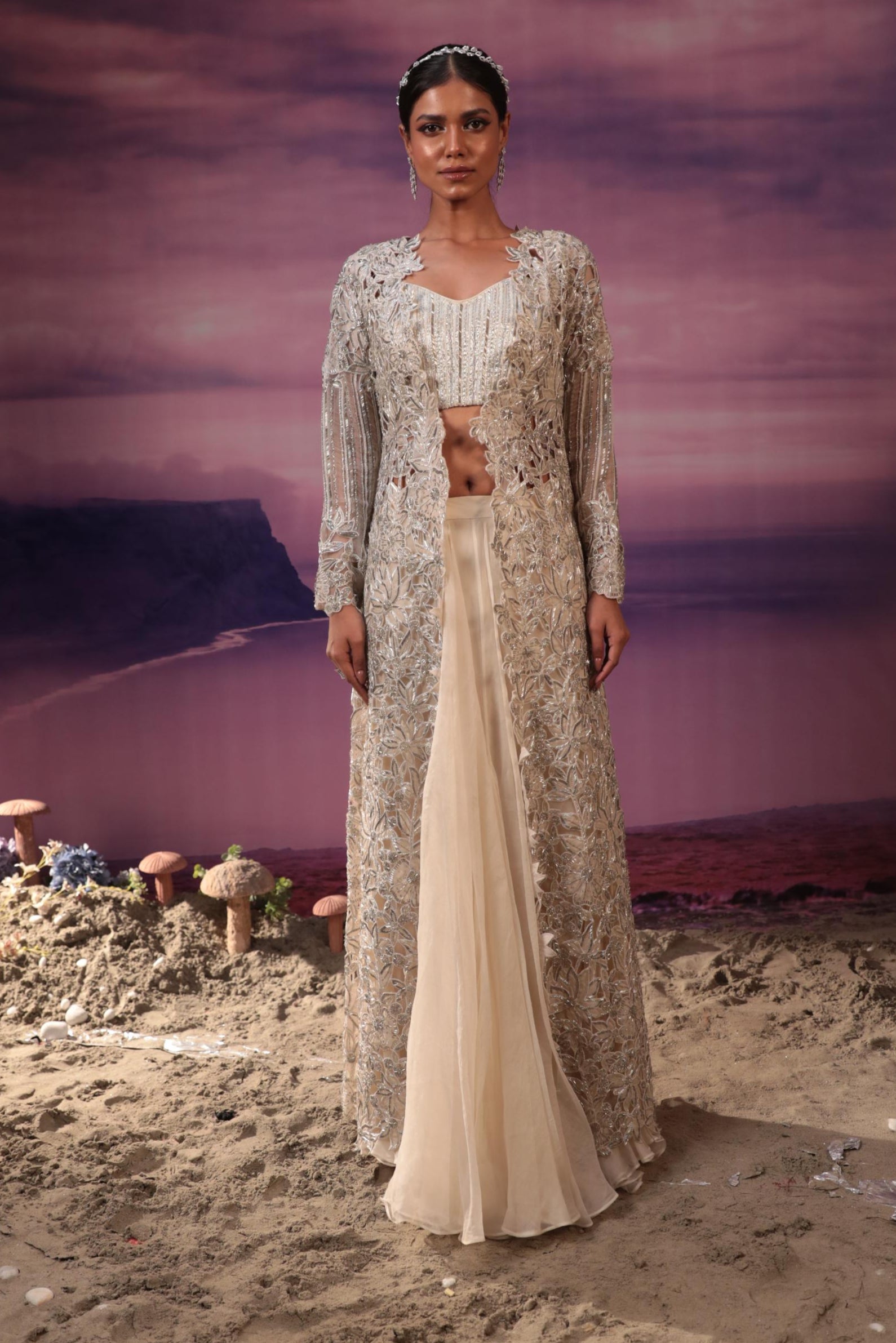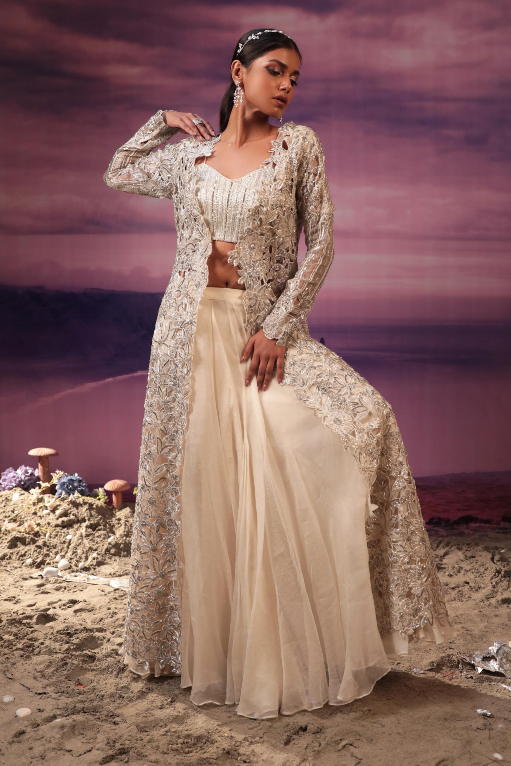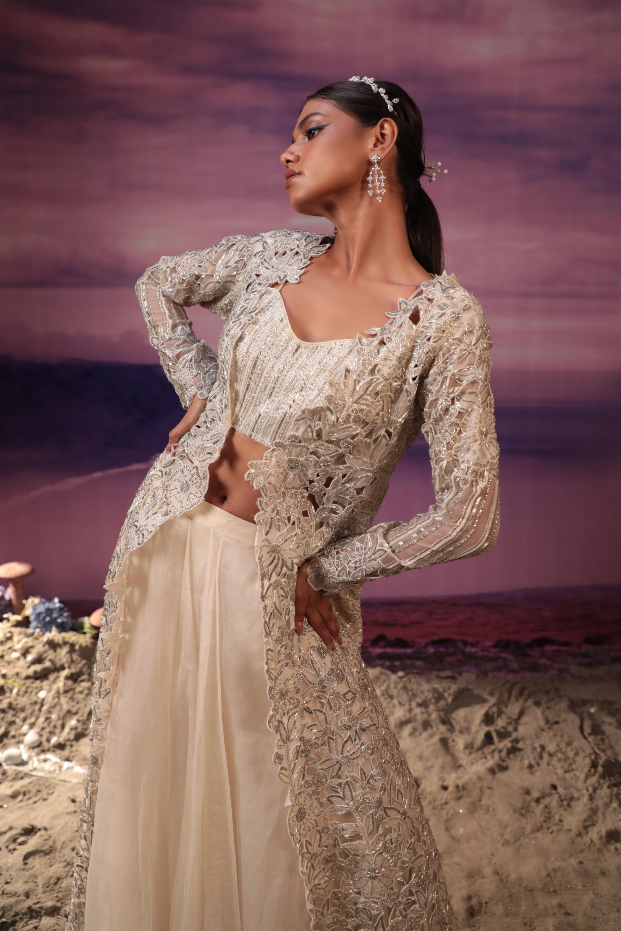 Make a bold statement with this exquisite set featuring a heavily embroidered cutwork jacket that exudes sophistication. Paired with a finely embroidered blouse and a graceful flared skirt, this ensemble blends intricate craftsmanship with contemporary elegance. Perfect for weddings or festive celebrations, it ensures you shine effortlessly on every special occasion.