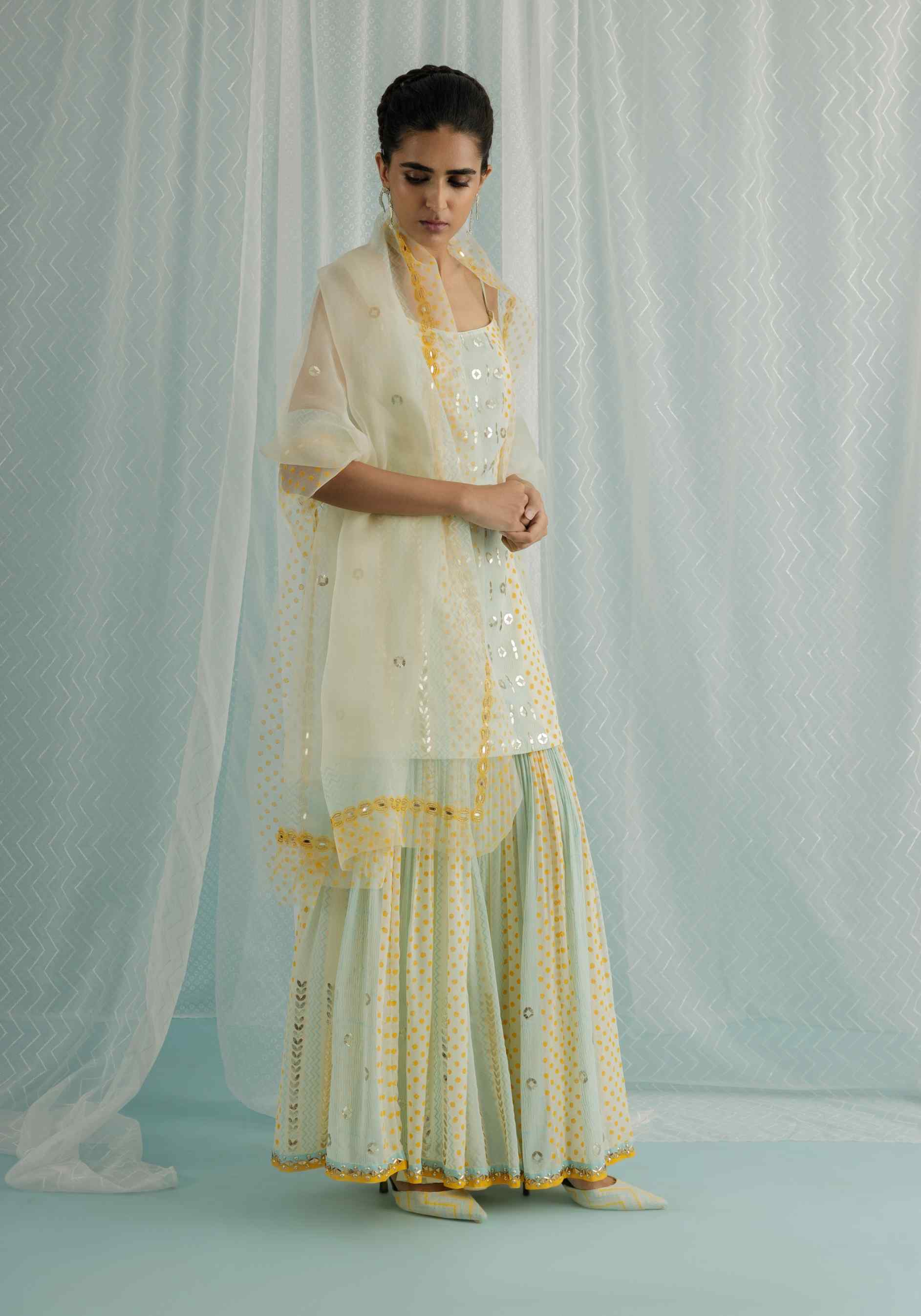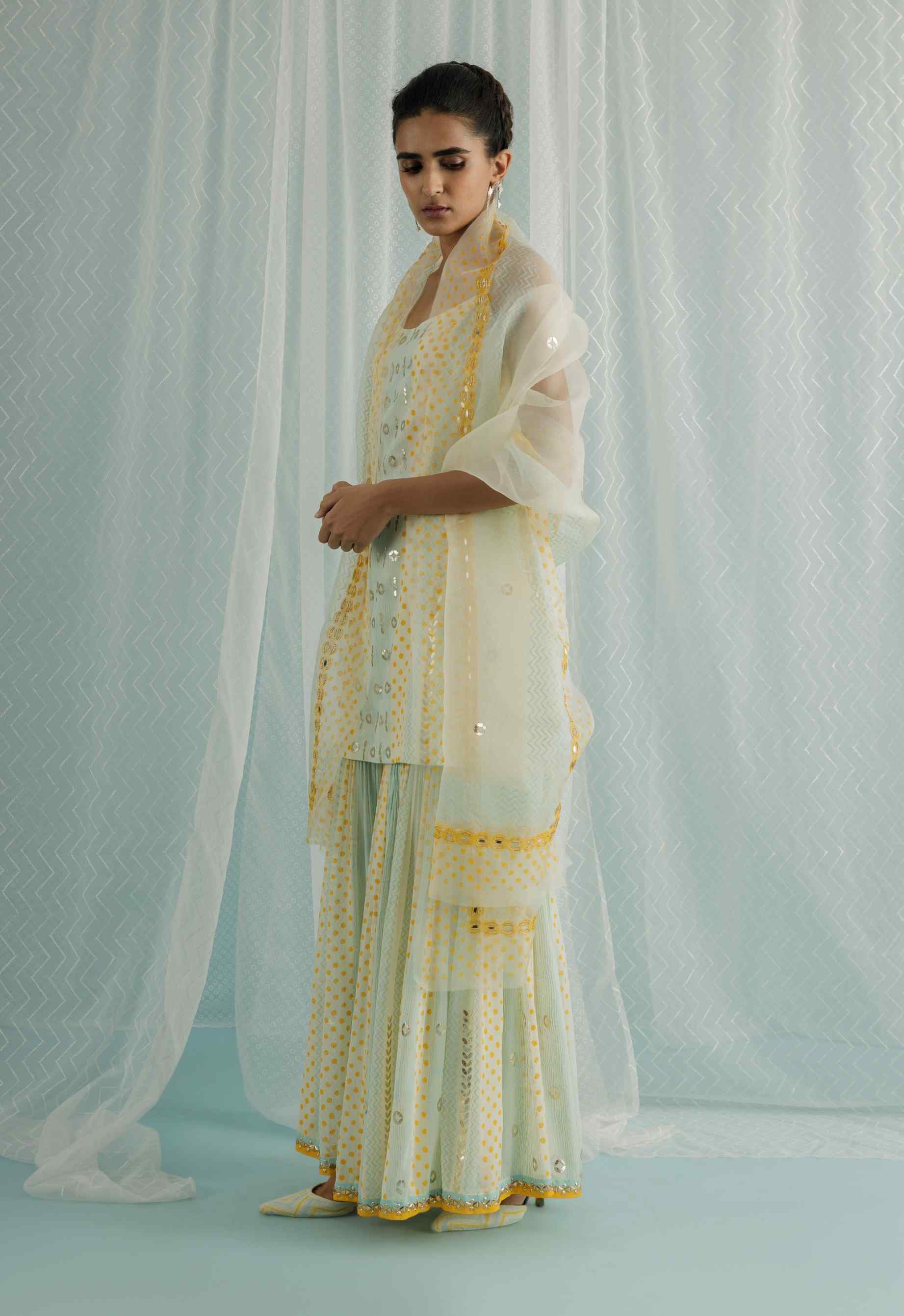 Elevate your ensemble with our ivory georgette kurta sharara set, a sophisticated choice for any special occasion. This graceful set features custom block printing in elegant shades of ice blue and yellow, beautifully complemented by intricate hand embroidery with gota, sequin, and bead work. The luxurious detailing enhances the kurta’s flowing silhouette and the sharara’s voluminous drape. Paired with a delicately printed and embroidered organza dupatta, this outfit offers a harmonious blend of traditional craftsmanship and contemporary design. Perfect for festive events or celebrations, this kurta sharara set promises both style and elegance.