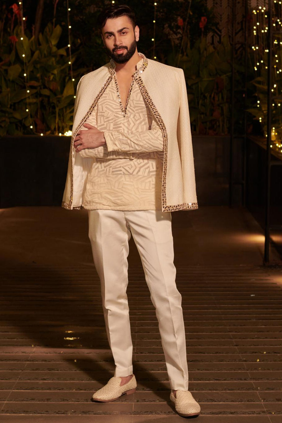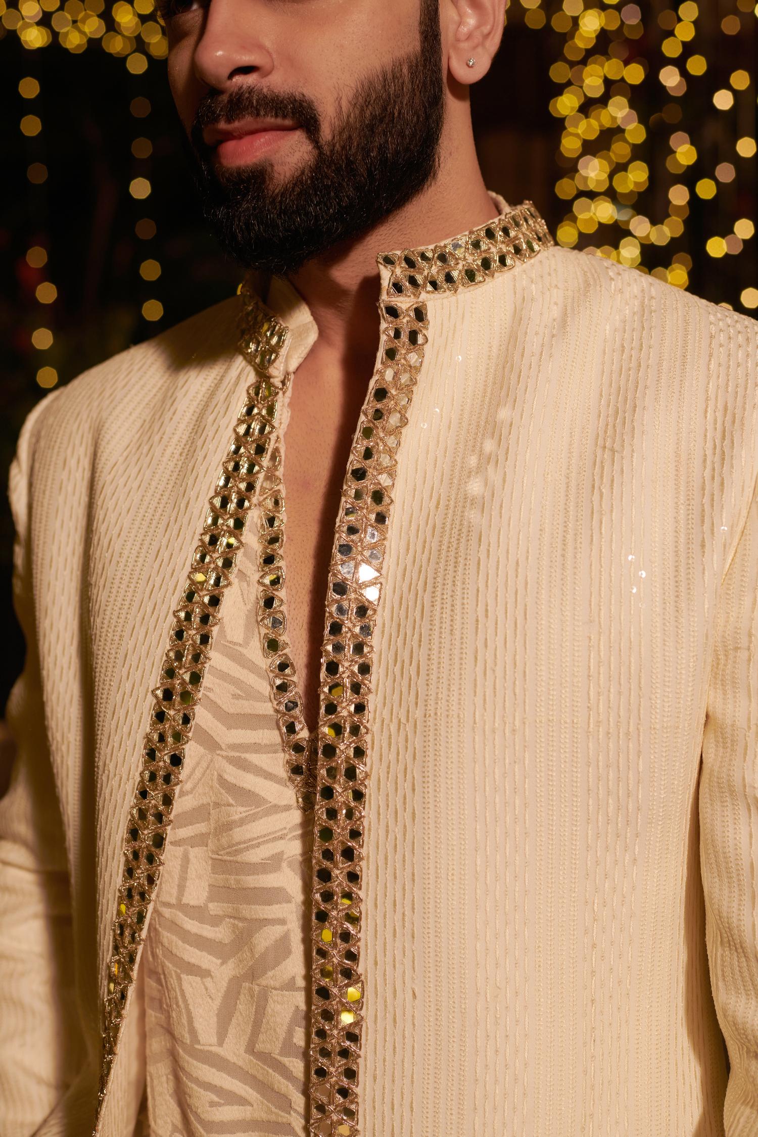 This ivory short jacket set redefines contemporary elegance with intricate thread handwork mirror accents and gold zari embroidery. The refined Chanderi pants complete the look making it a sophisticated choice for receptions and grand celebrations.