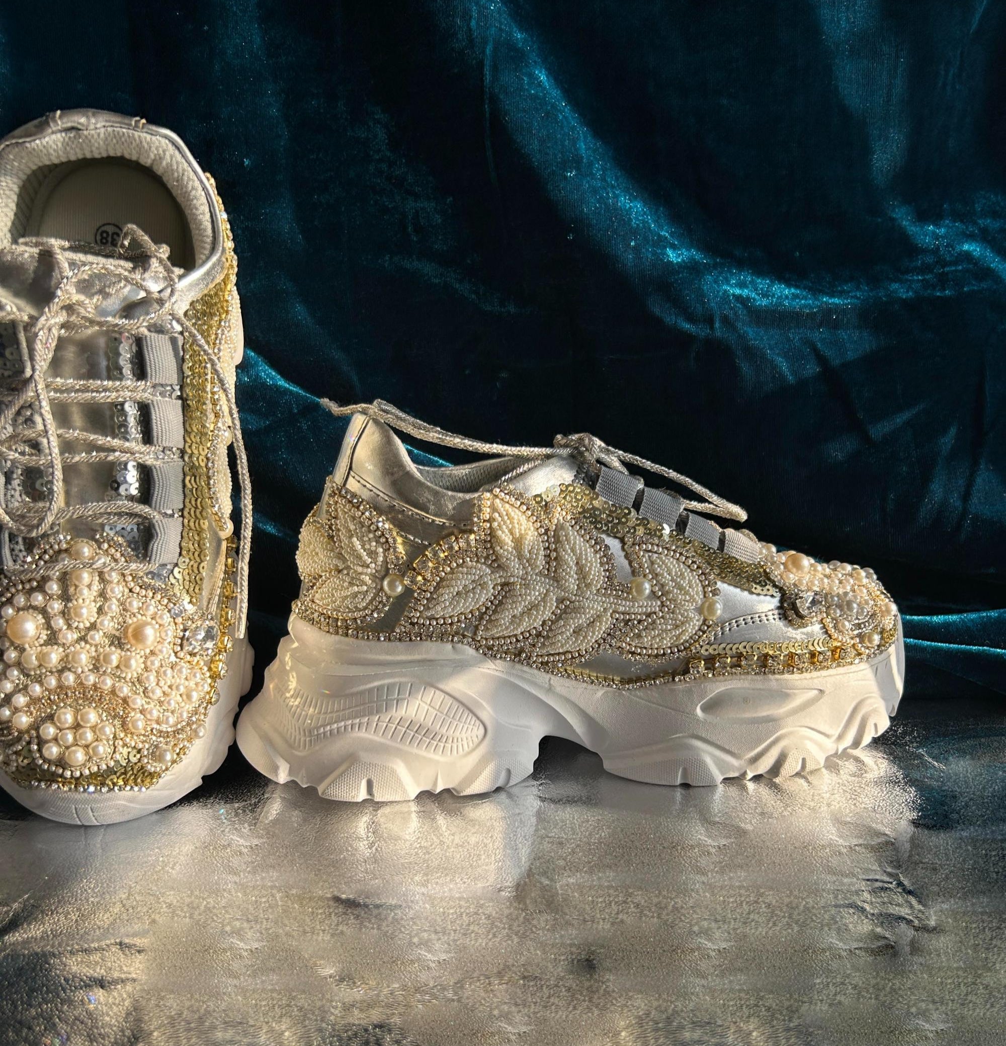 Step into regal elegance with these exquisite wedding sneakers, a true masterpiece of intricate pearl bead embroidery. Featuring a stunning royal crown design adorned with luminous pearls and shimmering stones, they exude opulence with every step. Delicate floral and leaf motifs add a touch of grace, while ultra-soft memory foam insoles ensure unmatched comfort for your special day.