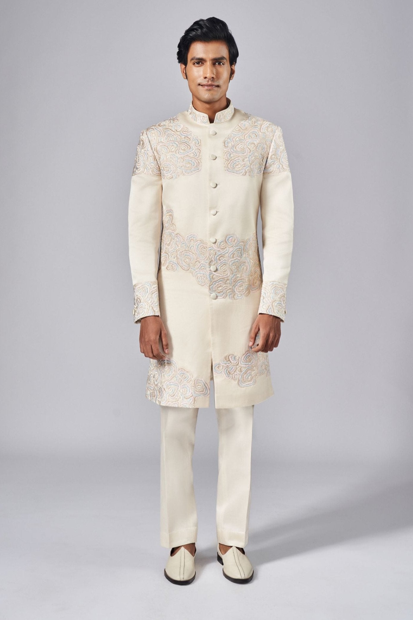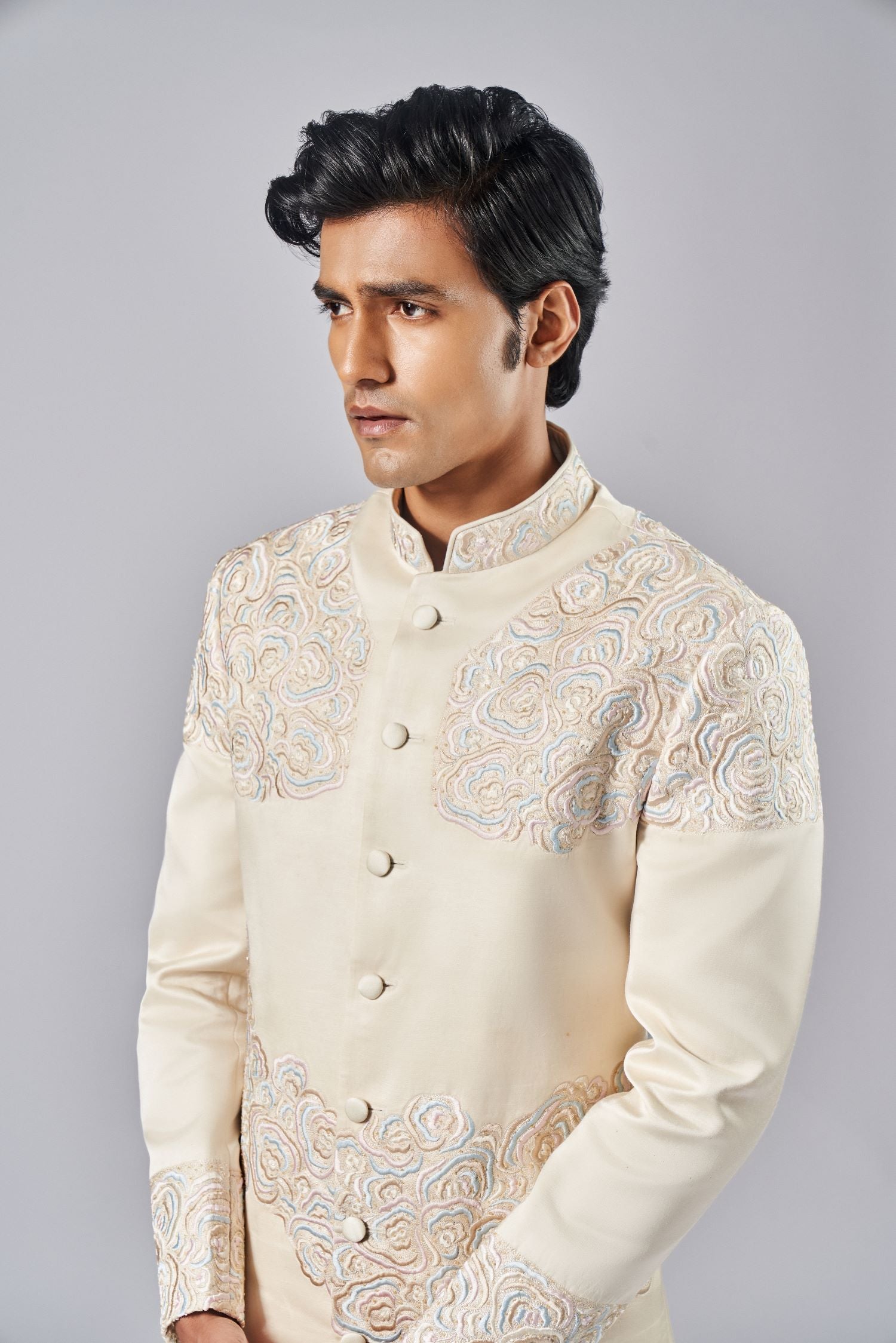 Exude regal sophistication with the Ivory Placement Thread and Cut Dana Embroidered Sherwani, a stunning combination of traditional craftsmanship and modern design. The soft ivory base offers a timeless and versatile canvas, while the intricate placement thread and cut dana embroidery creates a luxurious, textured look that enhances the overall aesthetic of this ensemble.