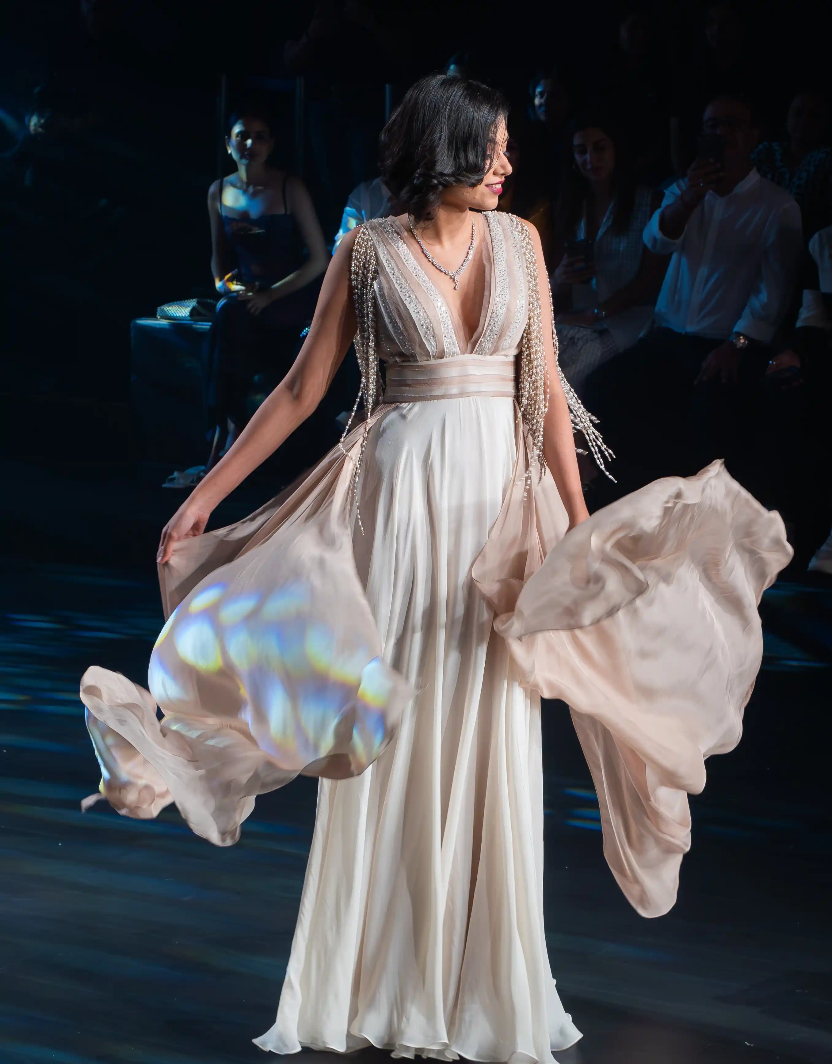 Step into elegance with this stunning plunge neck chiffon gown, designed to make a statement. The gown features embellished tassel sleeves that add a playful yet sophisticated flair, while the layered tulle and organza on the bodice create a beautiful, ethereal effect. Perfect for formal events or special occasions, this gown effortlessly blends modern allure with timeless charm, ensuring you leave a lasting impression wherever you go.