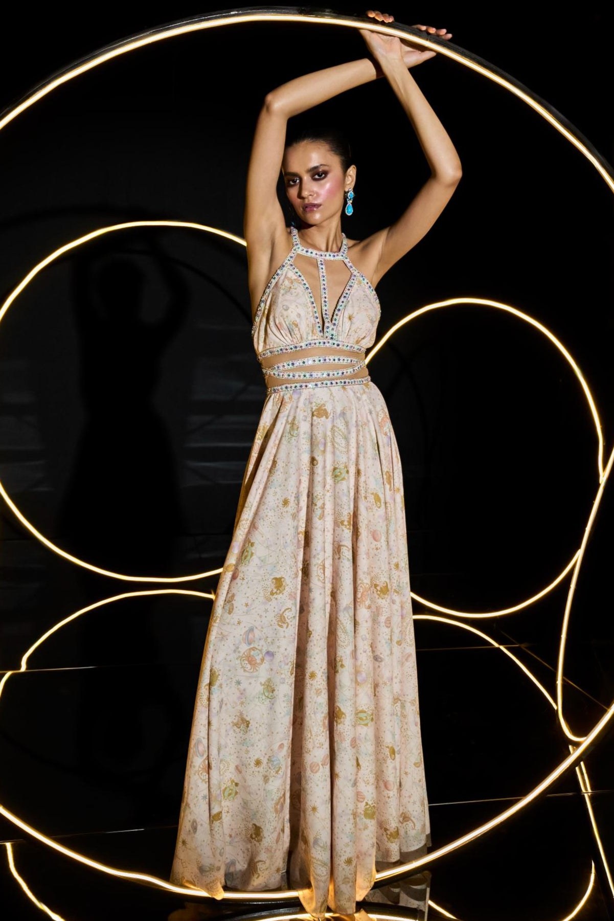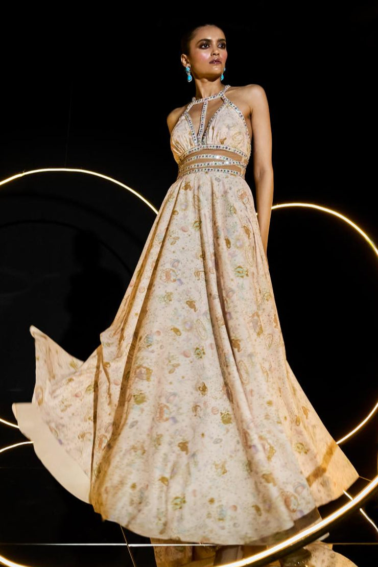 Make a statement with the Ivory Poudre Multicolored Spectra Cut-Out Gown, a stunning fusion of modern design and timeless elegance. This gown features a soft ivory poudre base adorned with vibrant multicolored accents that create a striking visual contrast. The unique cut-out detailing adds a bold, contemporary twist to the classic gown silhouette, giving it an edgy yet sophisticated allure.