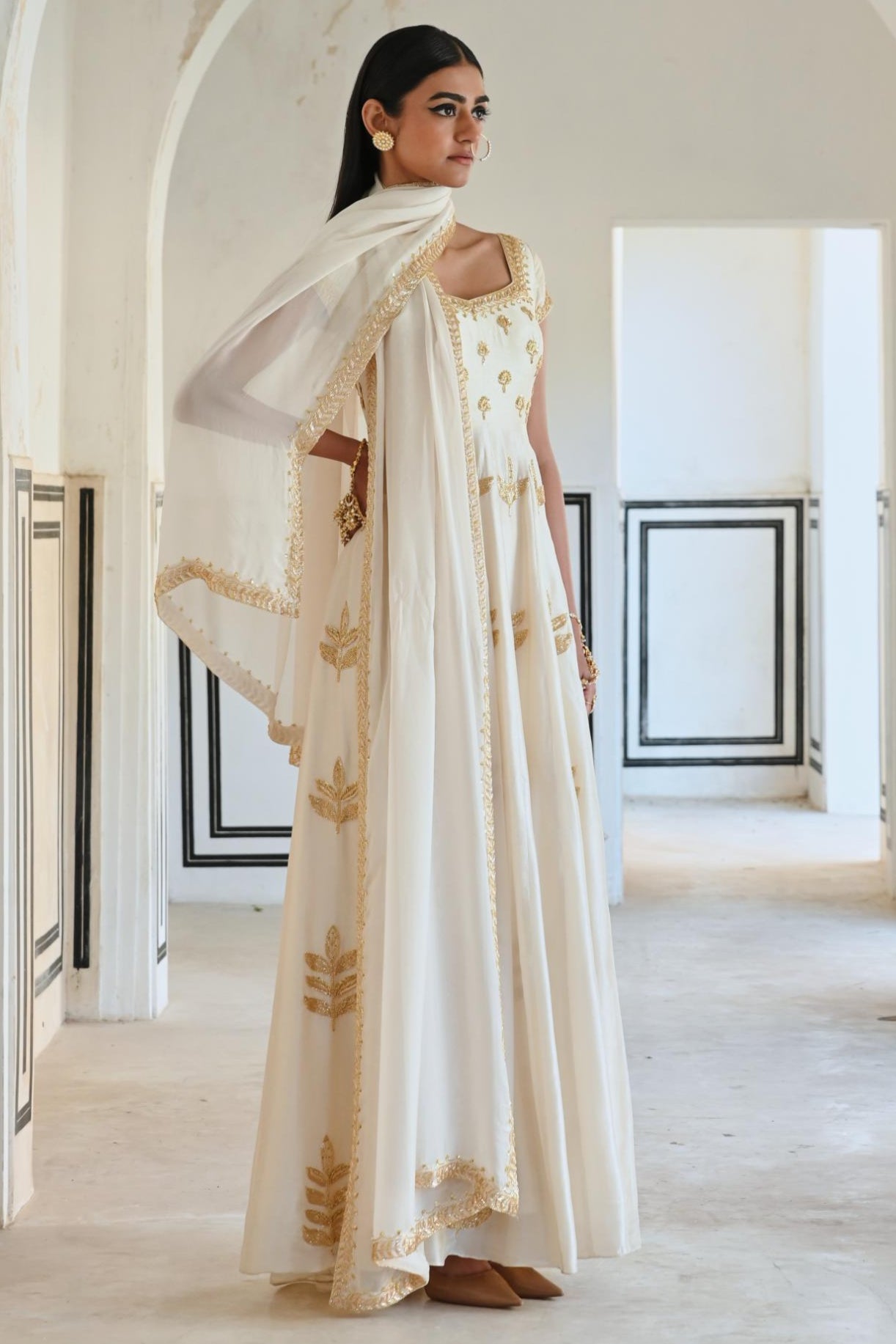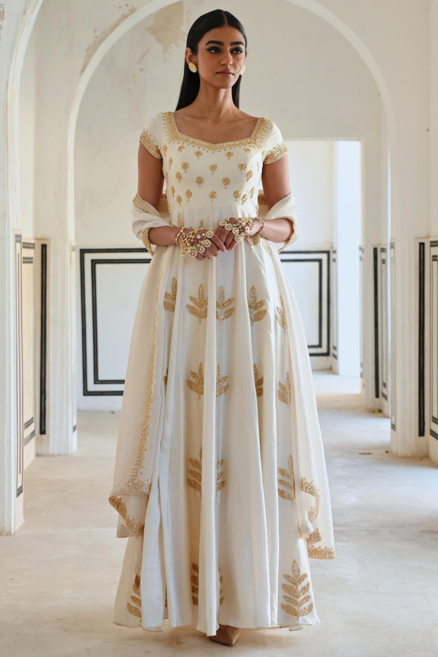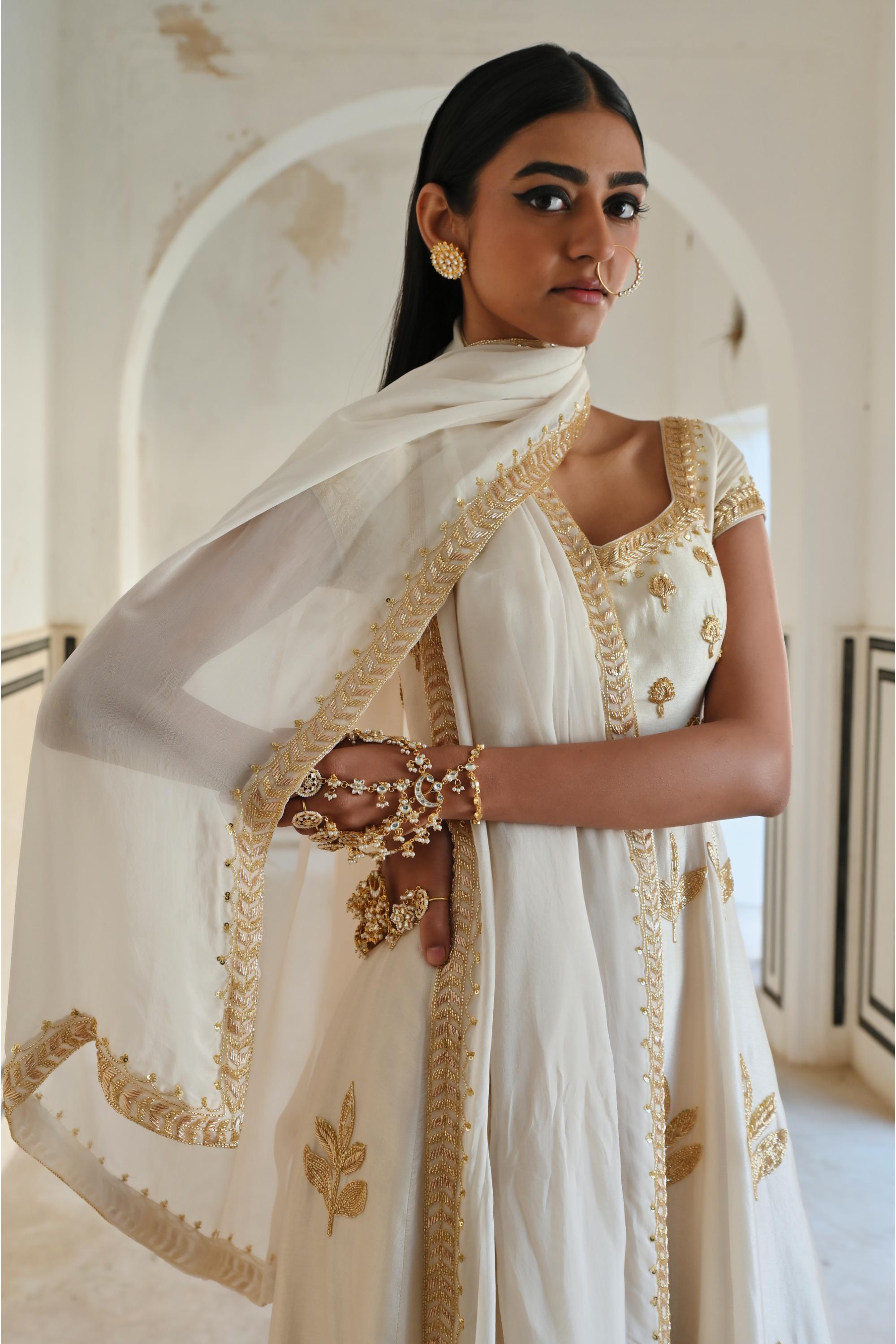 Step into elegance with the Ivory Rahi Cap-Length Anarkali with Dupatta. Featuring a graceful silhouette and timeless charm, this ensemble is perfect for weddings, festive celebrations, and special occasions.