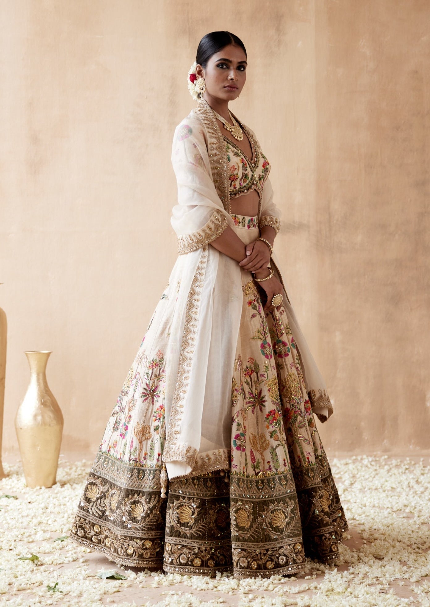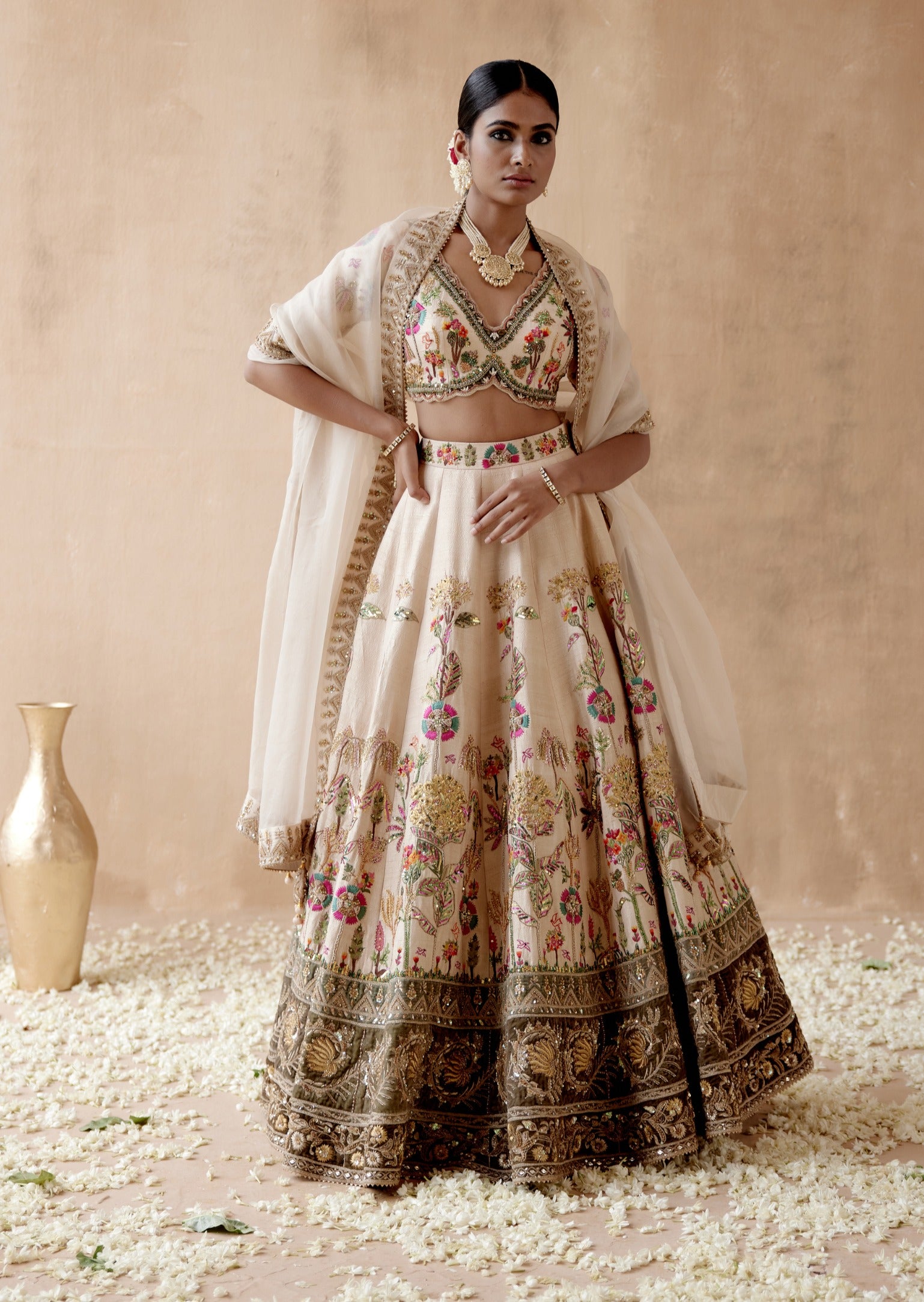 Indulge in luxury with our elegant ivory raw silk lehenga set, featuring intricate floral thread embroidery and rich velvet patchwork, all enhanced by a selection of sophisticated embellishments. This opulent ensemble is beautifully paired with a meticulously embroidered blouse and a matching dupatta, creating a refined and cohesive look. Perfect for weddings and special occasions, this lehenga set offers a timeless blend of texture and detail, ensuring you make a memorable impression.
