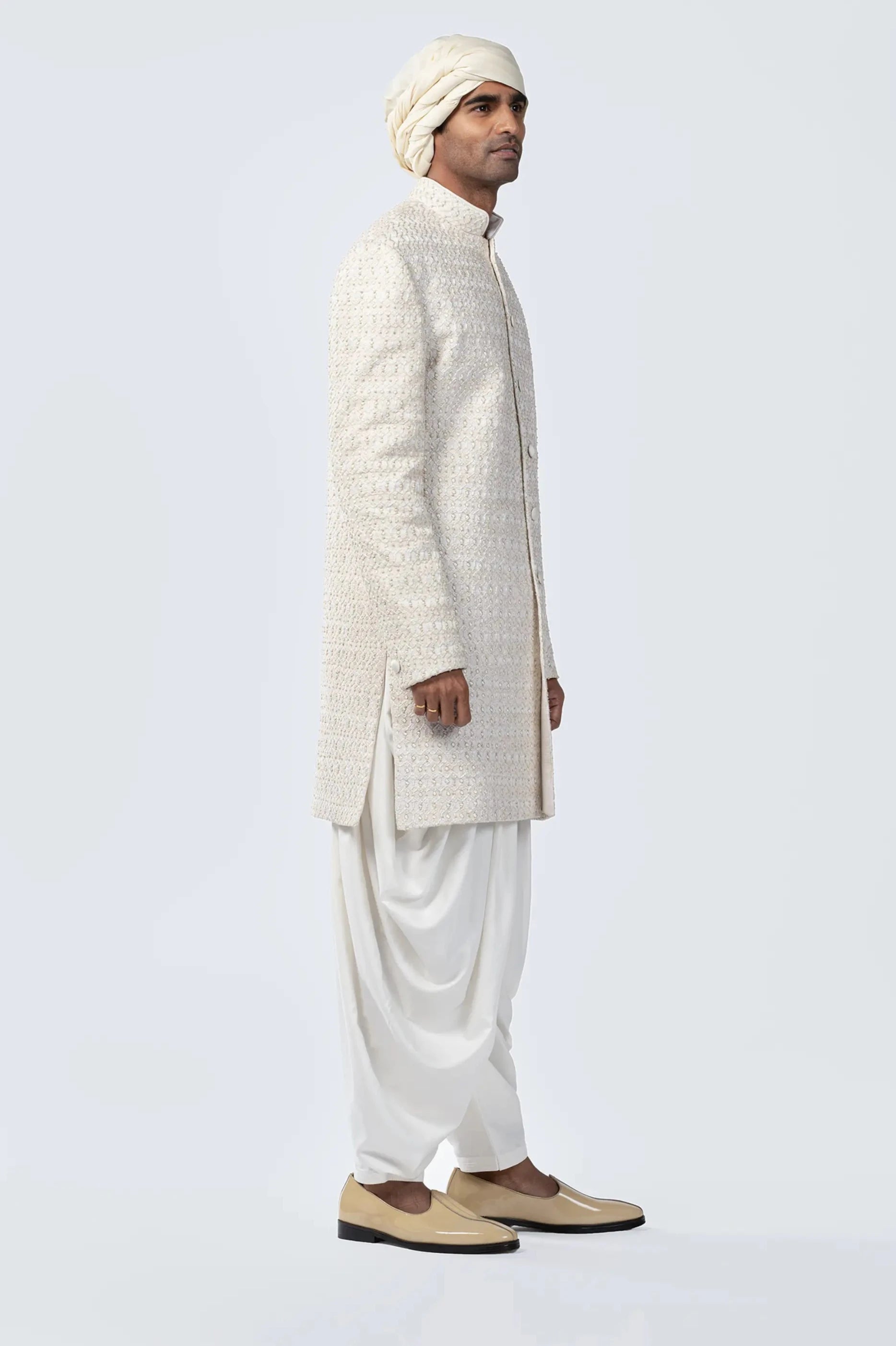 Step into refined sophistication with the Ivory Resham and French Knot Embroidered Sherwani, a luxurious blend of traditional artistry and modern style. The classic ivory base provides a timeless and versatile backdrop, while the intricate resham thread embroidery and delicate French knot detailing add texture and depth, making this sherwani a standout piece for weddings, receptions, or any formal occasion.