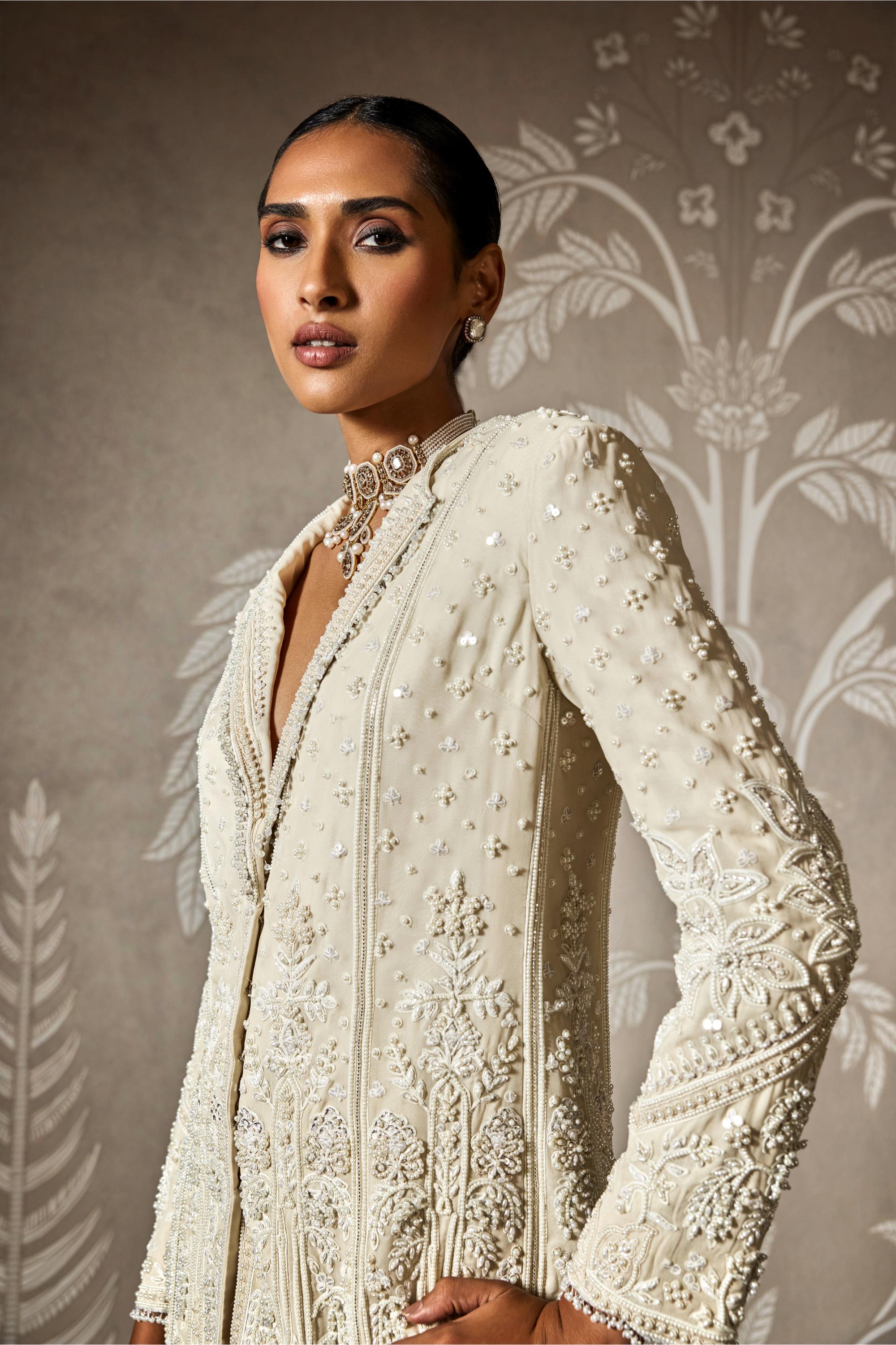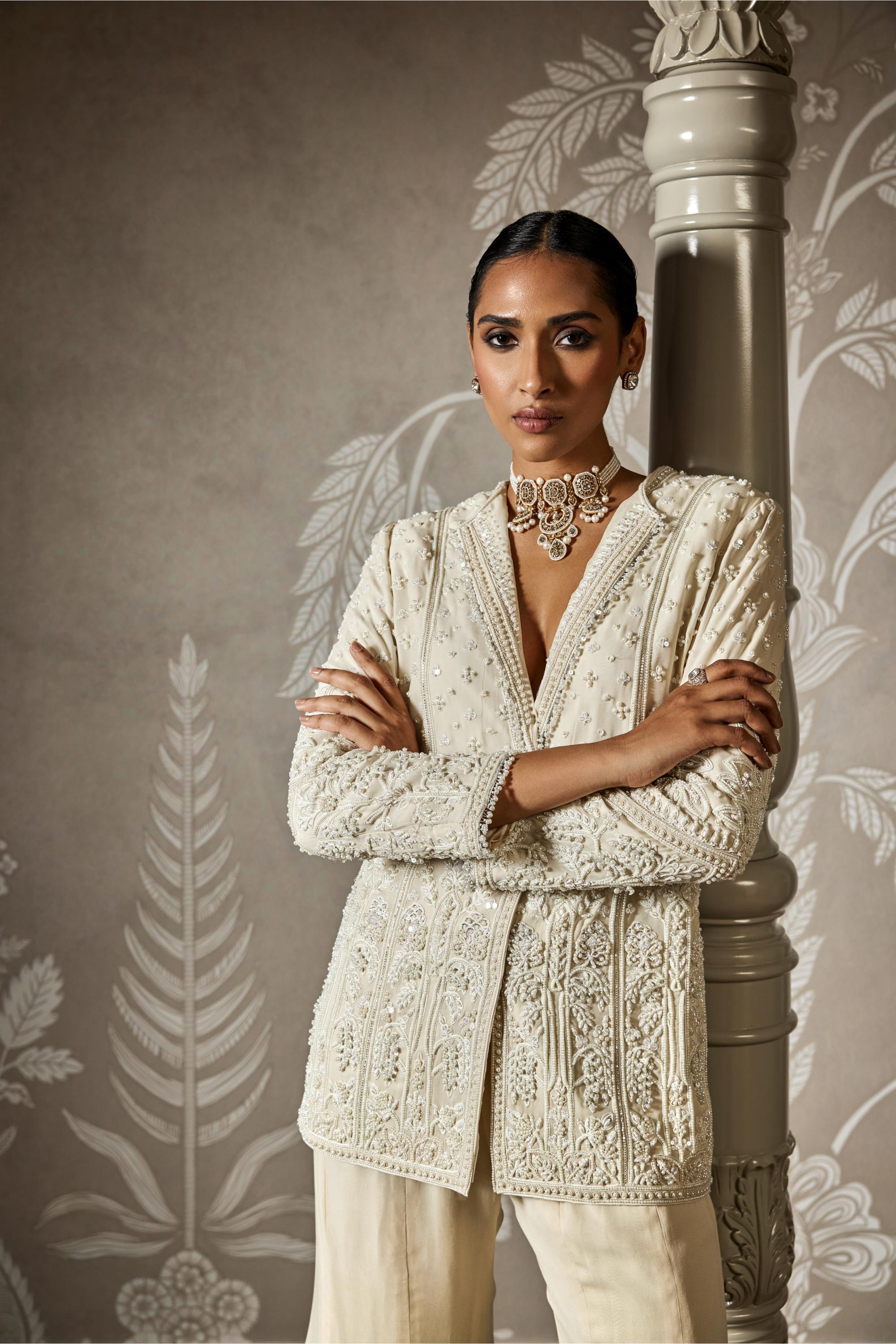 Graceful and contemporary, the Ivory Saira Zar Bano Jacket Set is a statement in understated luxury. Featuring a finely tailored longline jacket adorned with delicate embroidery, this set is crafted in a soft ivory palette that evokes elegance and serenity. Paired with complementing separates, it’s perfect for pre-wedding functions, receptions, or festive celebrations. Designed for the modern woman who values timeless style with a touch of regal flair.
