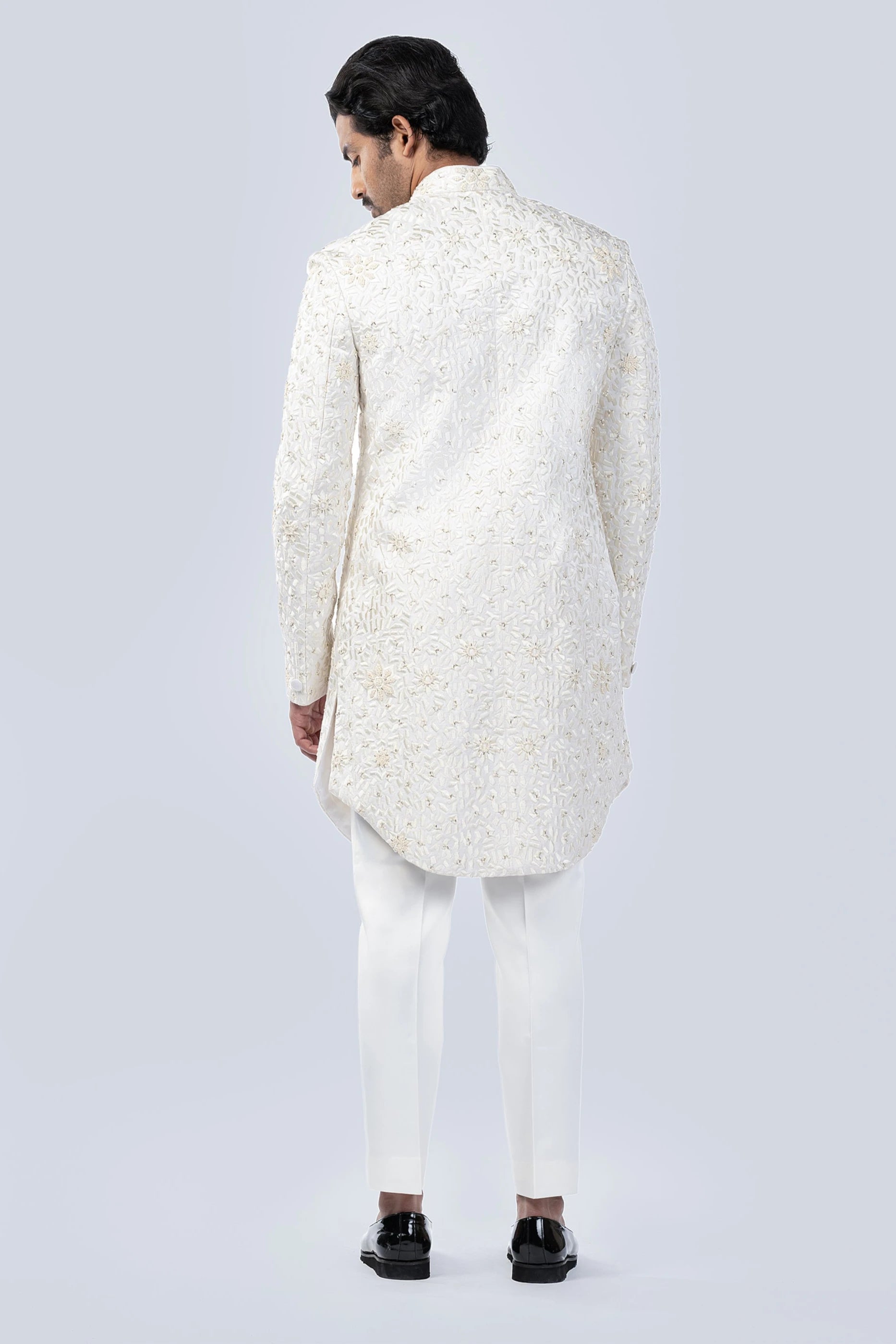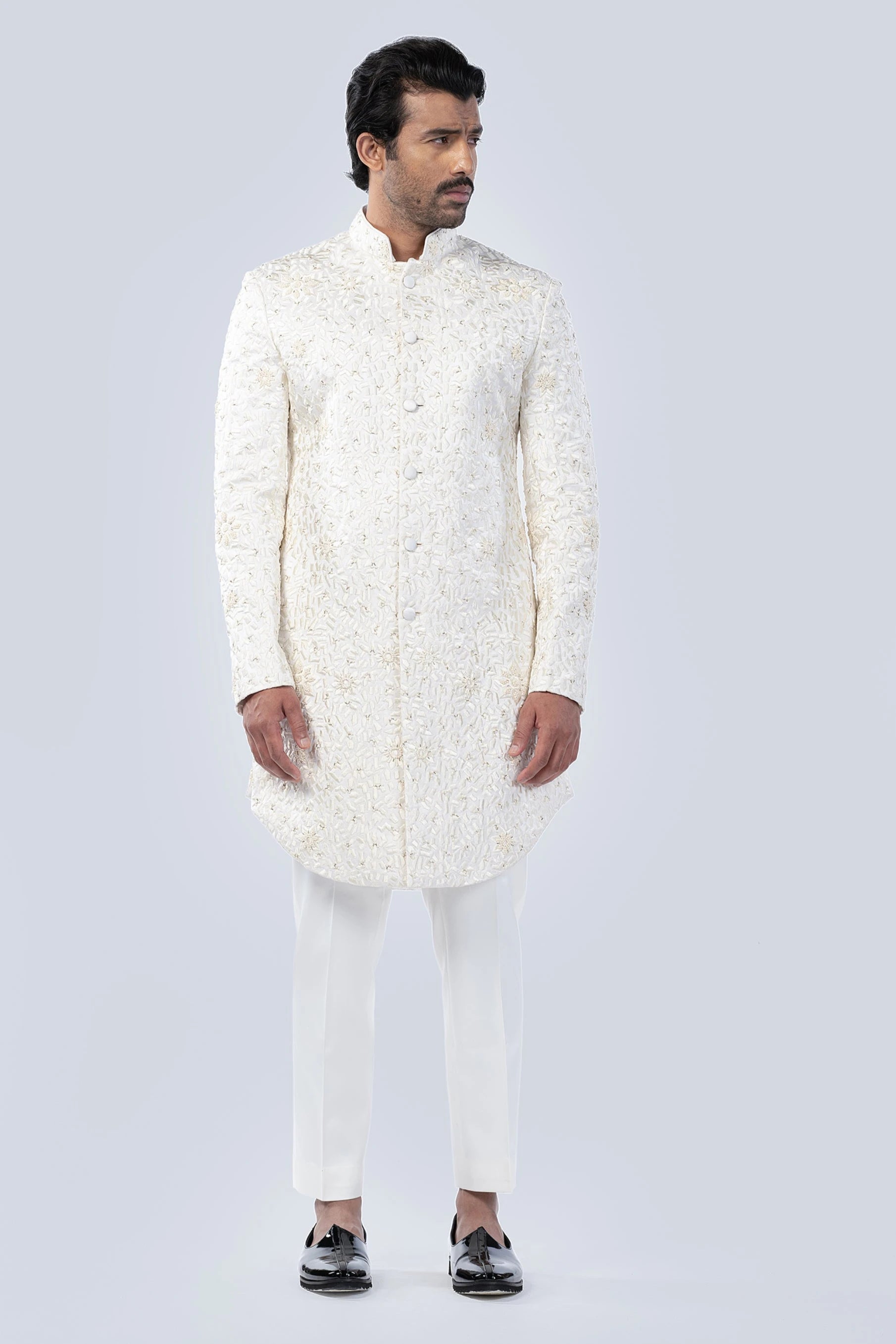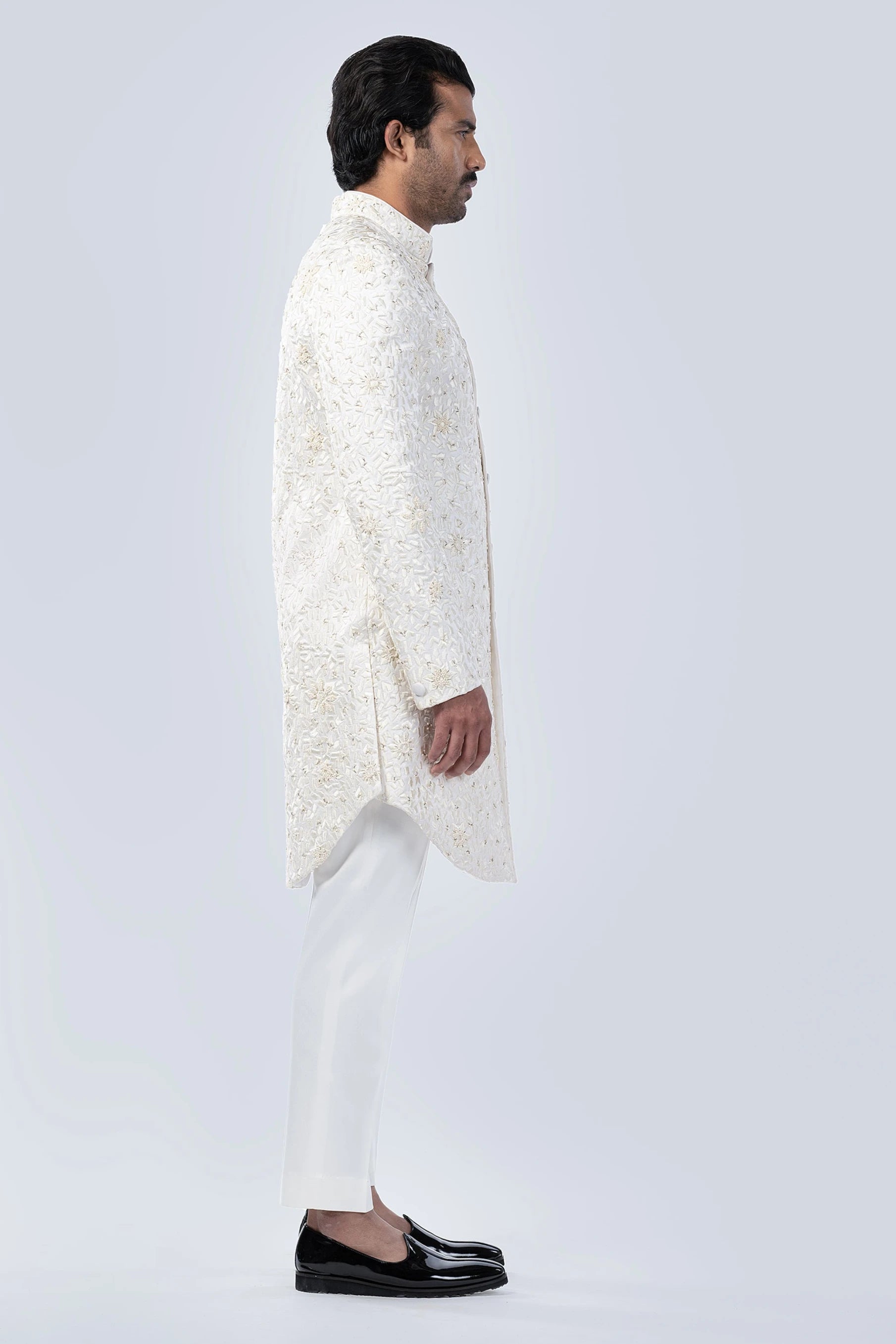 Ivory salli and frenchknot embroidered bucket cut sherwani