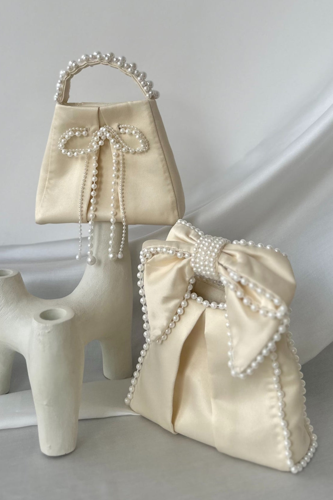 Elevate your accessory collection with our Ivory Satin Bag with Pearl Bow, a stunning blend of elegance and sophistication. Crafted from high-quality ivory satin, this luxurious handbag features a delicate pearl-encrusted bow, adding a touch of glamour and timeless charm. The soft ivory hue offers a versatile, understated beauty, making it an ideal choice for weddings, evening events, and other special occasions.