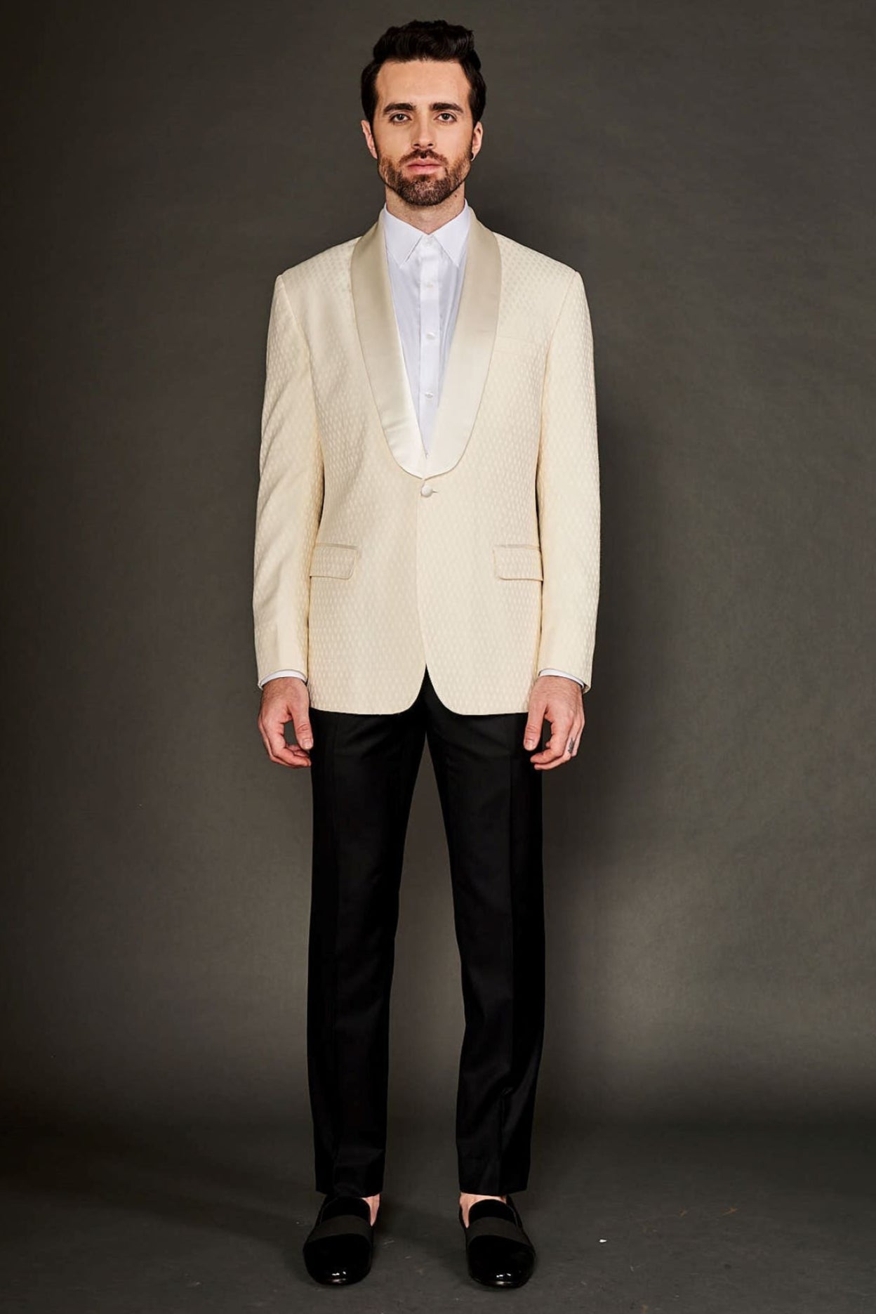 Step into timeless sophistication with this Ivory Shawl Lapel Tuxedo. Crafted from premium fabric, it features a smooth, elegant ivory hue and a classic shawl lapel for a refined, sleek silhouette. Perfect for weddings, galas, or black-tie events, this tuxedo offers a sophisticated yet modern appeal. Pair with a crisp white shirt and black accessories for an unforgettable look.