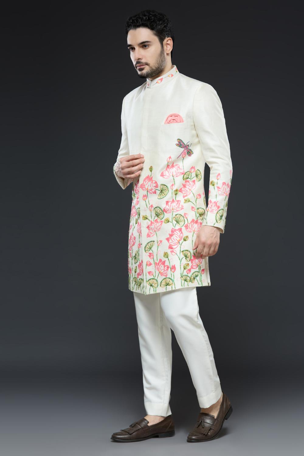Ivory sherwani with hand embroidery detailing and slim pant set