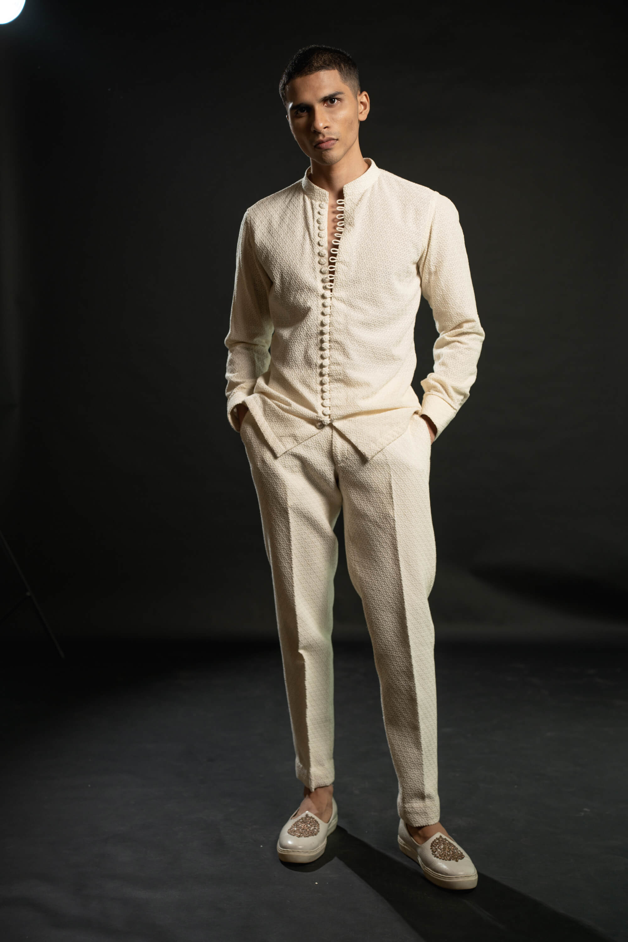 Elevate your style with this elegant ivory pant set crafted from luxurious georgette. Featuring intricate tonal thread embroidery and a shirt with detailed buttons this ensemble combines classic sophistication with modern flair. Tailored pants complete the look offering both comfort and refinement. Perfect for any formal occasion.