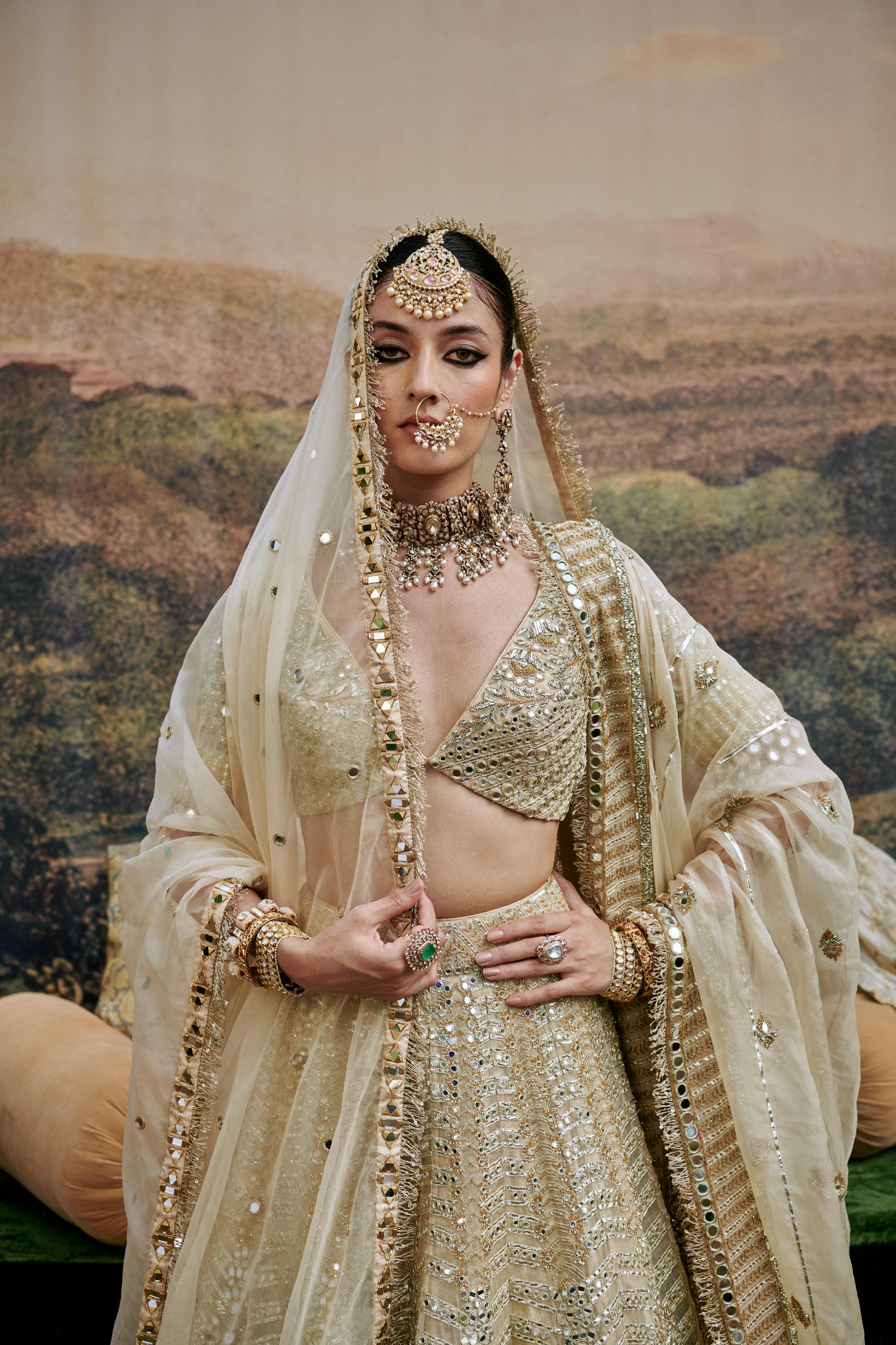 Components: 4 pieces (Lehenga, blouse, dupatta, veil)