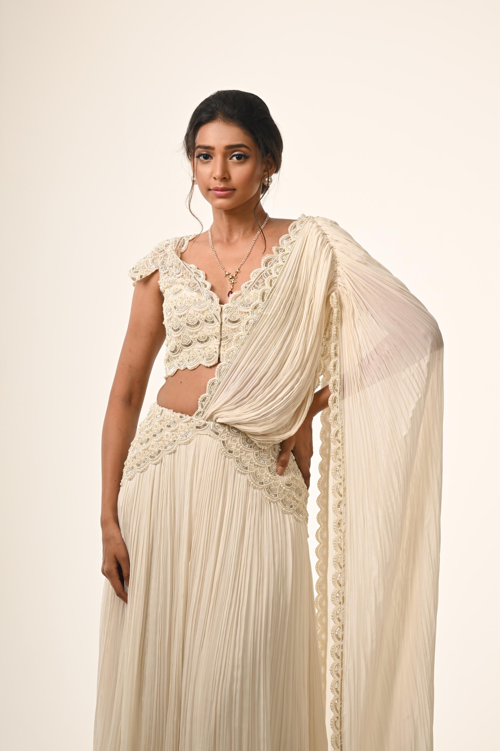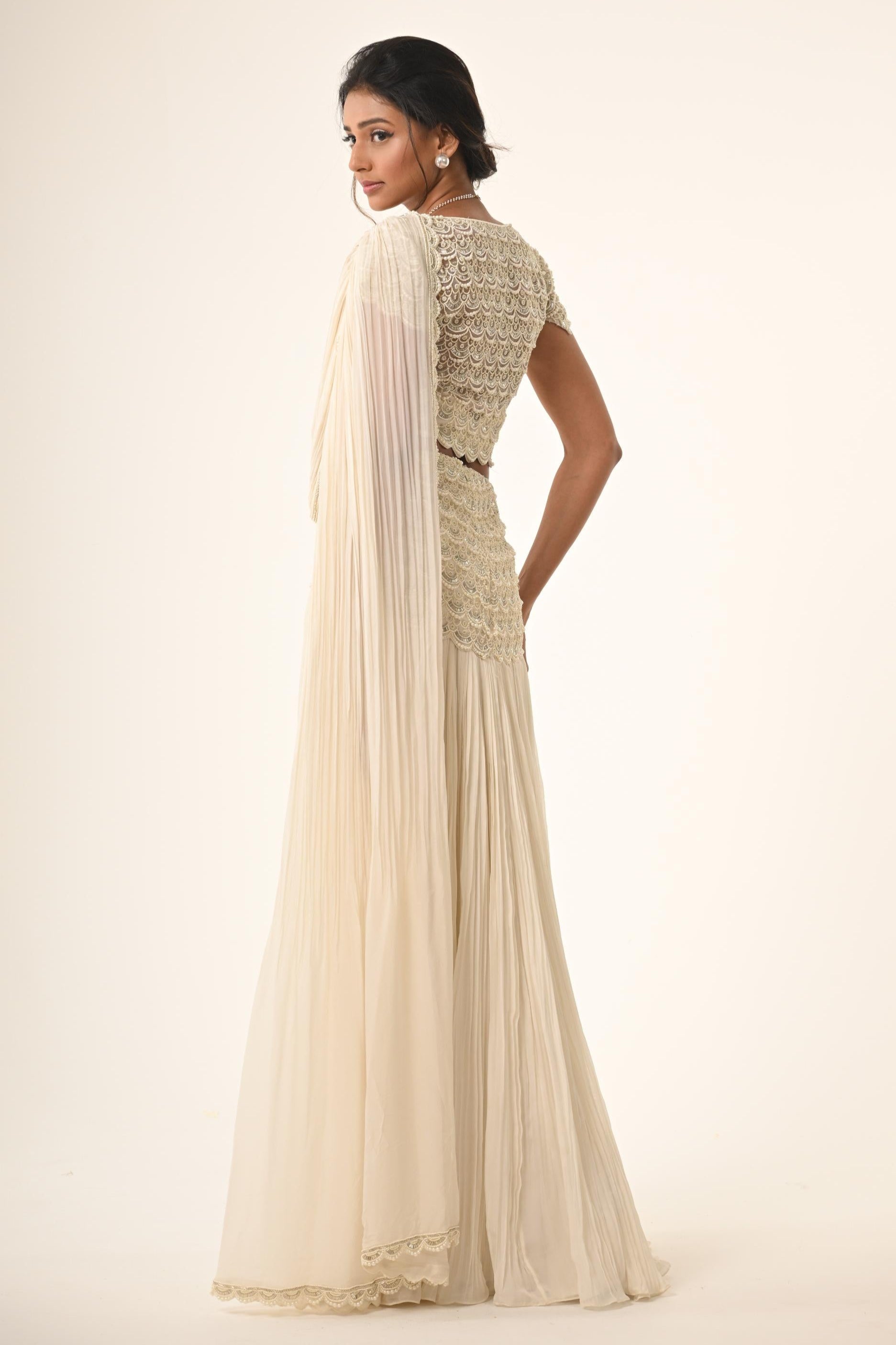 Graceful and timeless, the Ivory Skirt Set embodies understated luxury with a modern twist. Featuring a flowing skirt crafted in a soft, fluid fabric and paired with a matching blouse or cape, this ensemble radiates elegance in every detail. The serene ivory hue adds a touch of sophistication, making it ideal for engagement ceremonies, pre-wedding celebrations, or intimate festive occasions. Light, versatile, and effortlessly chic, the Ivory Skirt Set is a canvas for your personal style—perfect for the modern woman who embraces minimalism with meaning.