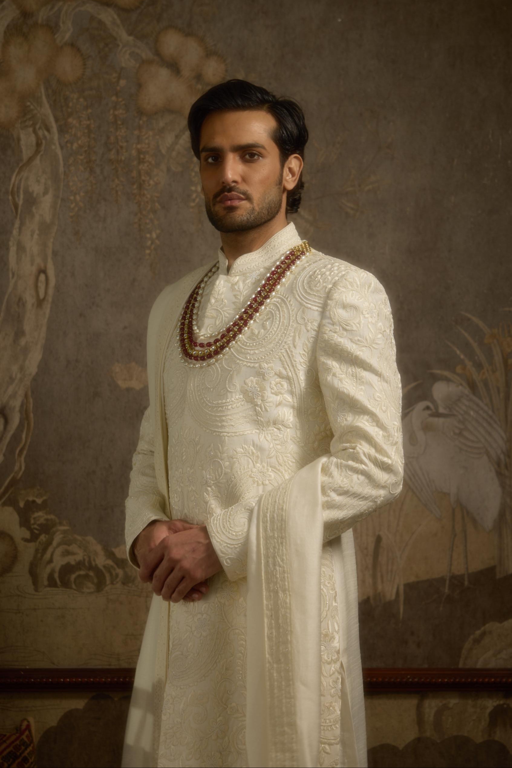 The Ivory Stardust Afreen Sherwani is an ode to divine beauty and timeless grace. Inspired by the name Afreen—meaning “most beautiful” or “praiseworthy”—this sherwani is crafted in a luminous ivory palette and delicately embellished with stardust-inspired detailing that glistens with subtle brilliance. Designed for the groom who values refinement over flamboyance, it speaks in a language of softness, precision, and celestial charm. Ideal for sacred vows, heritage ceremonies, or serene palace weddings, this sherwani reflects elegance that transcends trends—rooted in culture, elevated by light.