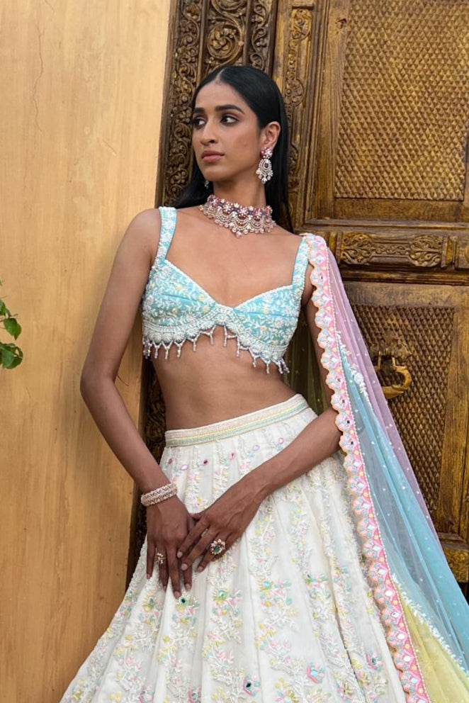 Timeless and ethereal, the Ivory Sumanjima Lehenga Set is a celebration of understated luxury and refined craftsmanship. Designed in a serene ivory palette, this lehenga features delicate embroidery and subtle embellishments that lend a soft, moonlit glow. The voluminous skirt is paired with a gracefully tailored blouse and a sheer dupatta, offering a silhouette that is both classic and contemporary. Ideal for weddings, receptions, or traditional celebrations, this ensemble is made for the woman who embodies quiet grace and effortless elegance.