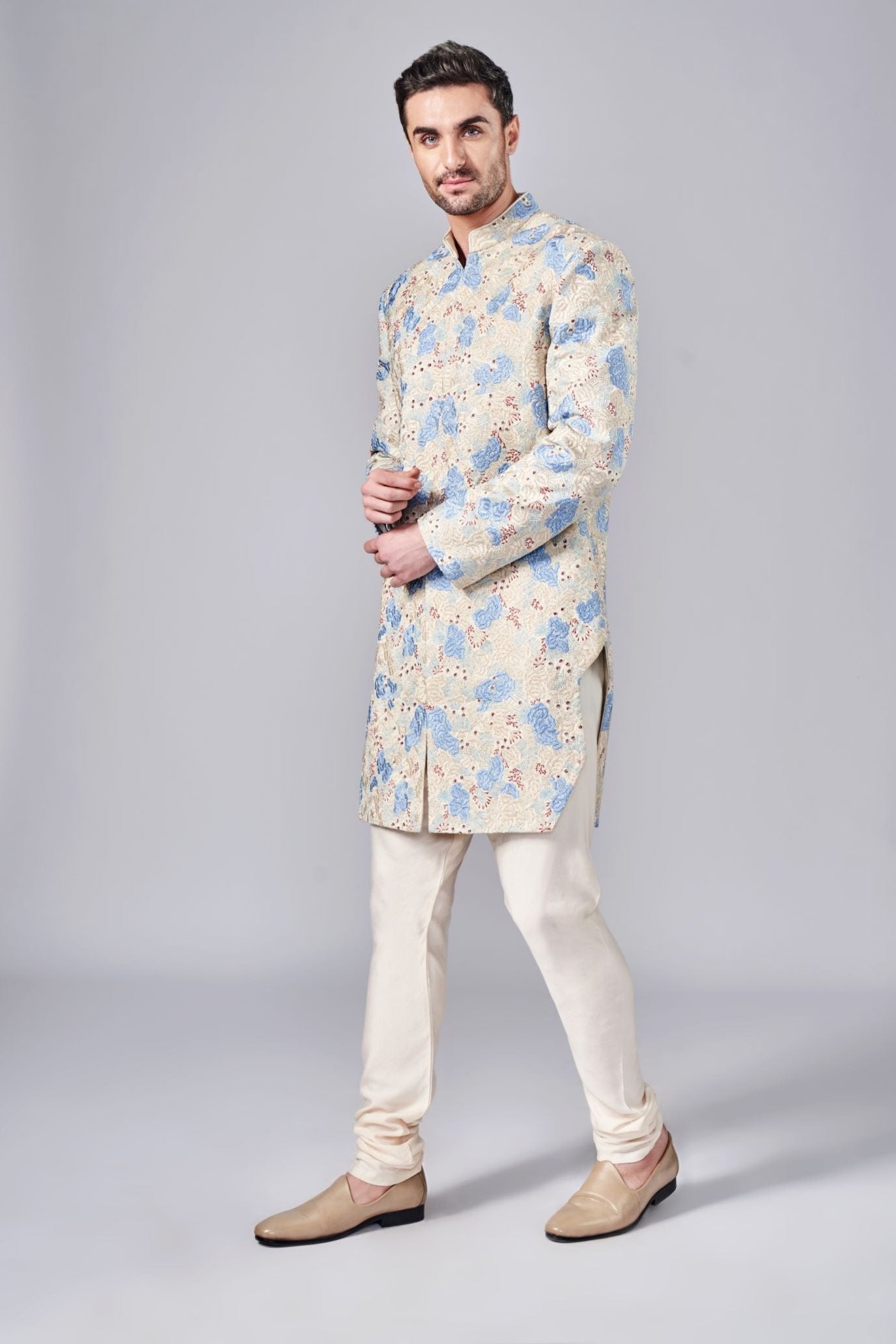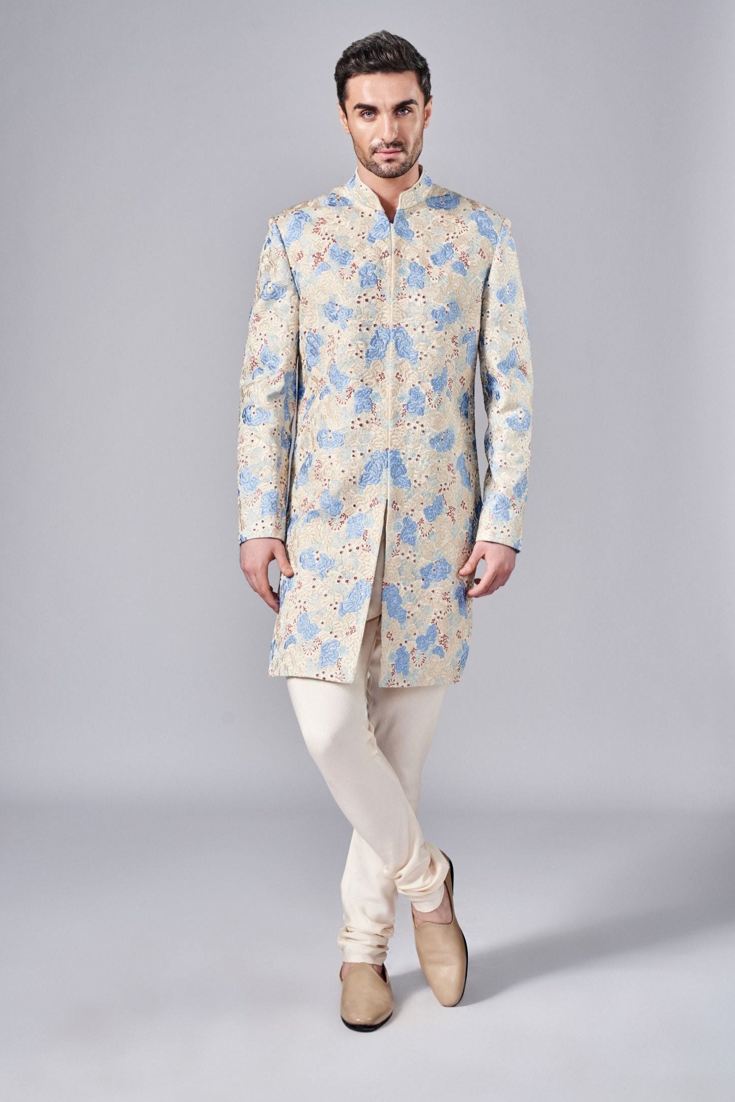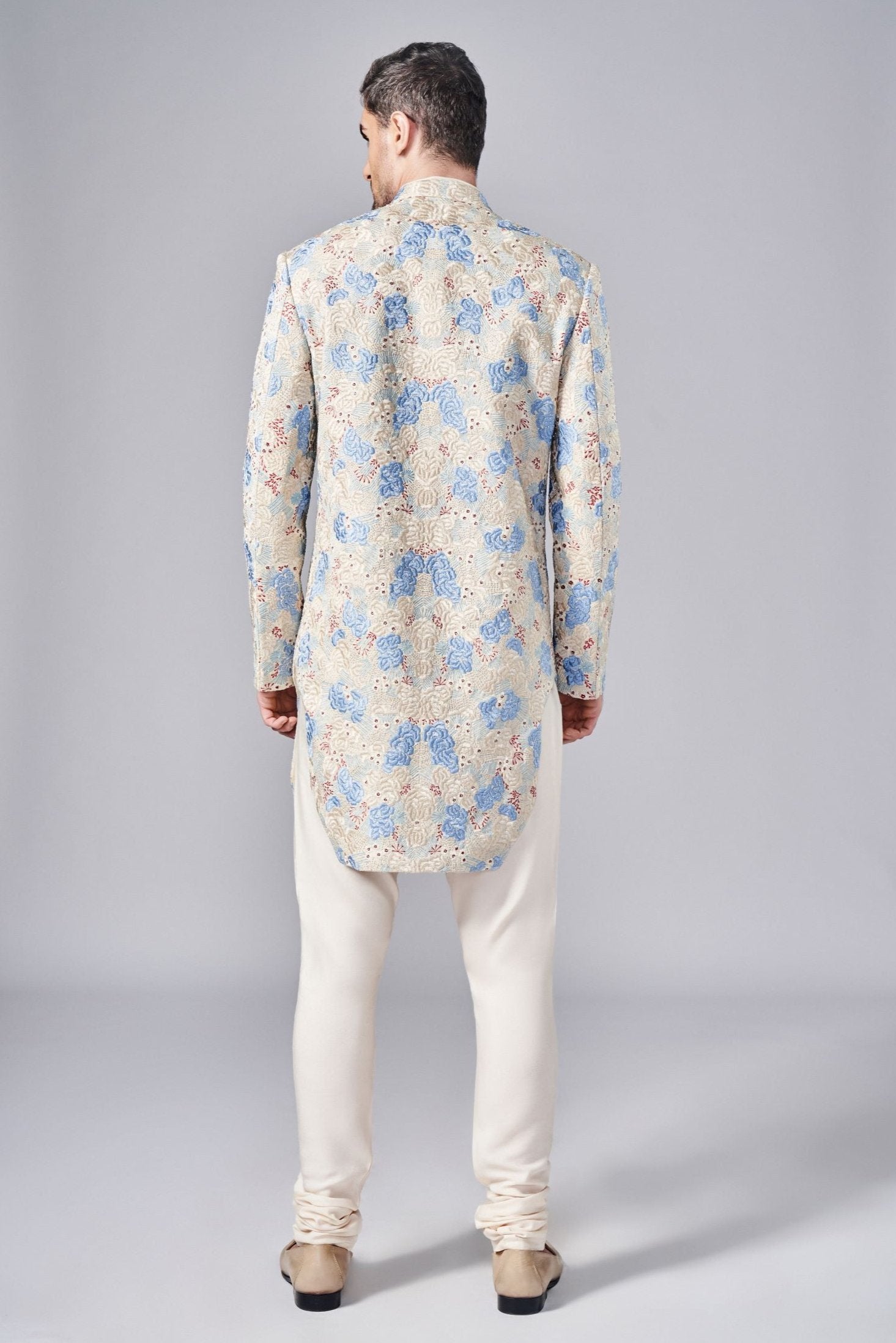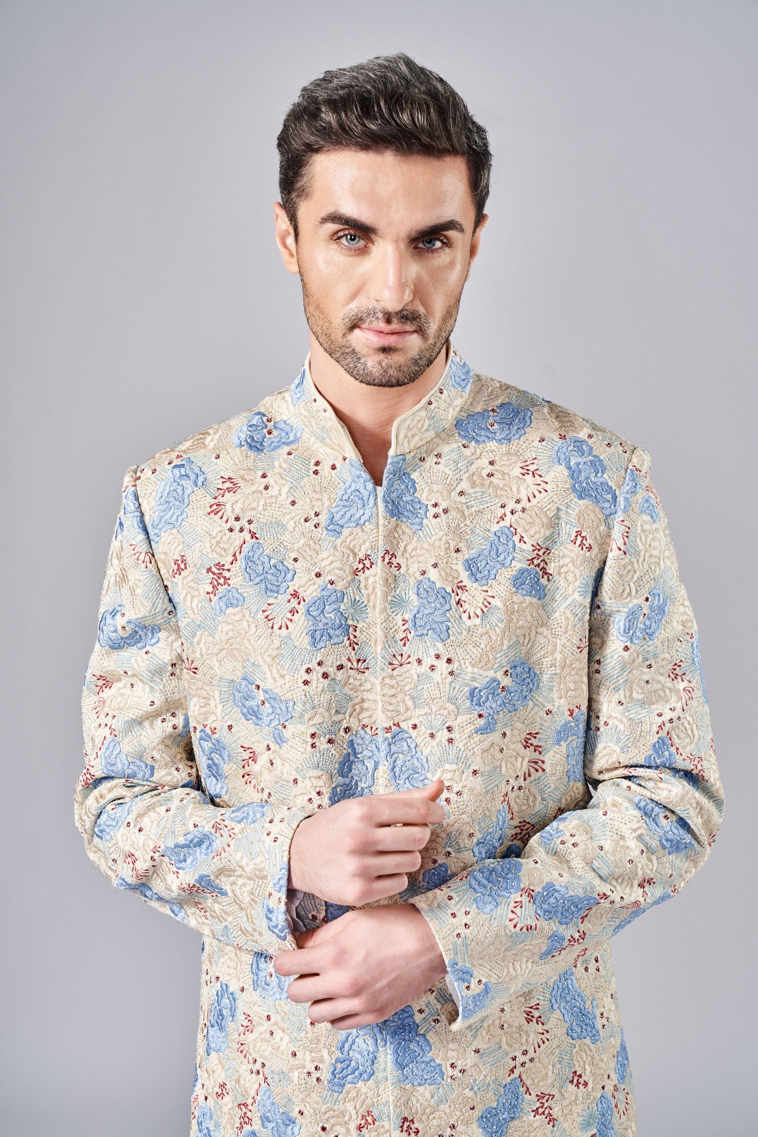 Embrace the epitome of luxury with the Ivory Thread Cut Dana All Over Embroidered Sherwani, a stunning piece that merges timeless tradition with contemporary flair. The soft, pristine ivory base provides a sophisticated foundation, while the intricate thread cut dana embroidery enhances the design with its fine detailing, creating a rich and textured finish.