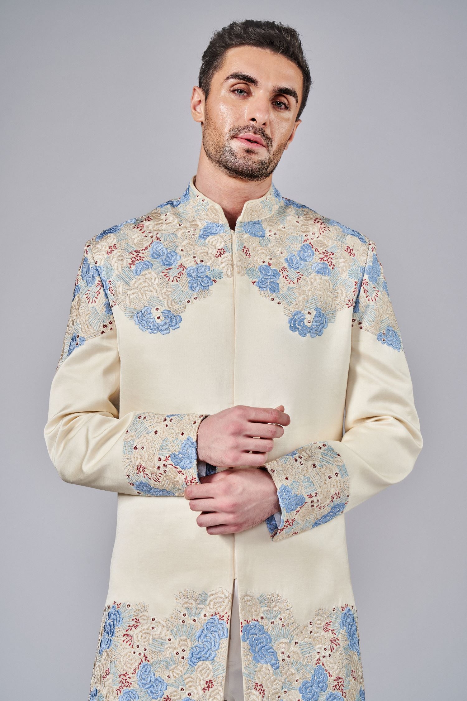 Exude sophistication and grace with the Ivory Thread Cut Dana Placement Embroidered Sherwani, a stunning blend of intricate craftsmanship and modern elegance. The soft ivory fabric serves as a timeless foundation, while the carefully placed thread cut dana embroidery adds depth and texture, creating a beautifully detailed design. This sherwani is perfect for weddings, receptions, or any special occasion where you wish to make an unforgettable impression.