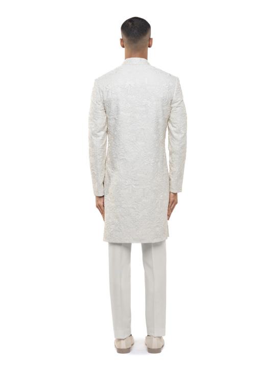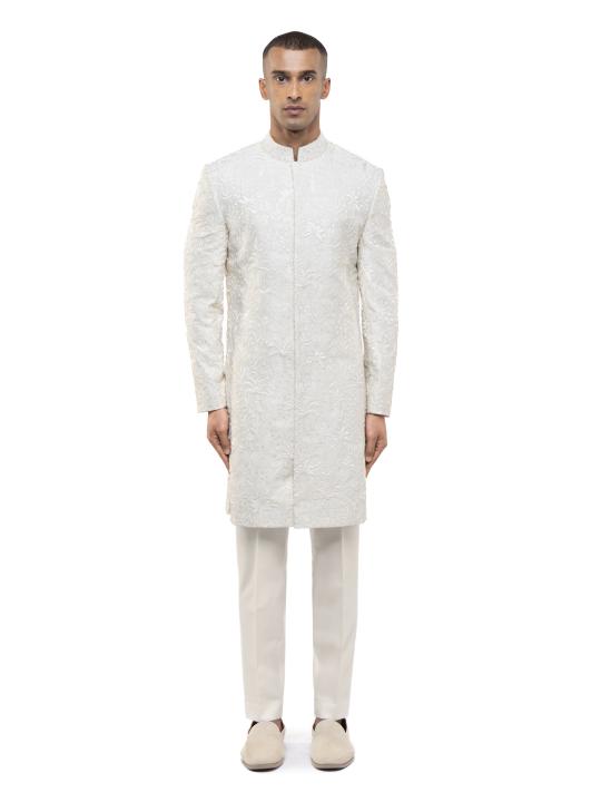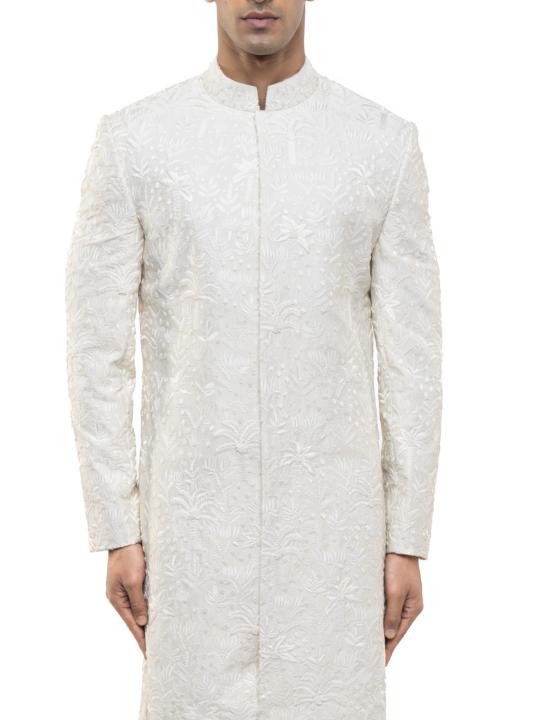 Fresh and elegant, this Ivory Silk Tropical Embroidery Sherwani Set features intricate tropical-inspired embroidery that adds a vibrant yet refined touch. Crafted from luxurious silk, it includes a stand collar, concealed placket, and sophisticated Mother of Pearl buttons. The regular fit and straight hem offer a classic silhouette-perfect for weddings, festive occasions, and stylish celebrations.