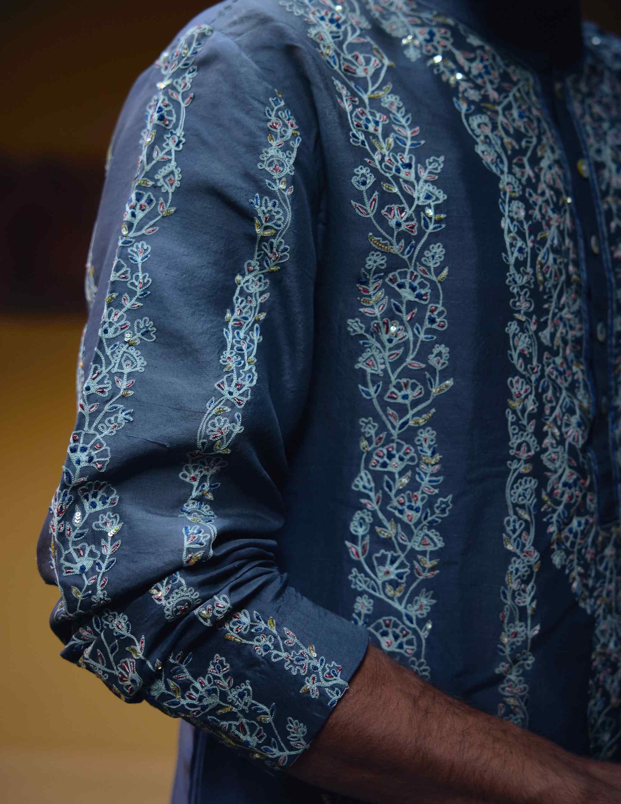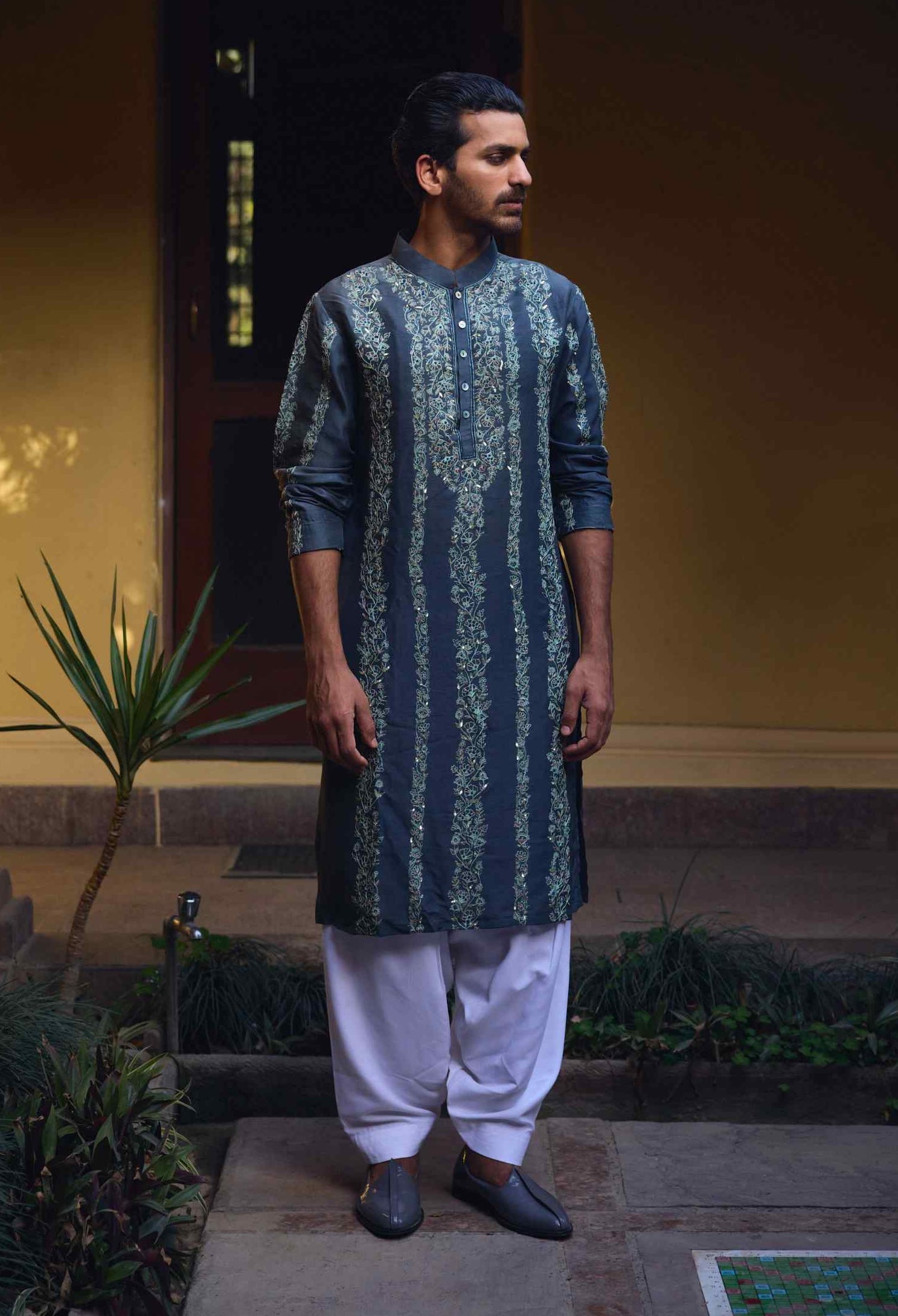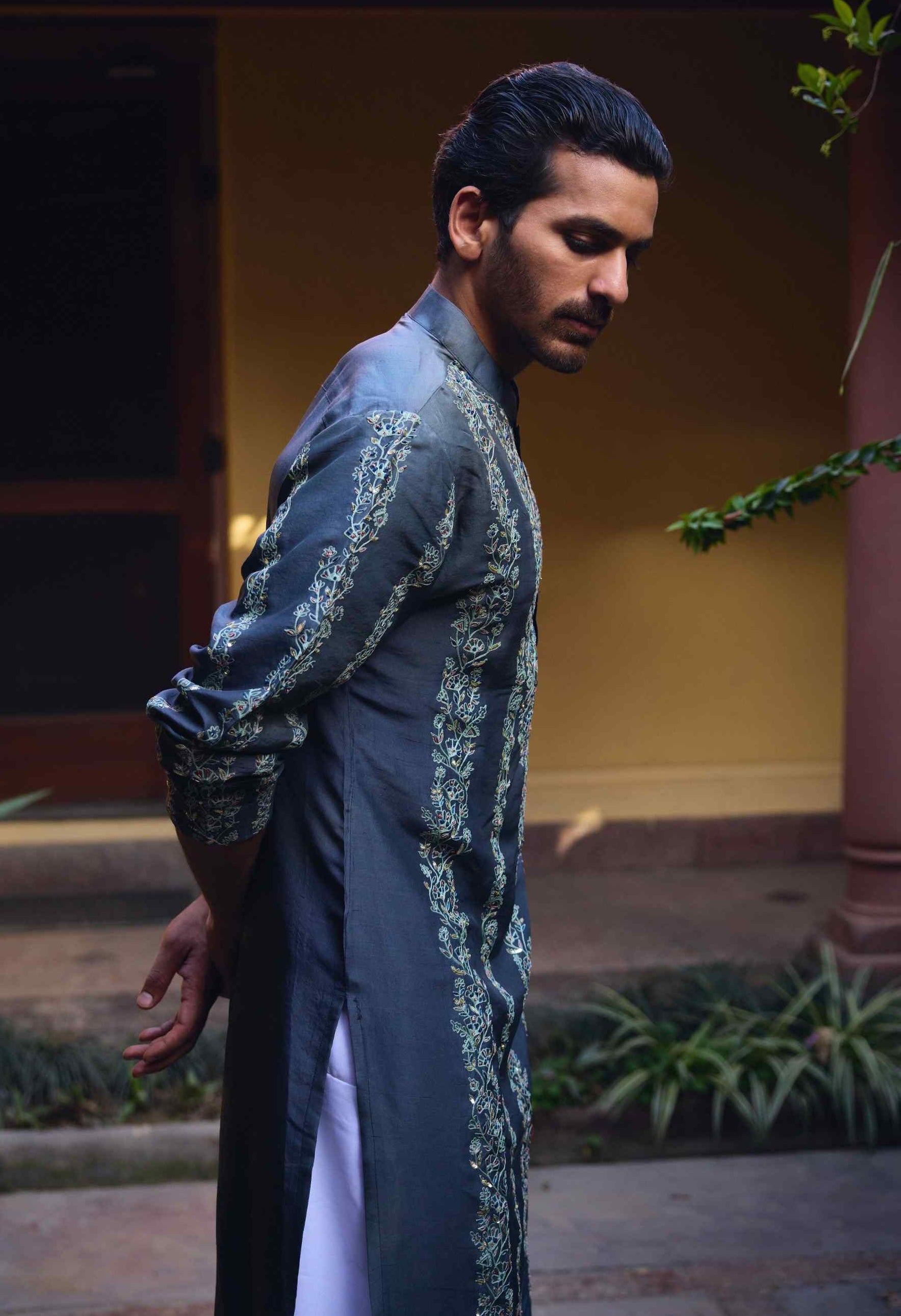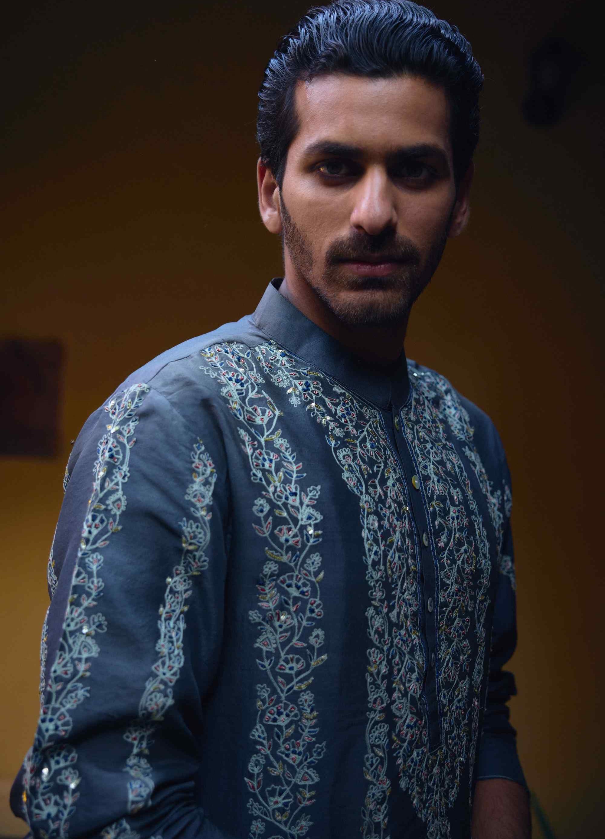 Elevate your festive style with the Jaisalmer Kurta in Gray Slate. Made from luxurious cotton silk, this kurta ensures comfort and sophistication for Haldi, Mehndi, or Sangeet celebrations. Featuring intricate hand embroidery, it adds elegance and texture, perfect for both day and evening events. Paired with an off-white salwar for a classic contrast, this kurta is ideal for grooms seeking a refined, contemporary look. Complete the ensemble with traditional juttis or modern footwear.