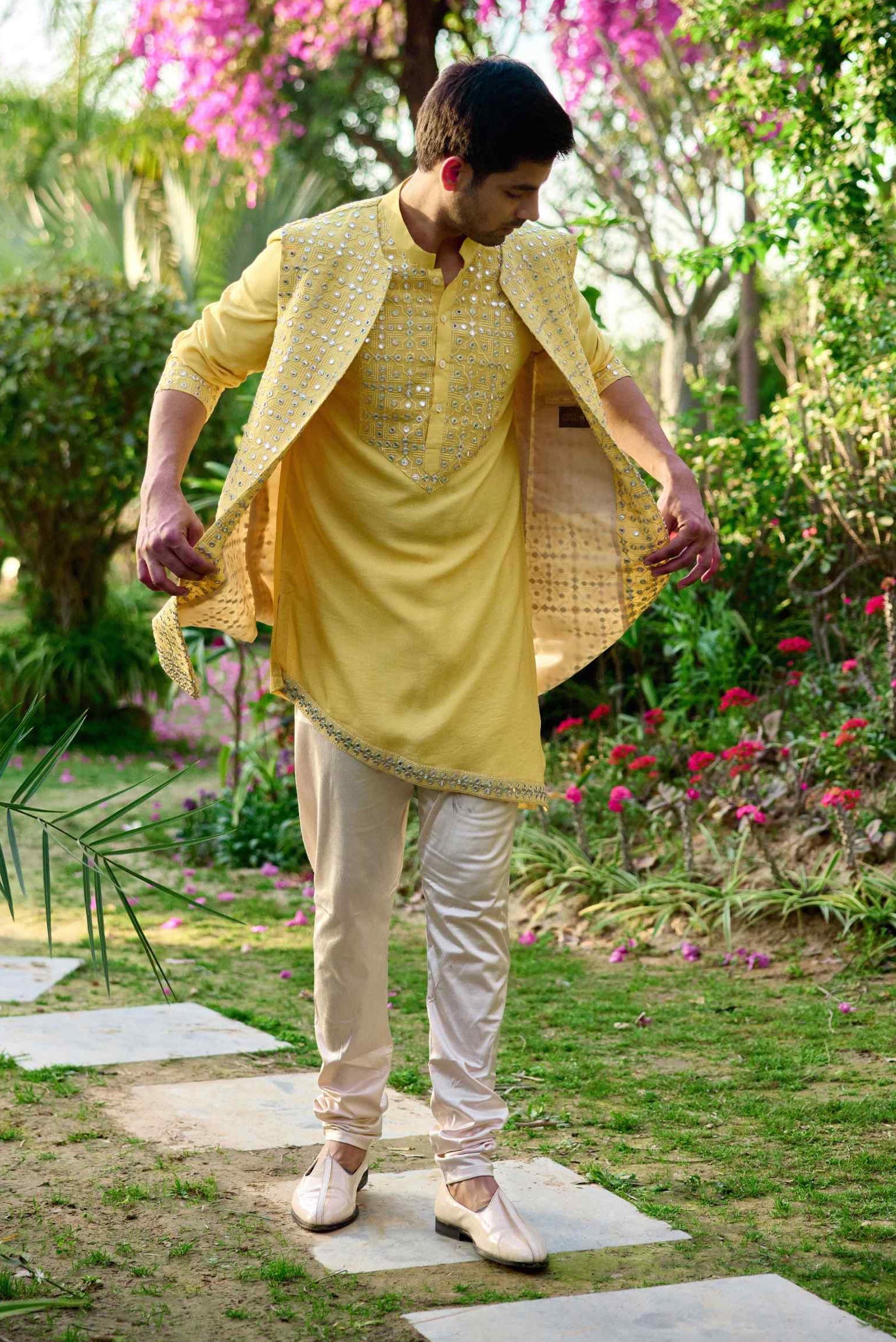 Elevate your celebration with the Juna Mahal Bandi Set, featuring a sunset yellow front-open Nehru jacket and matching kurta, both adorned with intricate mirror and thread embroidery. Paired with a classic off-white churidar, this ensemble offers a vibrant and sophisticated look, perfect for haldi, mehndi, or sangeet ceremonies.