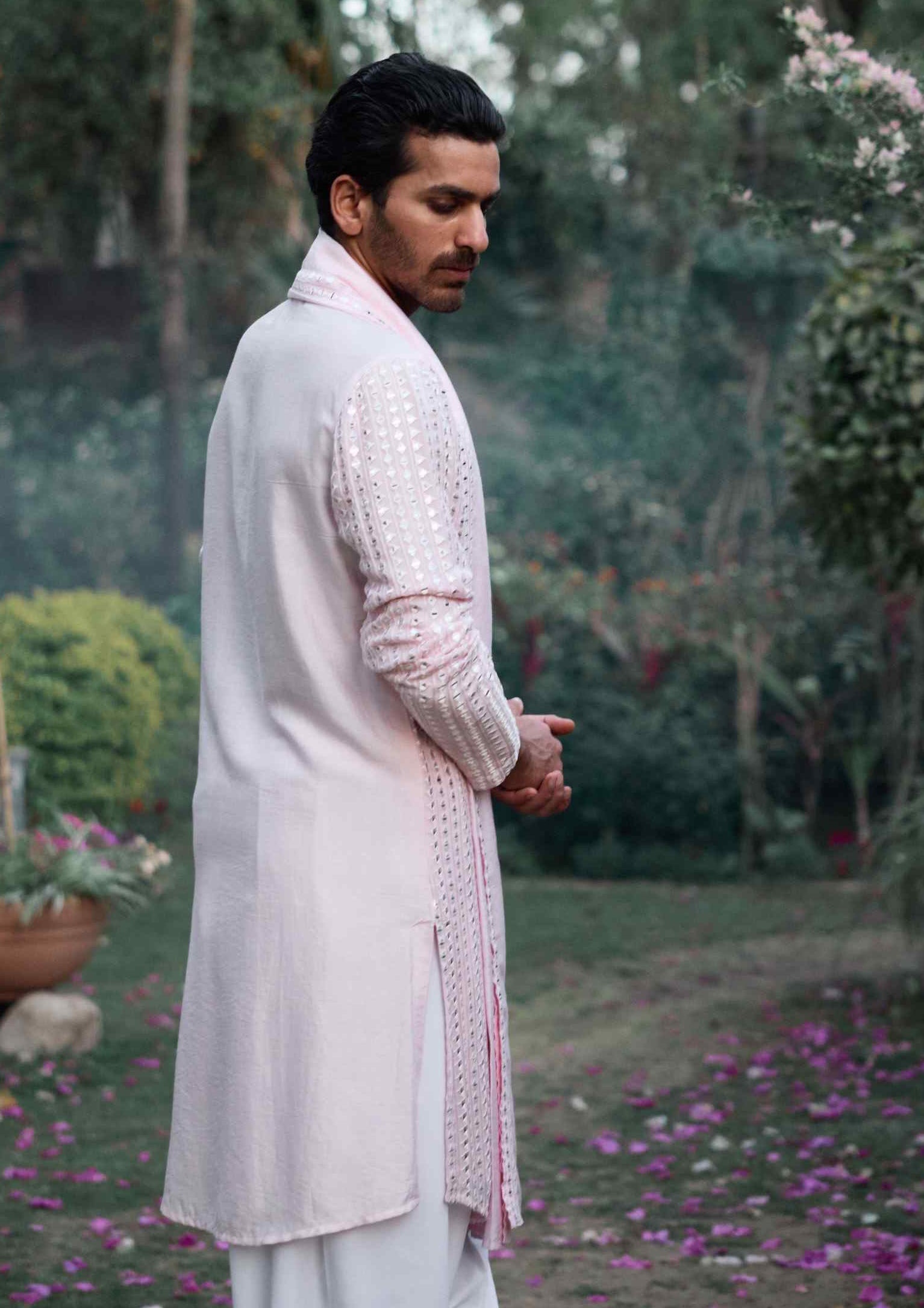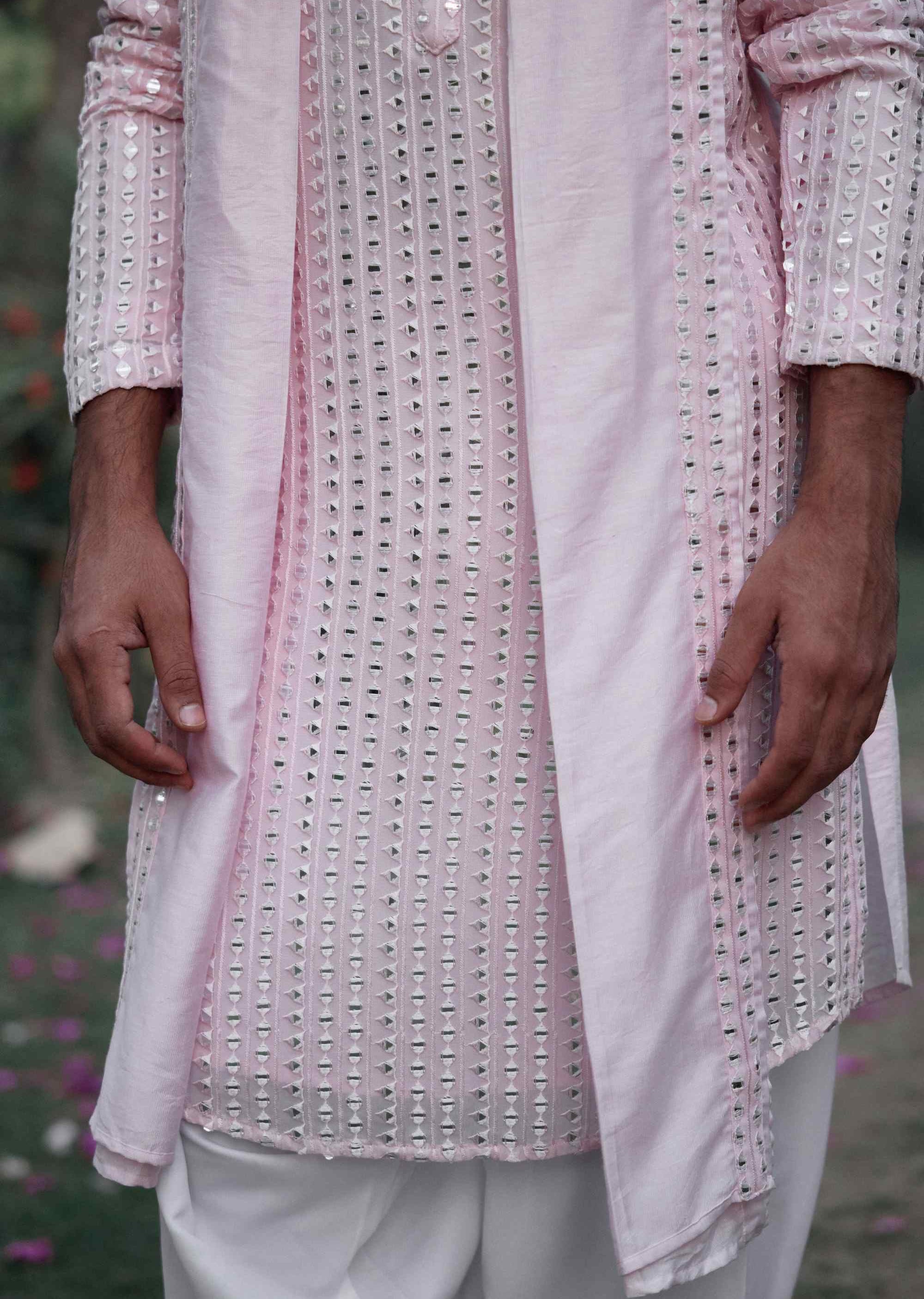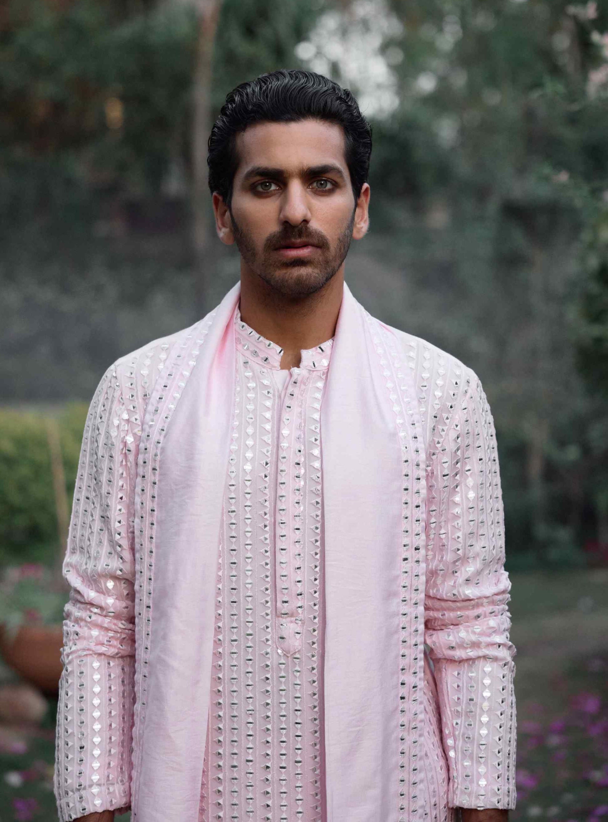 Elevate your ceremonial attire with the Jalalgarh Kurta, beautifully crafted in a soft powder pink shade. Made from a blend of viscose cotton silk and georgette, this kurta showcases delicate machine thread embroidery, adding a touch of sophistication and elegance. Perfect for haldi, mehndi, or sangeet ceremonies, the Jalalgarh Kurta is paired with an ivory salwar, creating a harmonious and stylish ensemble that combines contemporary flair with traditional charm. The refined embroidery and luxurious fabric make this outfit a standout choice for your special celebrations.