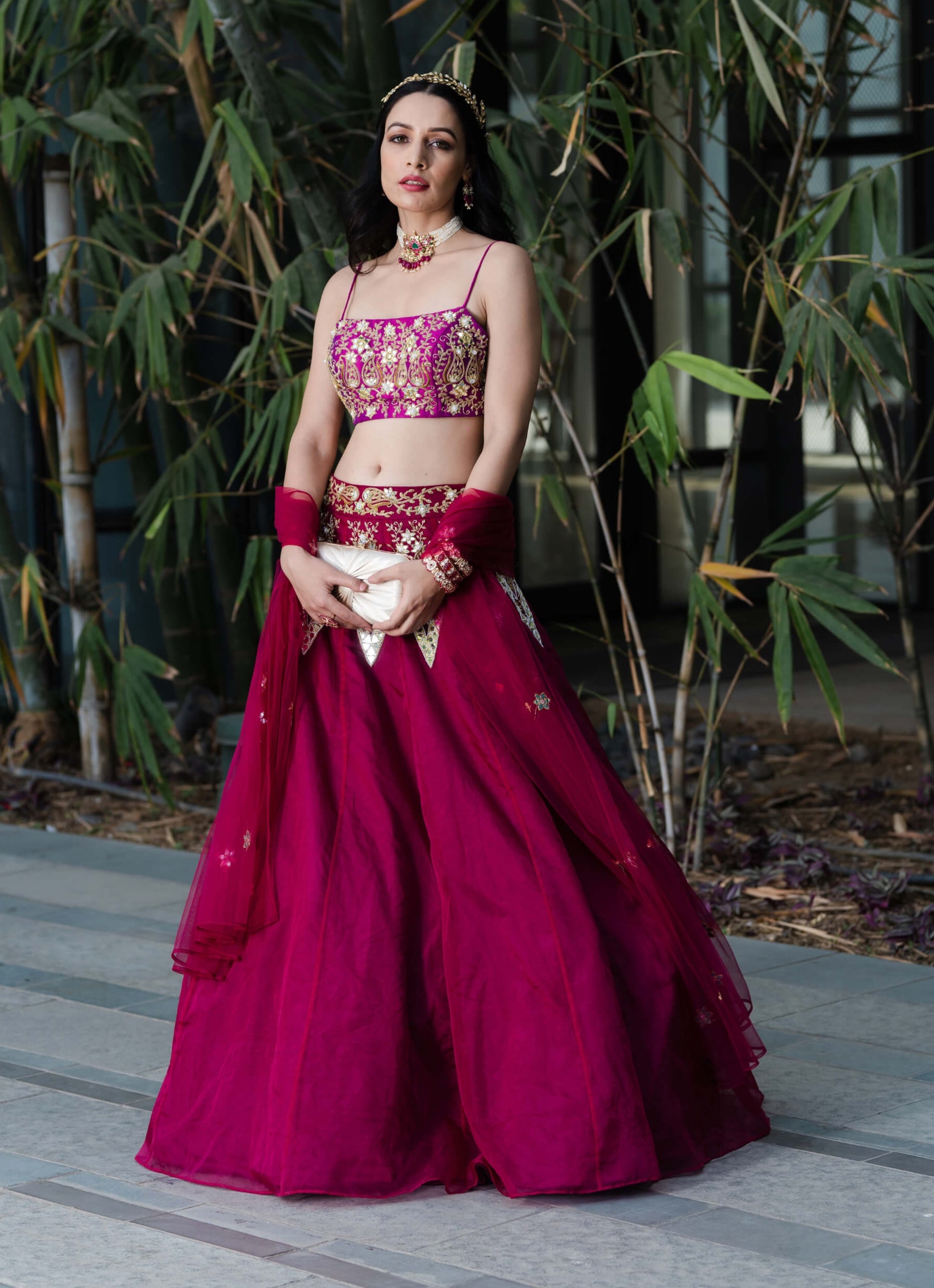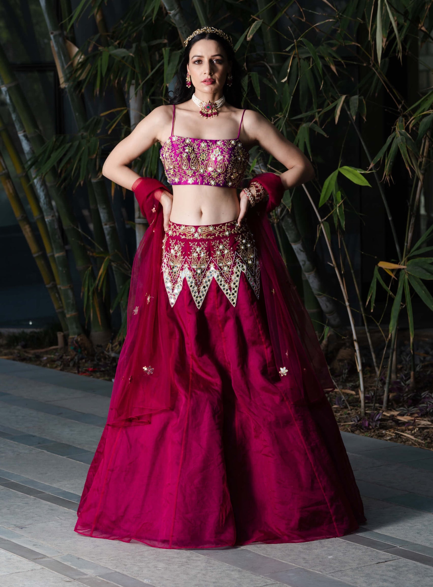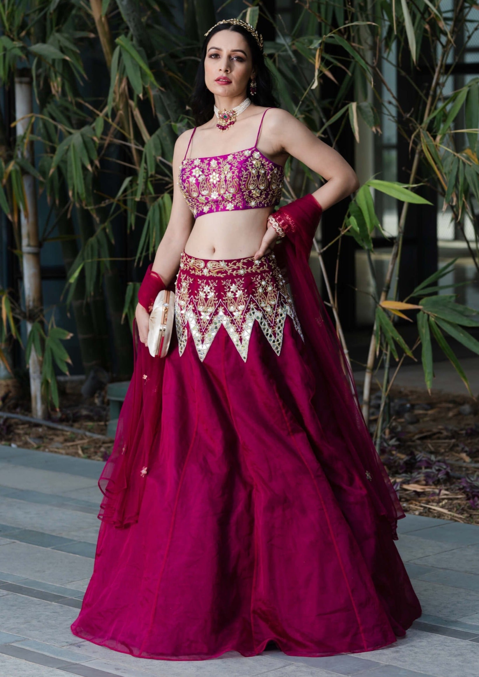Elevate your style with the magenta cotton silk embroidered blouse paired elegantly with a silk organza lehenga adorned with embroidery details, and complemented by an embroidered net dupatta. The blouse, crafted from luxurious cotton silk, features intricate embroidery that adds a touch of elegance and sophistication. The silk organza lehenga enhances the ensemble with its delicate texture and detailed embroidery, offering a graceful silhouette. Complete your look with the embroidered net dupatta, which adds a layer of ethereal charm and completes the outfit with finesse. Perfect for weddings and special occasions, this ensemble combines traditional craftsmanship with modern aesthetics, ensuring you exude grace and timeless allure with every wear.