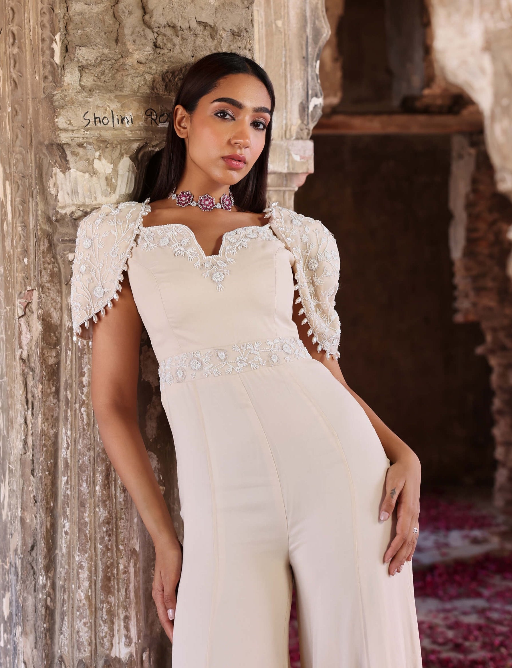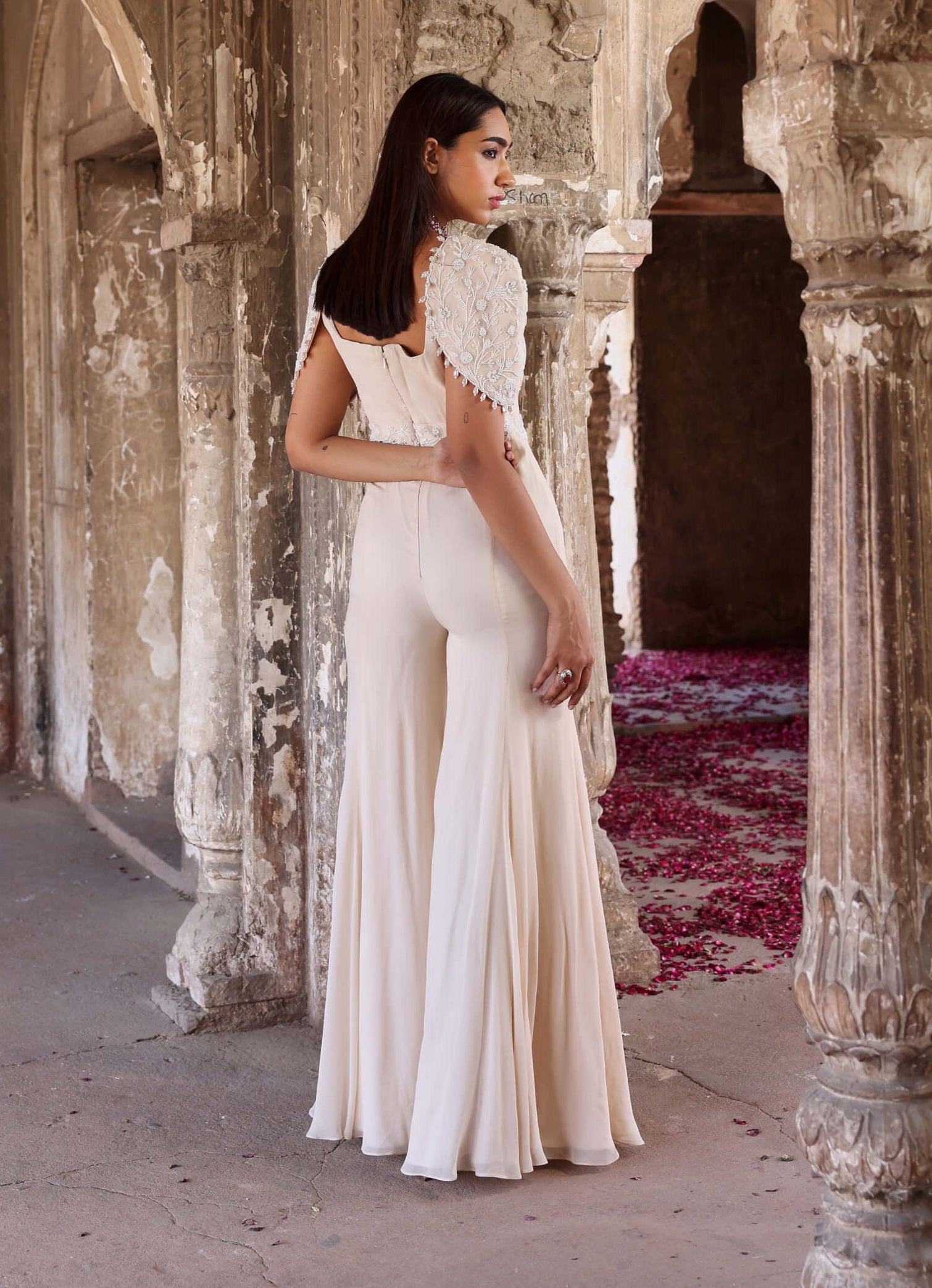 The Janvi ivory jumpsuit features a dramatic flared bottom and a beautifully embellished bodice, accentuated by stylish shoulder pads for a structured and refined silhouette. This stunning piece effortlessly merges modern sophistication with glamorous detailing, making it an ideal choice for special occasions and upscale events. Elevate your look with this eye-catching jumpsuit, designed to leave a lasting impression with its blend of elegance and bold style.