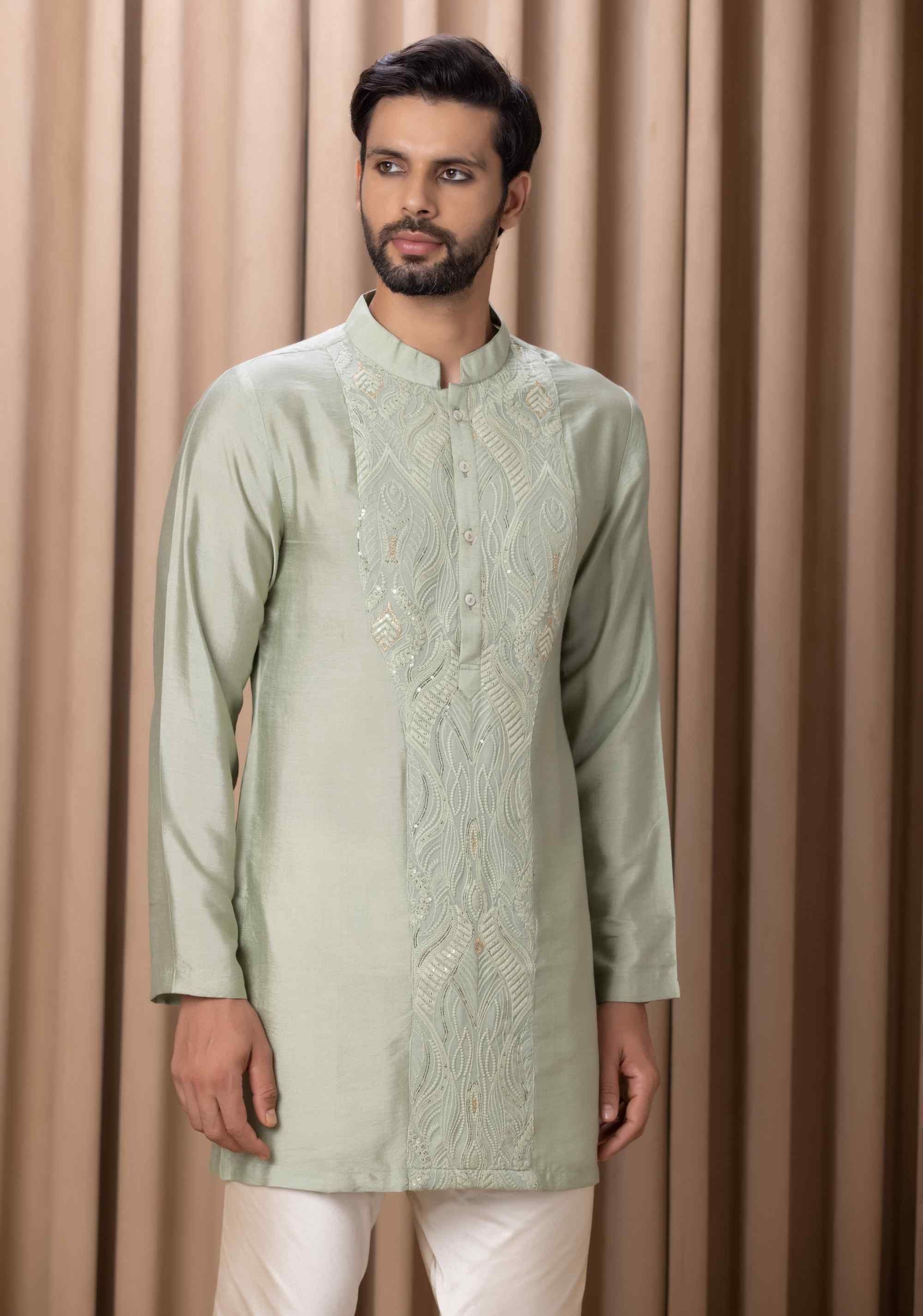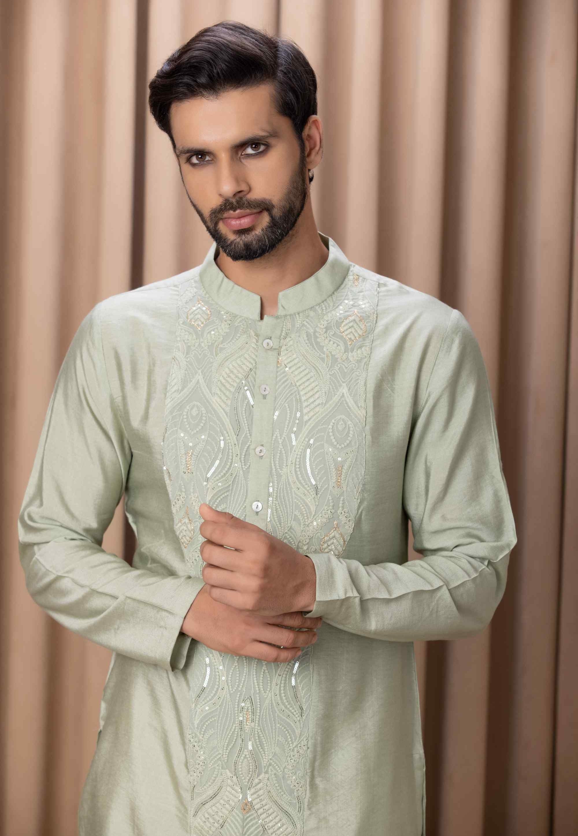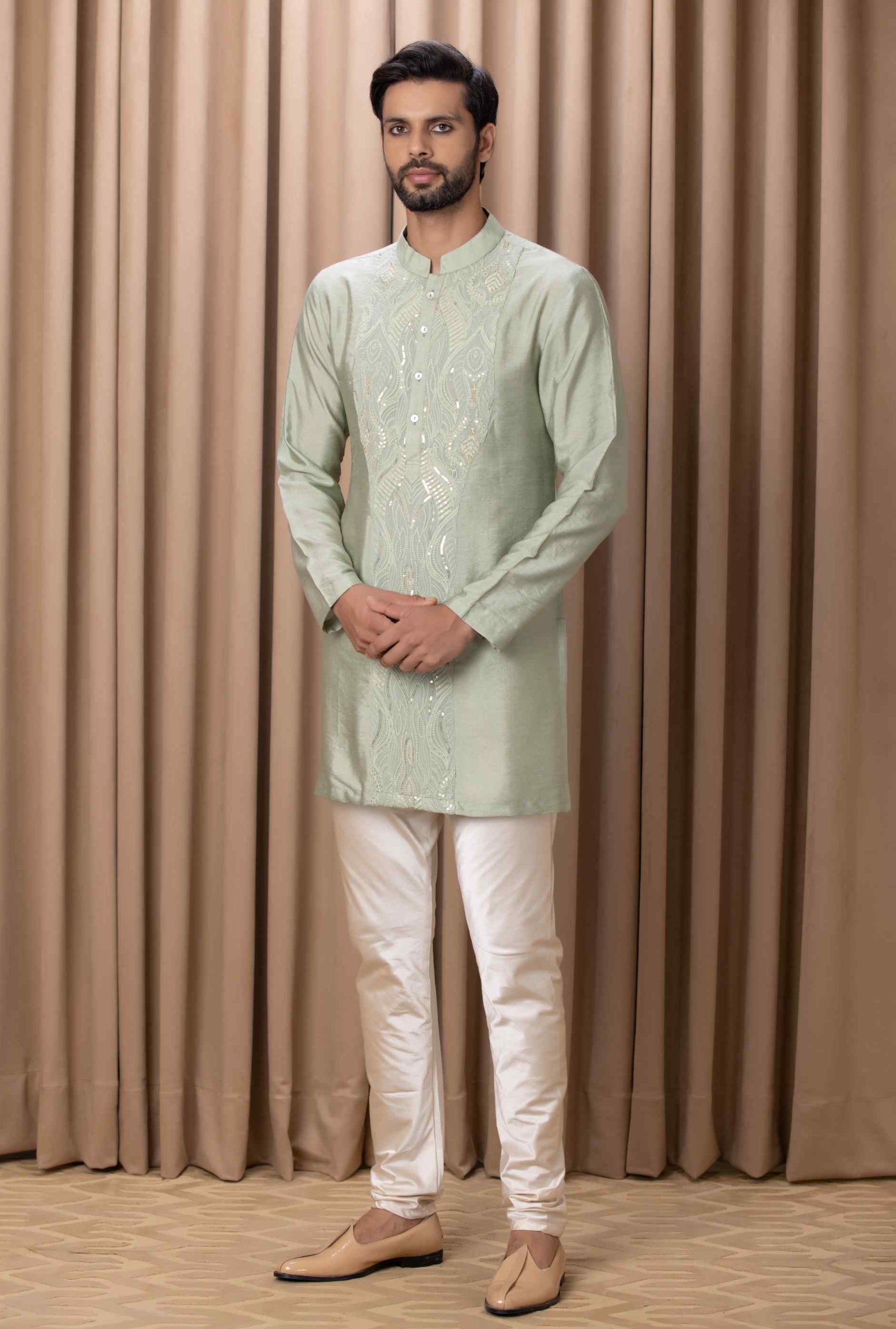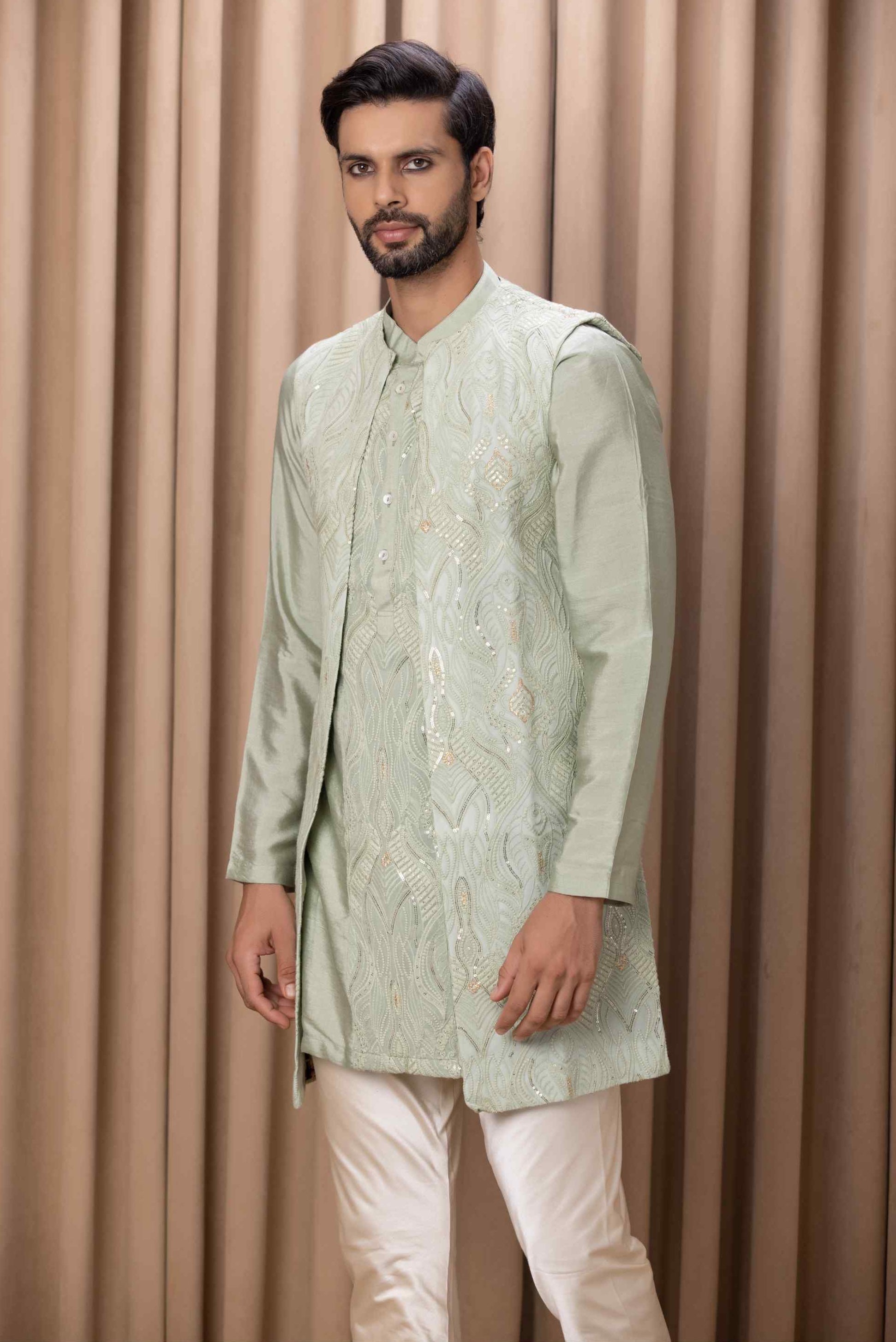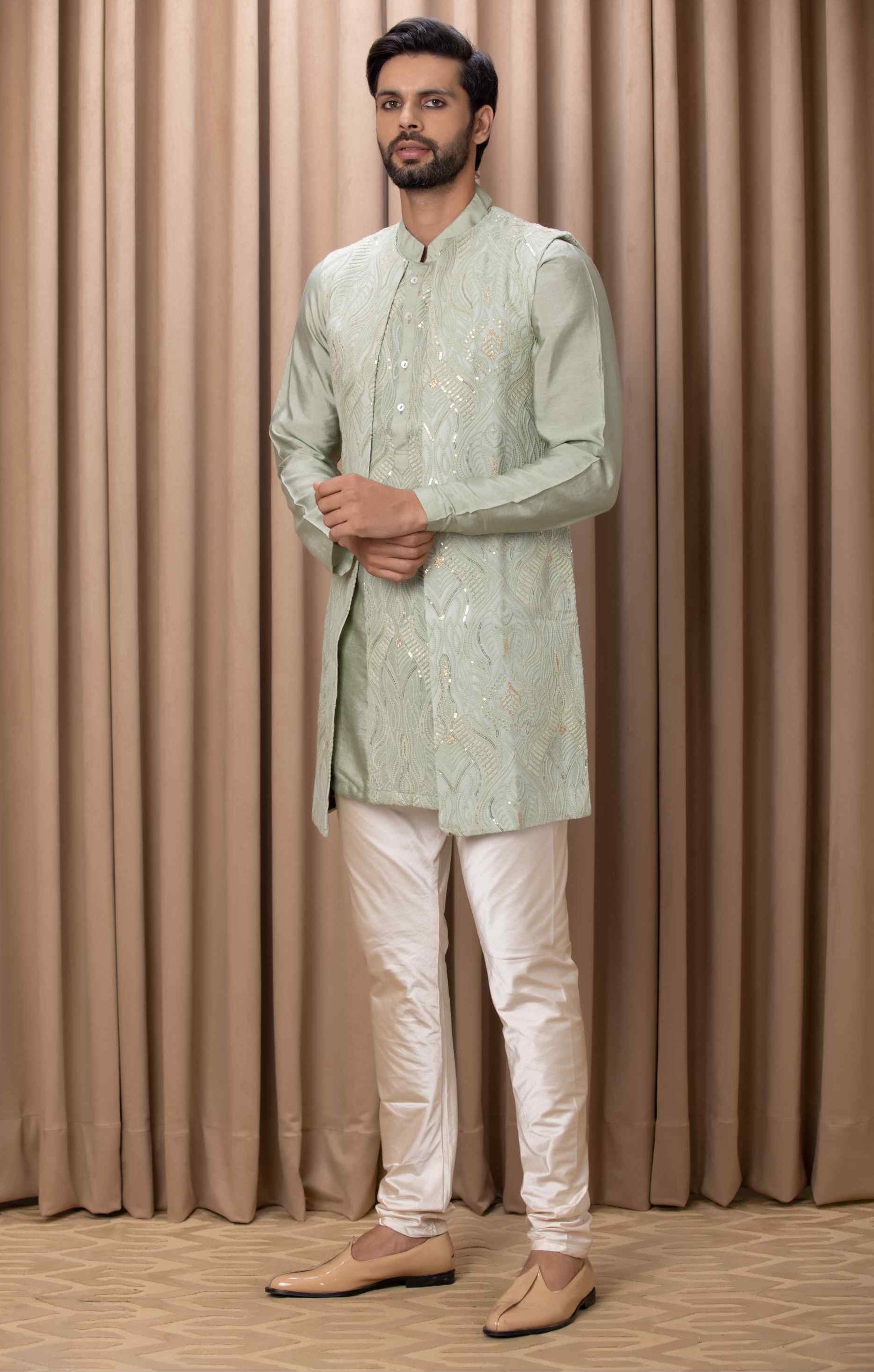 Elevate your ensemble with our traditional mint green nehru jacket, featuring exquisite thread work and delicate mirror embroidery. This front-open design is adorned with minimal yet refined details, making it an ideal choice for outdoor occasions. Paired with a tonal mint green cotton silk kurta and churidaar, each piece is crafted with an embroidered front to enhance the overall sophistication. Perfect for the modern groom or groomsmen, this outfit seamlessly combines classic craftsmanship with contemporary elegance, ensuring a memorable and distinguished appearance at any special event.