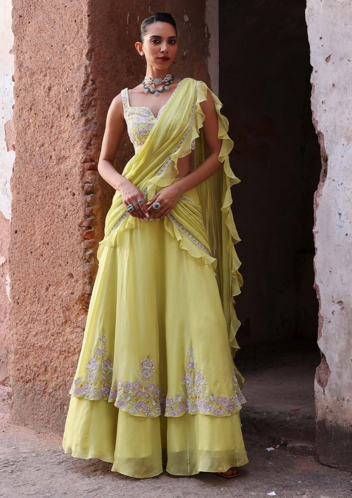 The Jinal neon green embellished choli is elegantly paired with a pre-stitched lehenga saree, featuring intricate embellishments on the skirt and pallu, complemented by a stylish can-can for added volume. This vibrant ensemble perfectly merges traditional elegance with contemporary flair, making it an ideal choice for festive occasions and celebrations. With its stunning design and confident appeal, the Jinal outfit ensures you make a remarkable impression while embracing a sophisticated and modern look.