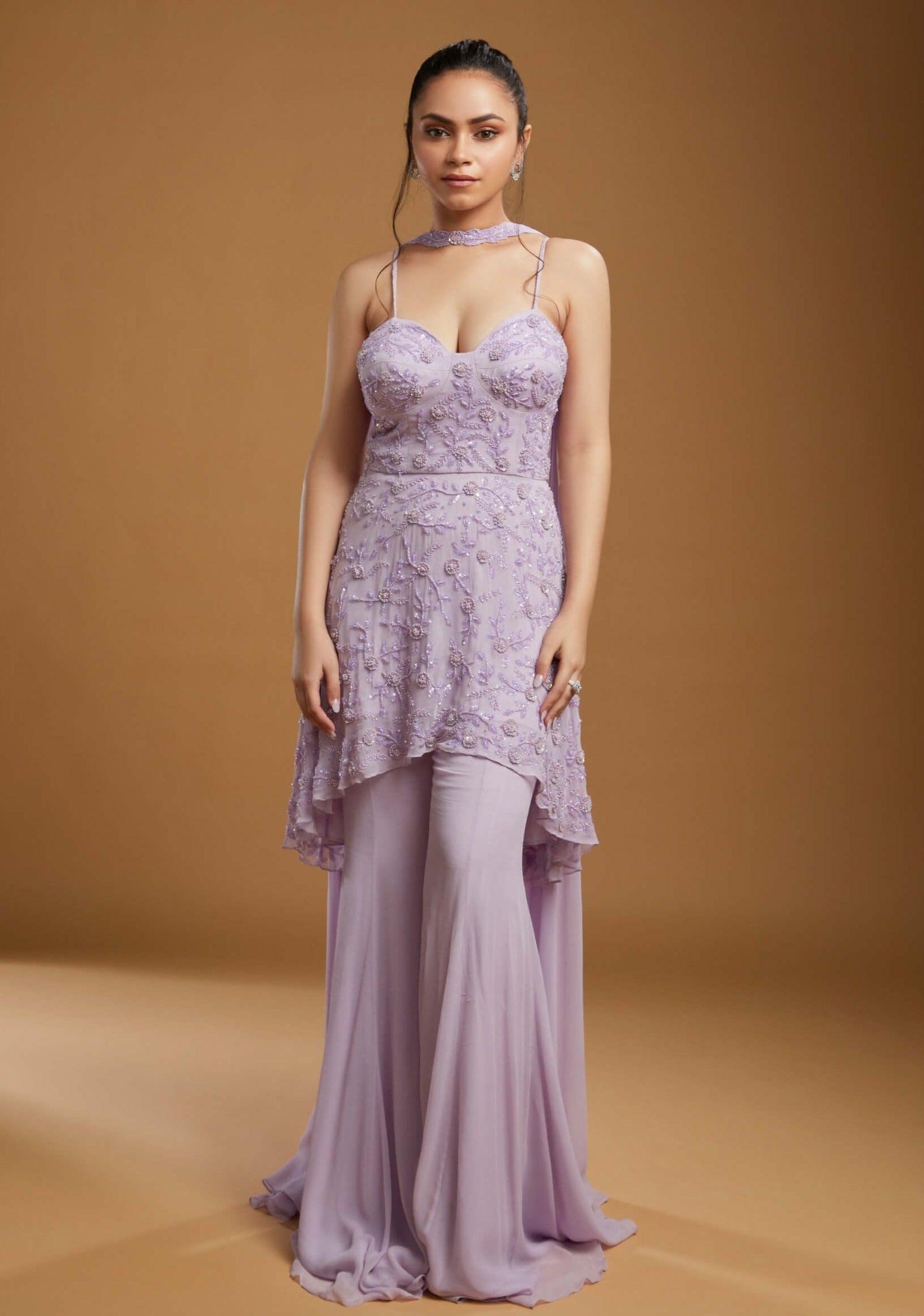 Introducing Josie the epitome of sophisticated elegance and modern flair. This fully embellished coet peplum top features intricate detailing including braided straps and a chic asymmetric hemline that enhances its unique silhouette. Paired seamlessly with sleek flared pants Josie creates a streamlined yet graceful look. The ensemble is completed with an embroidered patch dupatta adorned with glass beads and sequins over a delicate georgette base adding a touch of glamour and refinement. Perfect for those who seek a blend of classic charm and contemporary style Josie is designed to make a statement at any occasion.