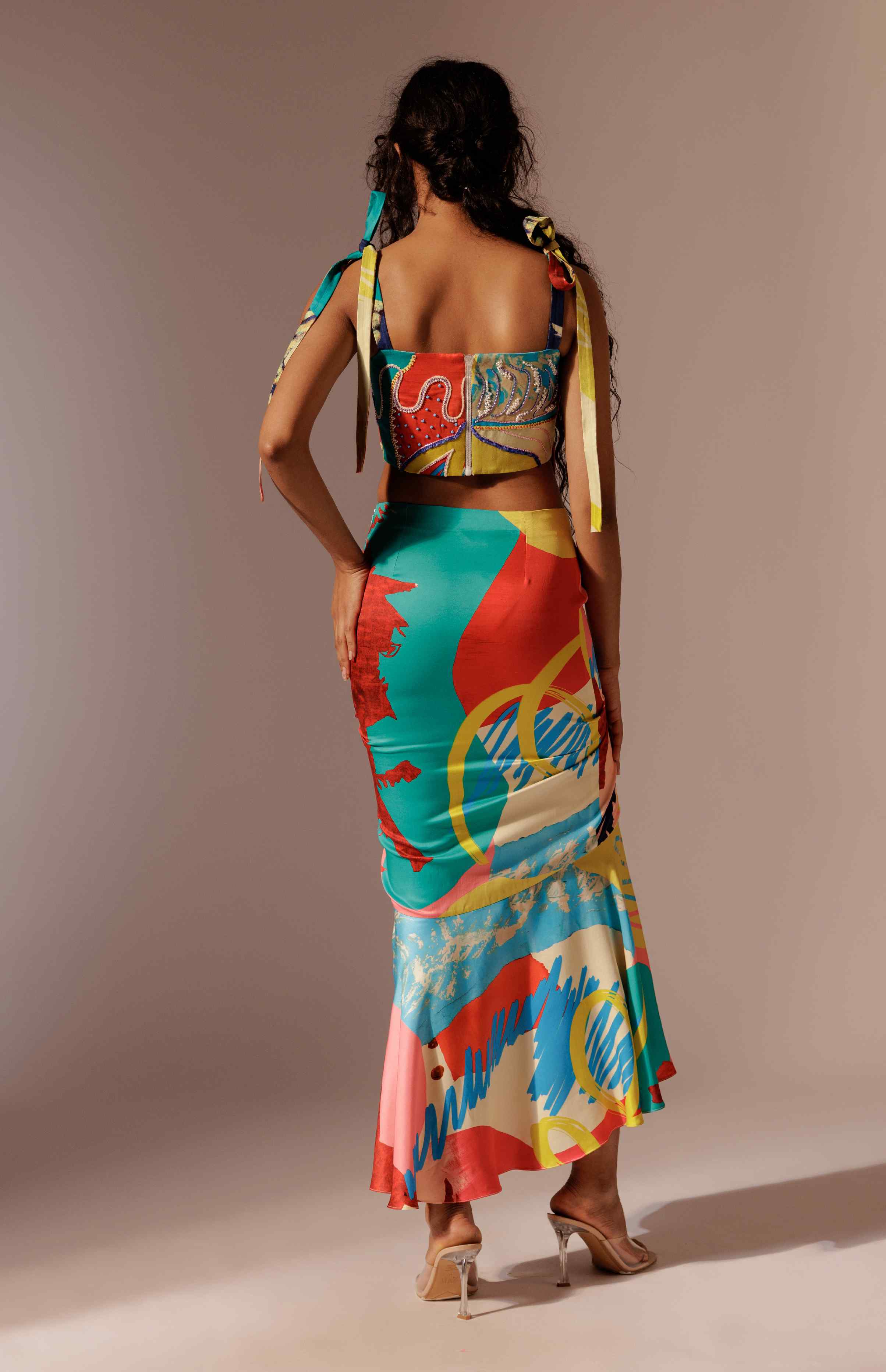 Unveil your style with our digitally printed corset, a masterpiece of modern design and artisanal craftsmanship. Adorned with delicate hand embroidery, this corset features intricate detailing that elevates its visual appeal. The Juno embroidered corset includes adjustable shoulder straps for a customizable fit and a back zip closure for added convenience and security. Complete your look with the fitted asymmetrical ruffle skirt, designed to complement the corset with its dynamic silhouette and elegant ruffle detailing. The skirt's asymmetrical hem adds a touch of contemporary flair, creating a sophisticated and balanced ensemble. Perfect for special occasions or making a statement, this outfit seamlessly combines intricate craftsmanship with stylish design.