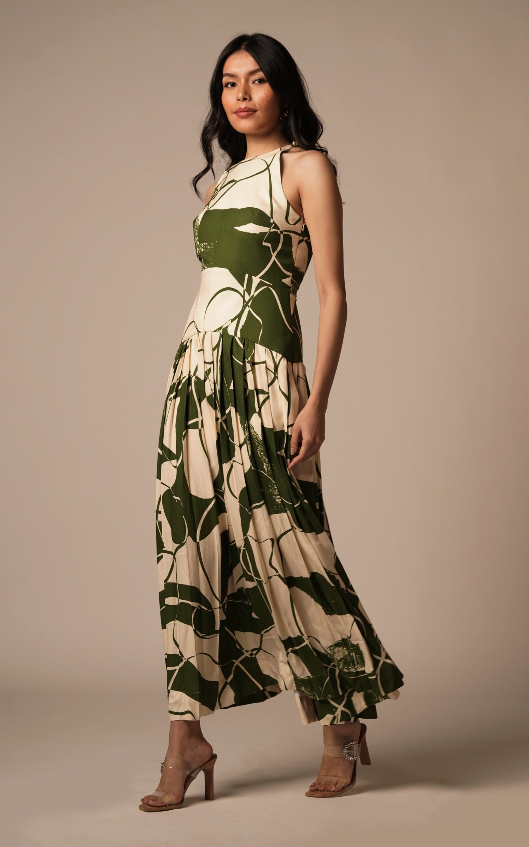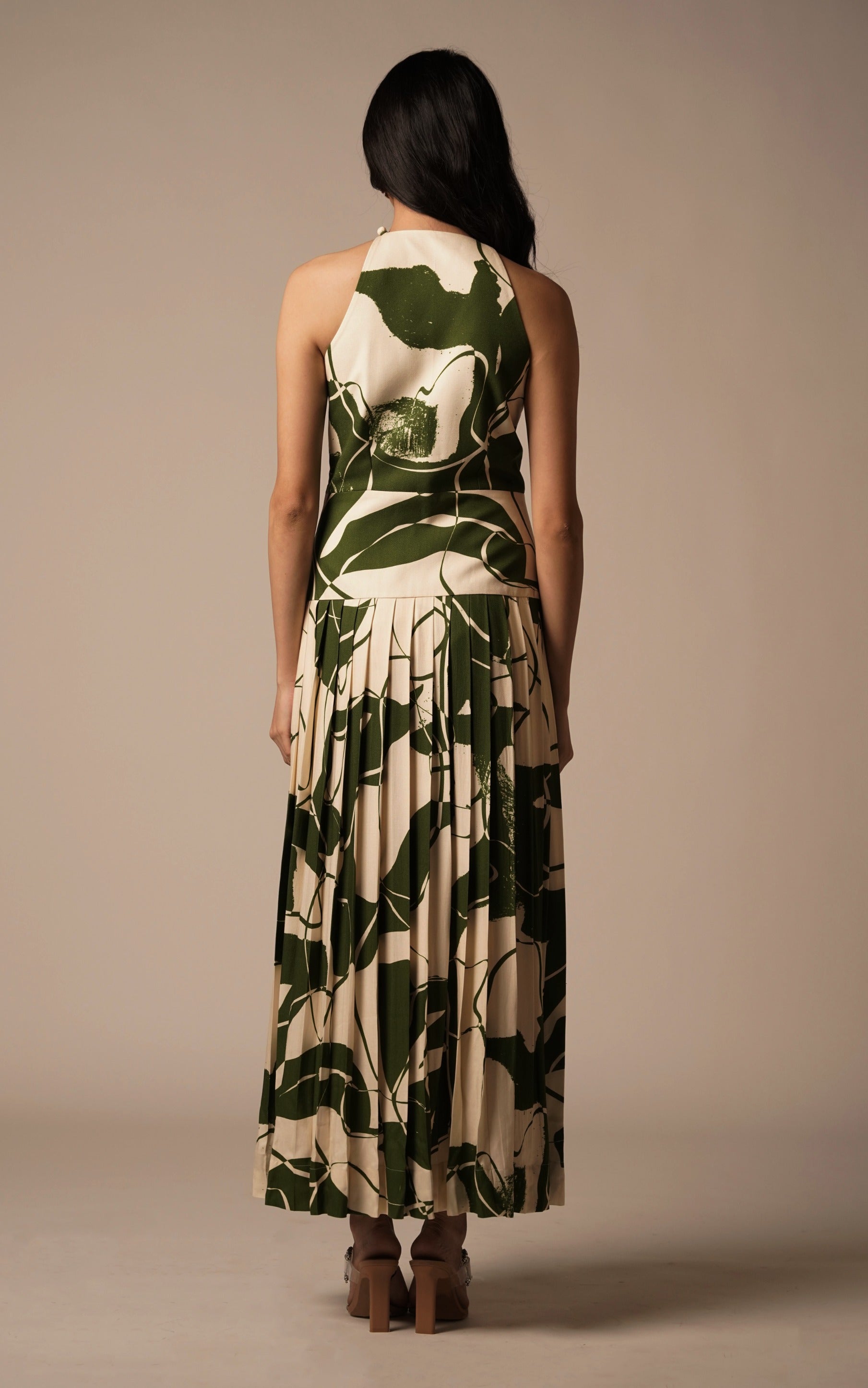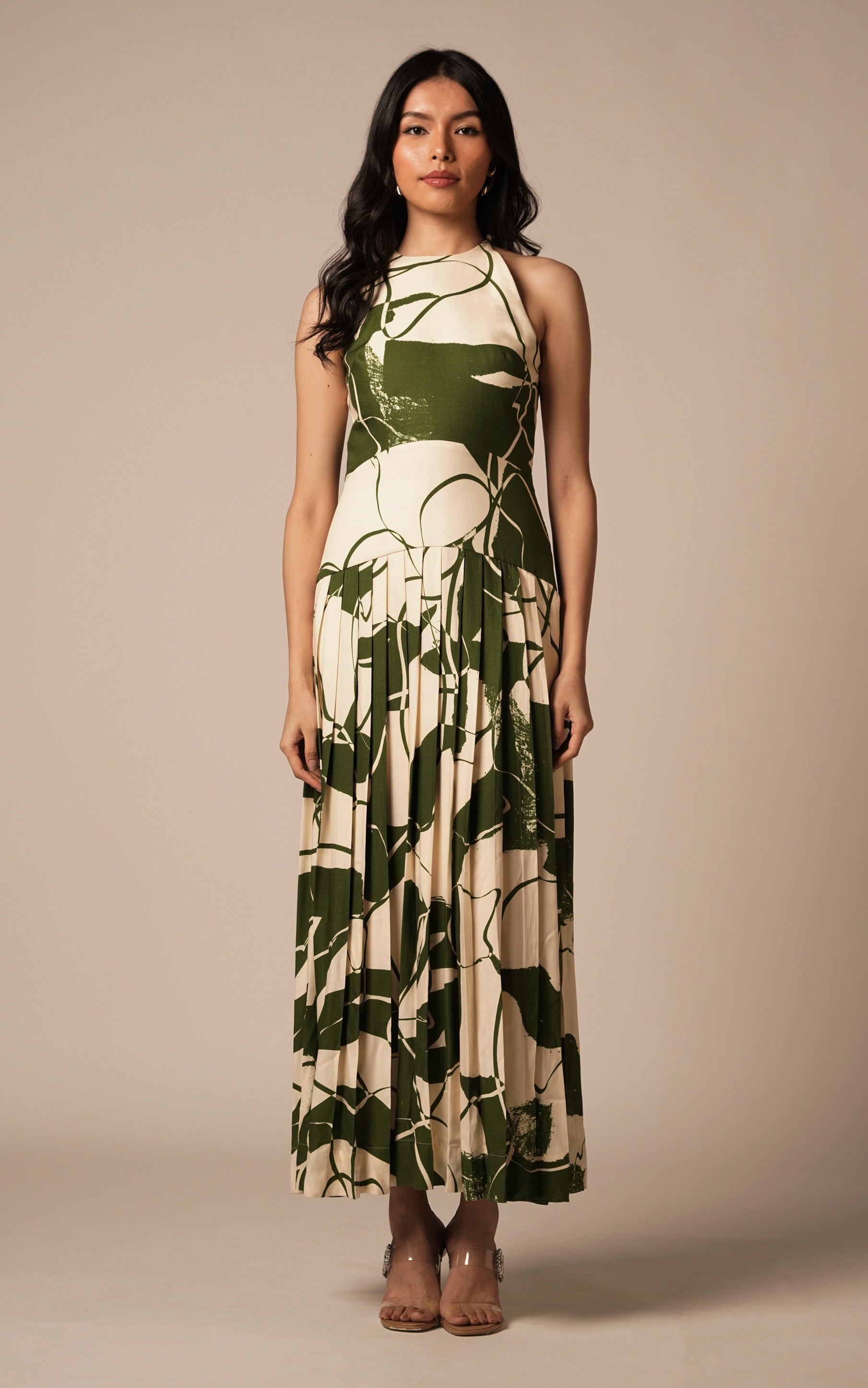 Unveil sophistication with our form-fitted maxi dress, featuring a stylish halter neckline and striking box pleats cascading from the hip. The curved seam at the hip is expertly tailored to enhance and define your silhouette, offering a flattering and elegant look. Ideal for both formal events and special occasions, this maxi dress seamlessly blends classic charm with modern design. Elevate your wardrobe with this refined piece, crafted to make a memorable impression with every wear.
