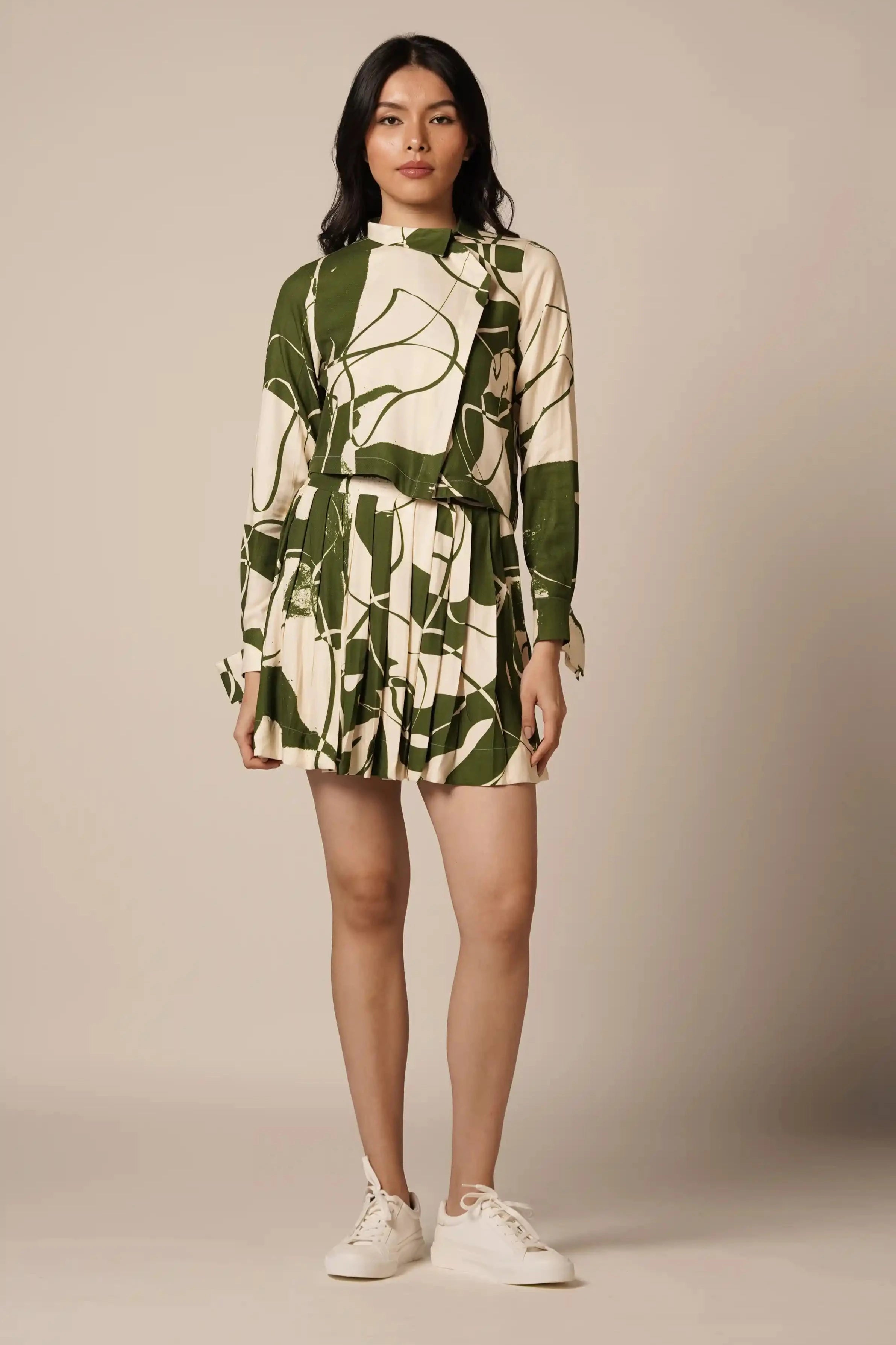 Elevate your wardrobe with this stylish skirt set, featuring an asymmetrical top with a refined collar and a cross placket for a modern edge. The ensemble is completed with a hand-pleated tennis skirt, adding a touch of elegance and movement. This combination of contemporary design and classic pleating creates a versatile look that’s perfect for both casual and sophisticated occasions. Embrace effortless style and make a statement with this chic outfit that seamlessly blends fashion and function.