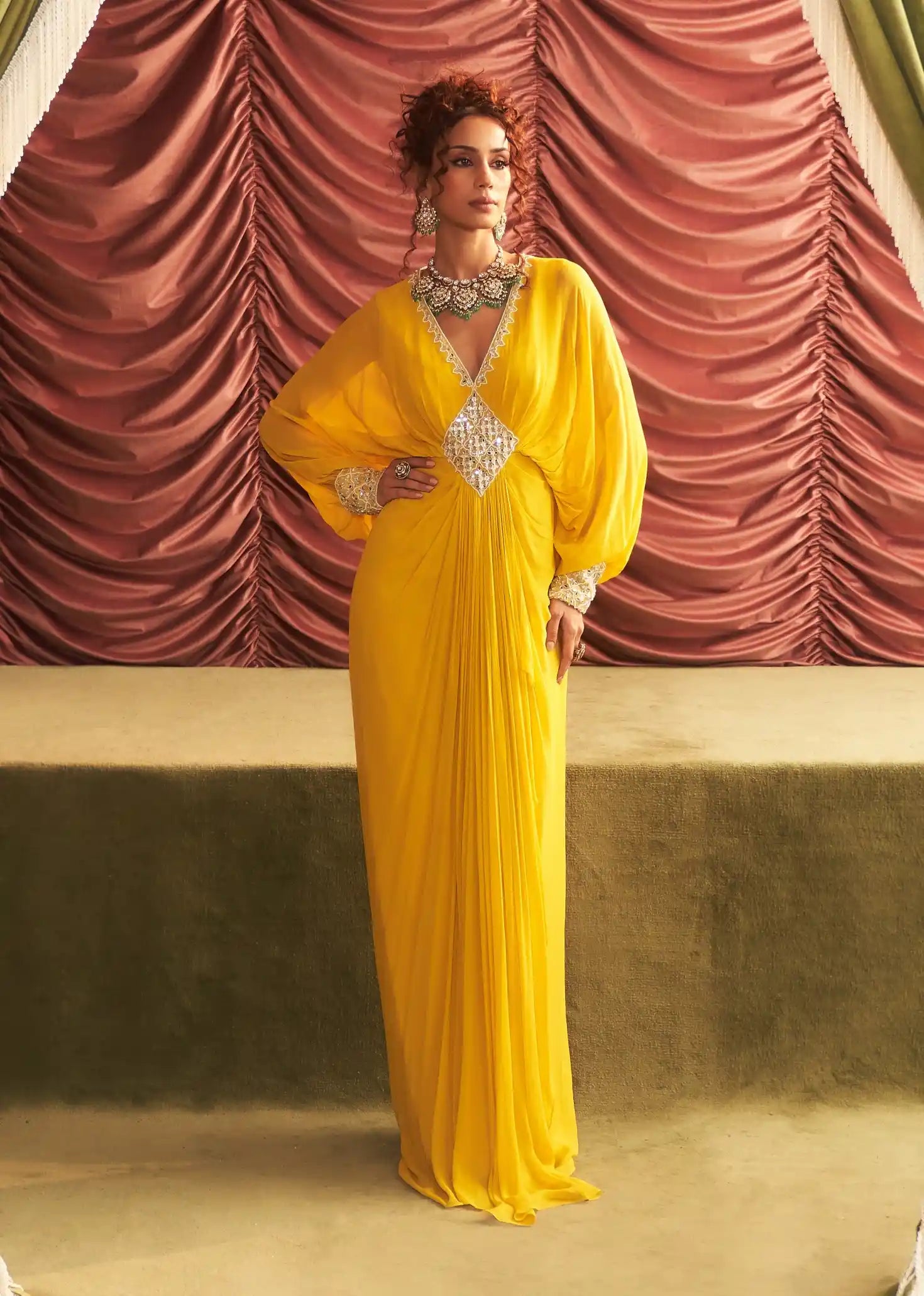Step into the spotlight with our yellow embellished draped full-length dress, a stunning blend of elegance and contemporary style. This eye-catching dress features intricate embellishments that catch the light beautifully, adding a touch of glamour to your look. The draped design gracefully flows, creating a flattering silhouette that complements all body types while ensuring comfort and ease of movement. Perfect for evening events, weddings, or special occasions, this dress embodies sophistication and charm, making you the center of attention wherever you go. Embrace your unique style and shine in this exquisite ensemble!