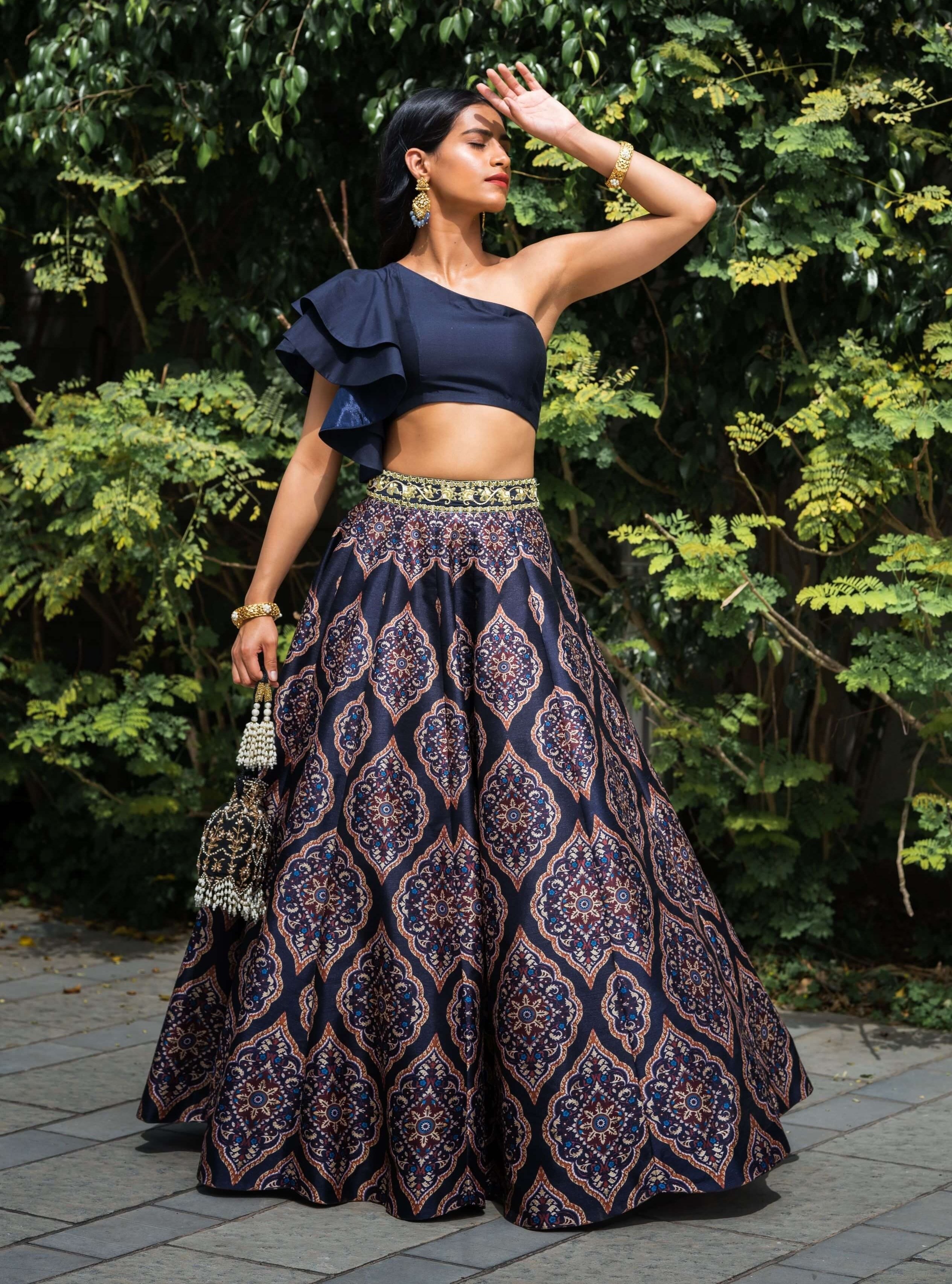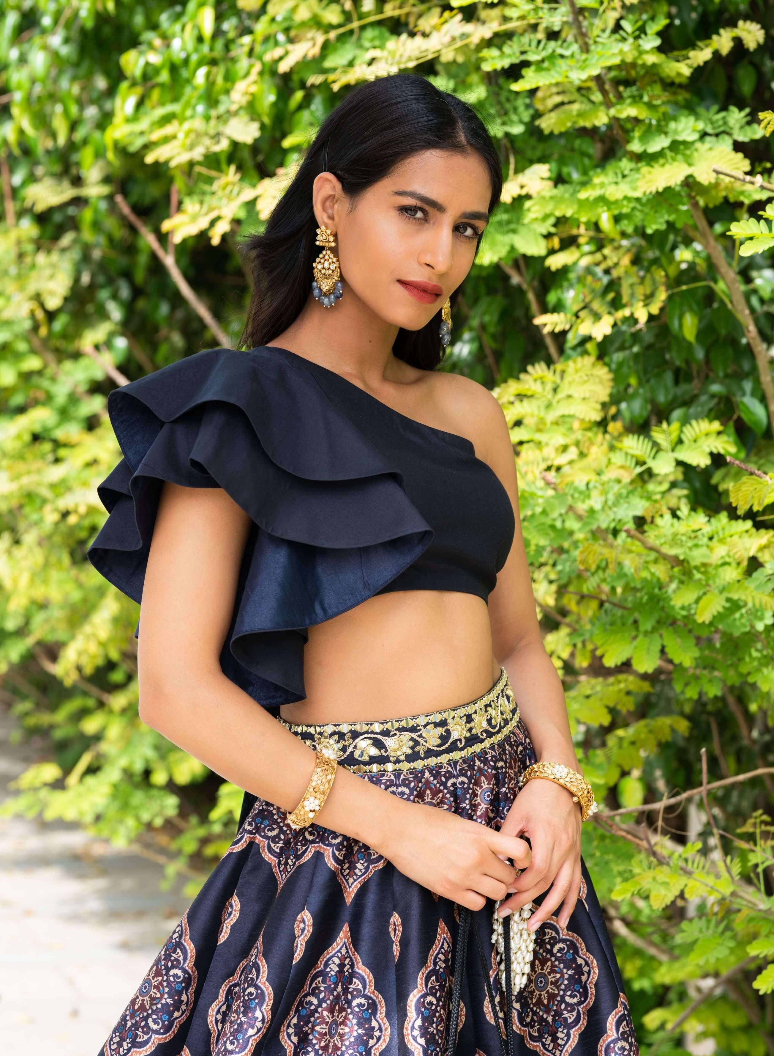 Adorn yourself in sophistication with the navy silk dupion printed lehenga complemented by an embroidered belt and paired elegantly with a one-shoulder cotton silk ruffle blouse. The lehenga, crafted from luxurious silk dupion, features intricate prints that add a touch of charm and elegance. The embroidered belt enhances the waistline with exquisite detailing, while the one-shoulder blouse in cotton silk offers a modern and feminine silhouette with its ruffled design. Perfect for festive occasions and celebrations, this ensemble blends traditional craftsmanship with contemporary style, ensuring you exude grace and refinement with every wear.