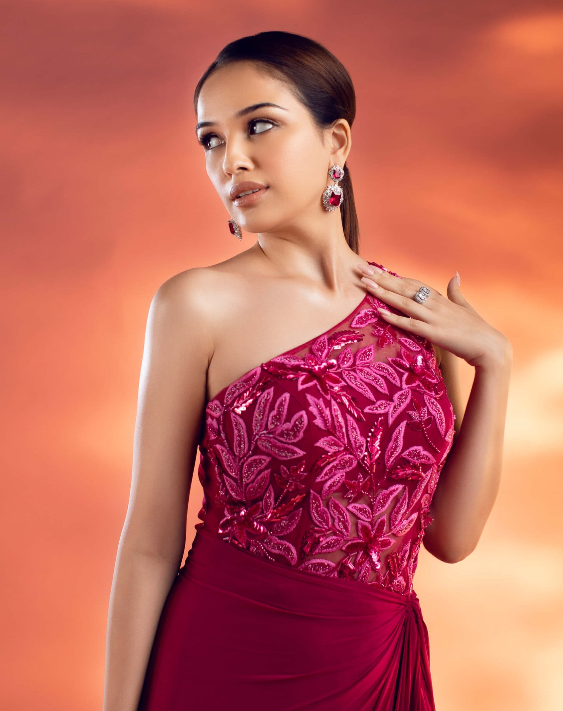 Immee youelf in the vibrant elegance of our magenta draped gown designed on a luxurious net and georgette base. This stunning gown features intricate floral motifs meticulously crafted with shimmering glass beads sparkling sequins and rich resham threads. The graceful draping enhances the gown’s fluid silhouette while the elaborate embellishments add a touch of opulence and sophistication. Perfect for making a striking impression this gown effortlessly combines modern glamour with timeless beauty.