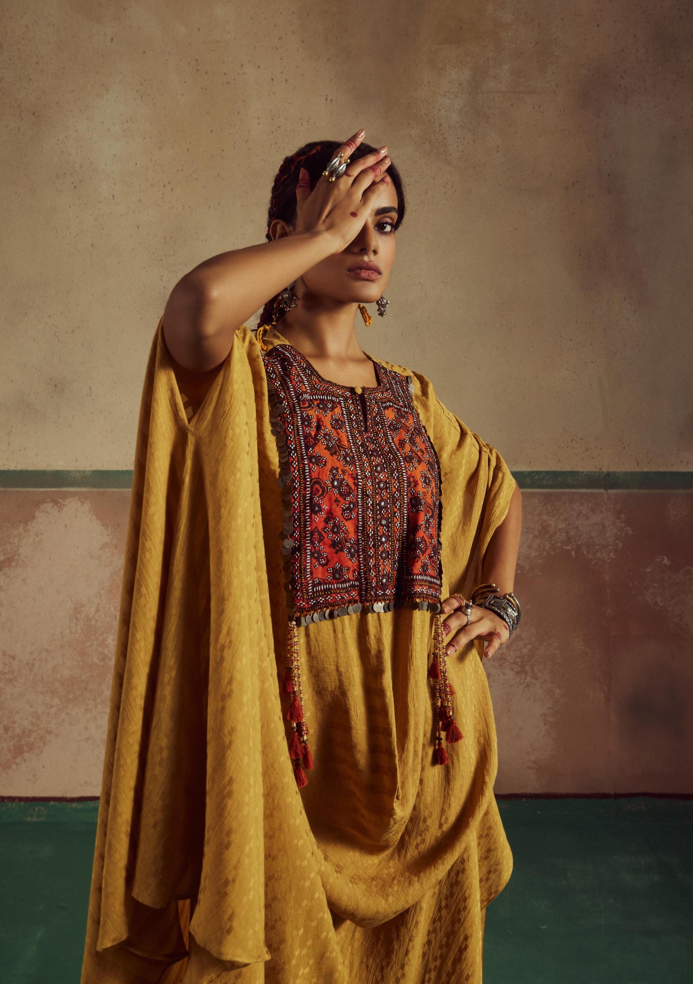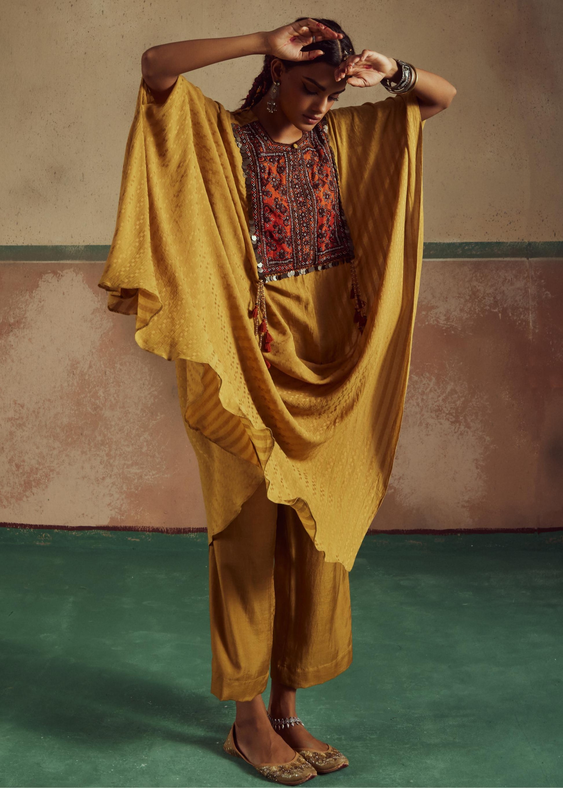 This kesari mustard asymmetrical cowl cape is beautifully adorned with tribal boho patchwork, creating a bold, eclectic look. The capeÕs unique drape adds movement and flair, while the intricate patchwork enhances its bohemian appeal. Paired with matching pants, this ensemble effortlessly combines modern style with earthy, tribal elements for a striking and fashionable appearance.