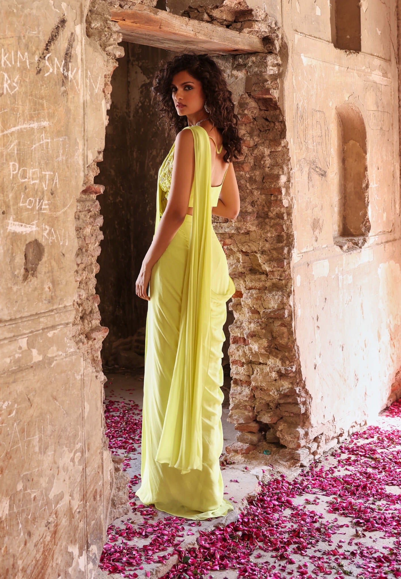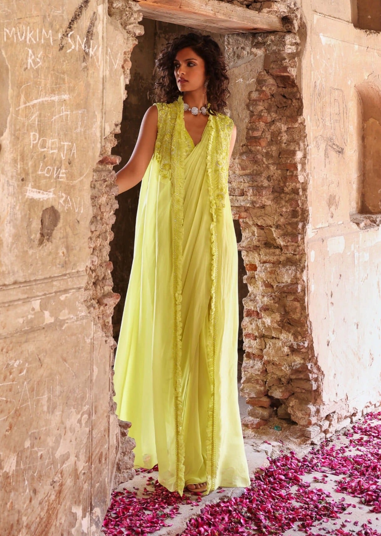 Discover the Keva neon green embellished choli, exquisitely paired with an embellished jacket and a pre-stitched saree. This striking ensemble features intricate detailing and vibrant color, offering a perfect fusion of traditional elegance and modern flair. Ideal for festive occasions, the Keva outfit ensures a sophisticated and standout appearance that exudes effortless elegance. Elevate your wardrobe with this captivating blend of style and grace, designed to make a memorable impression at any celebration.