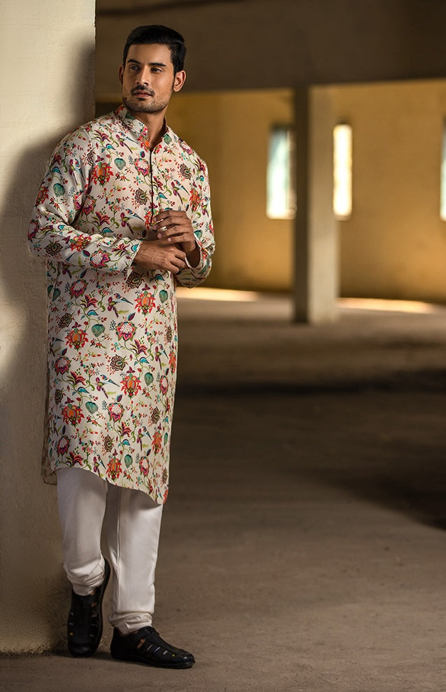 Embrace effortless elegance with this khaki chidiya print silk kurta, designed for the contemporary man who appreciates unique style. Crafted from luxurious silk, this kurta features a charming bird motif that adds a whimsical touch to your ethnic look. The rich khaki hue beautifully highlights the intricate print, while the soft fabric ensures comfort and sophistication.