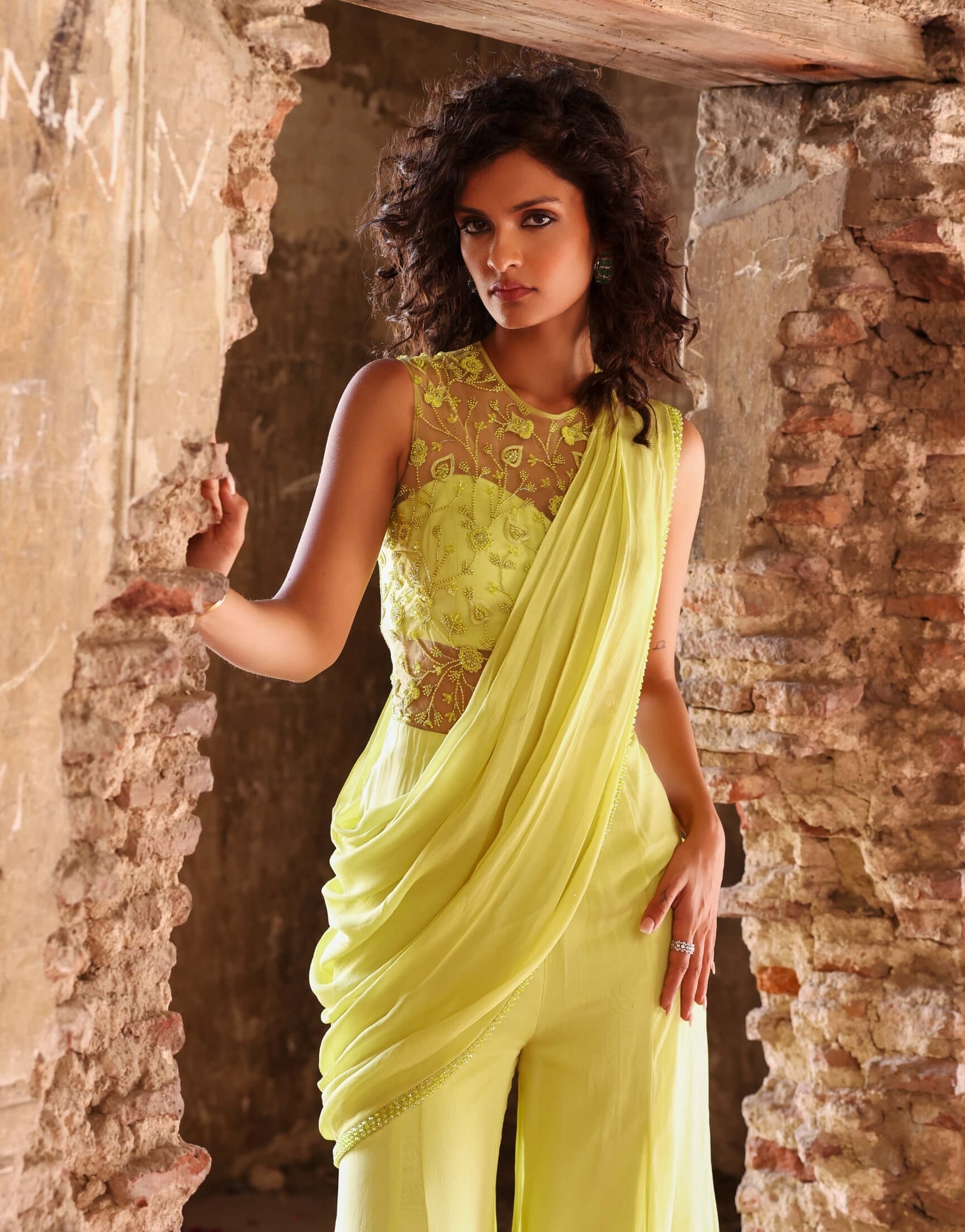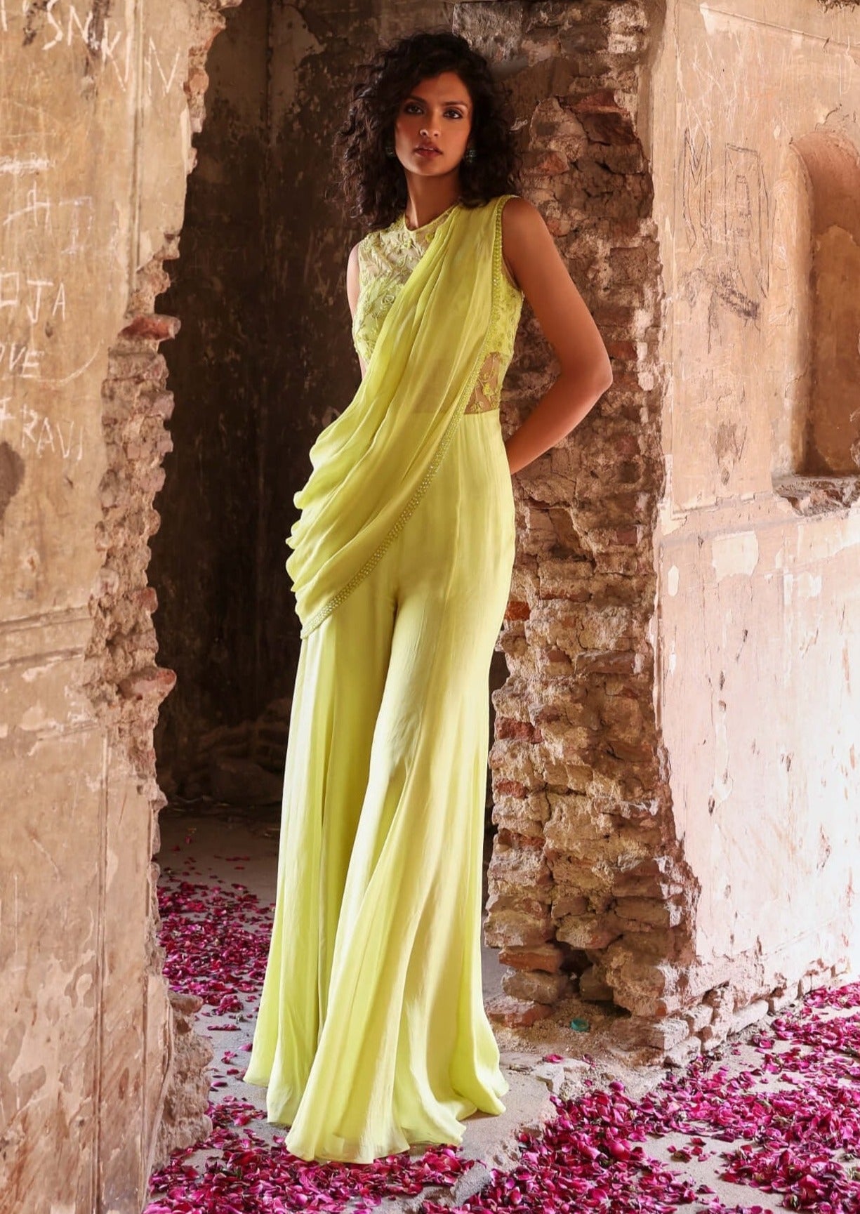 The kirat neon green embellished jumpsuit features a stylish flared bottom, expertly paired with an embellished draped pallu. This ensemble combines contemporary design with intricate detailing, showcasing a bold yet sophisticated aesthetic. The vibrant hue and thoughtful embellishments create a striking look, making it an ideal choice for modern celebrations and special occasions, reflecting both elegance and individuality.