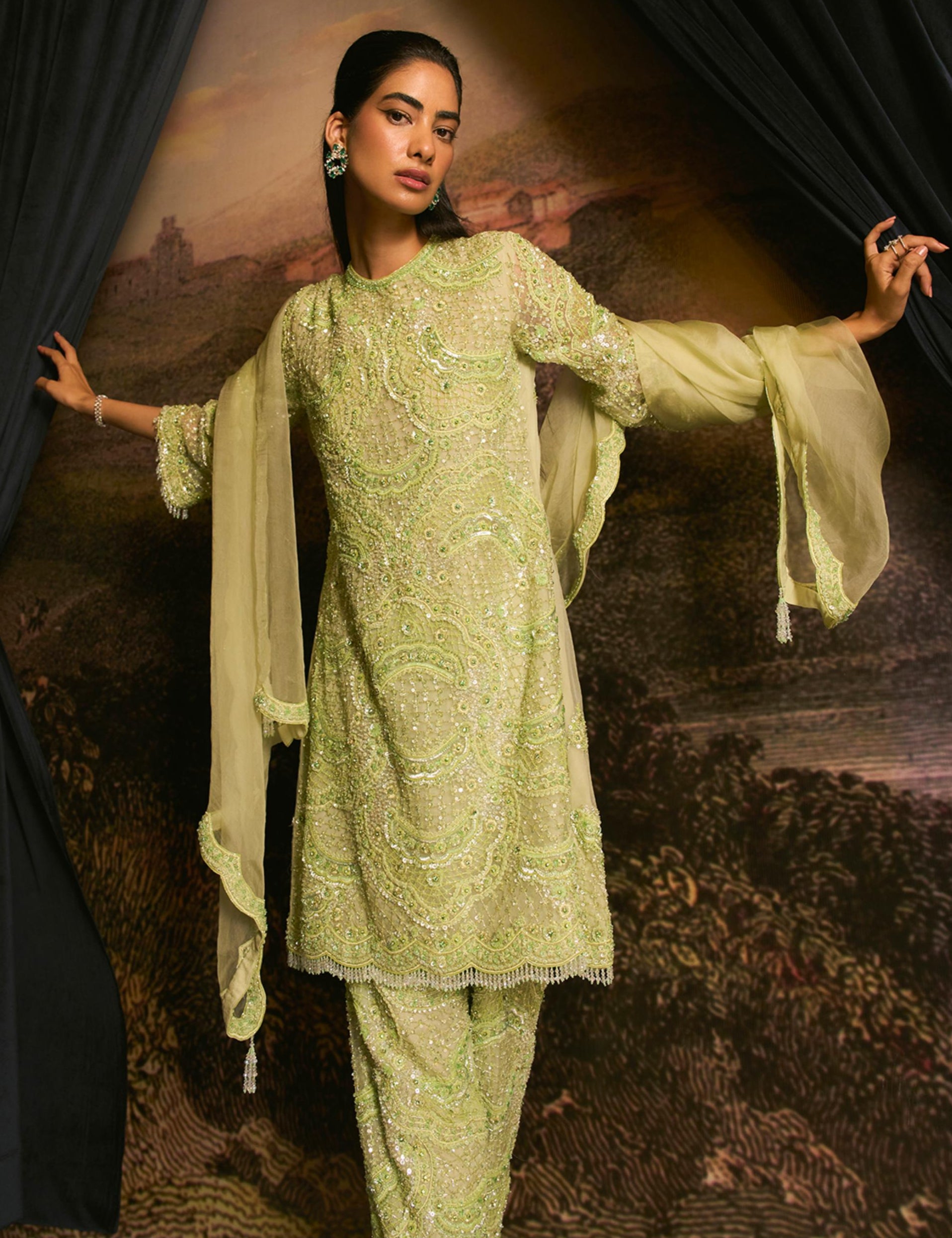 Exude timeless elegance in this exquisite suit set, featuring a pearl and cutdana embroidered shirt paired with an embroidered salwar. The ensemble is completed with an organza dupatta, adorned with delicate scalloped embroidery, making it a perfect choice for weddings, receptions, and festive celebrations.