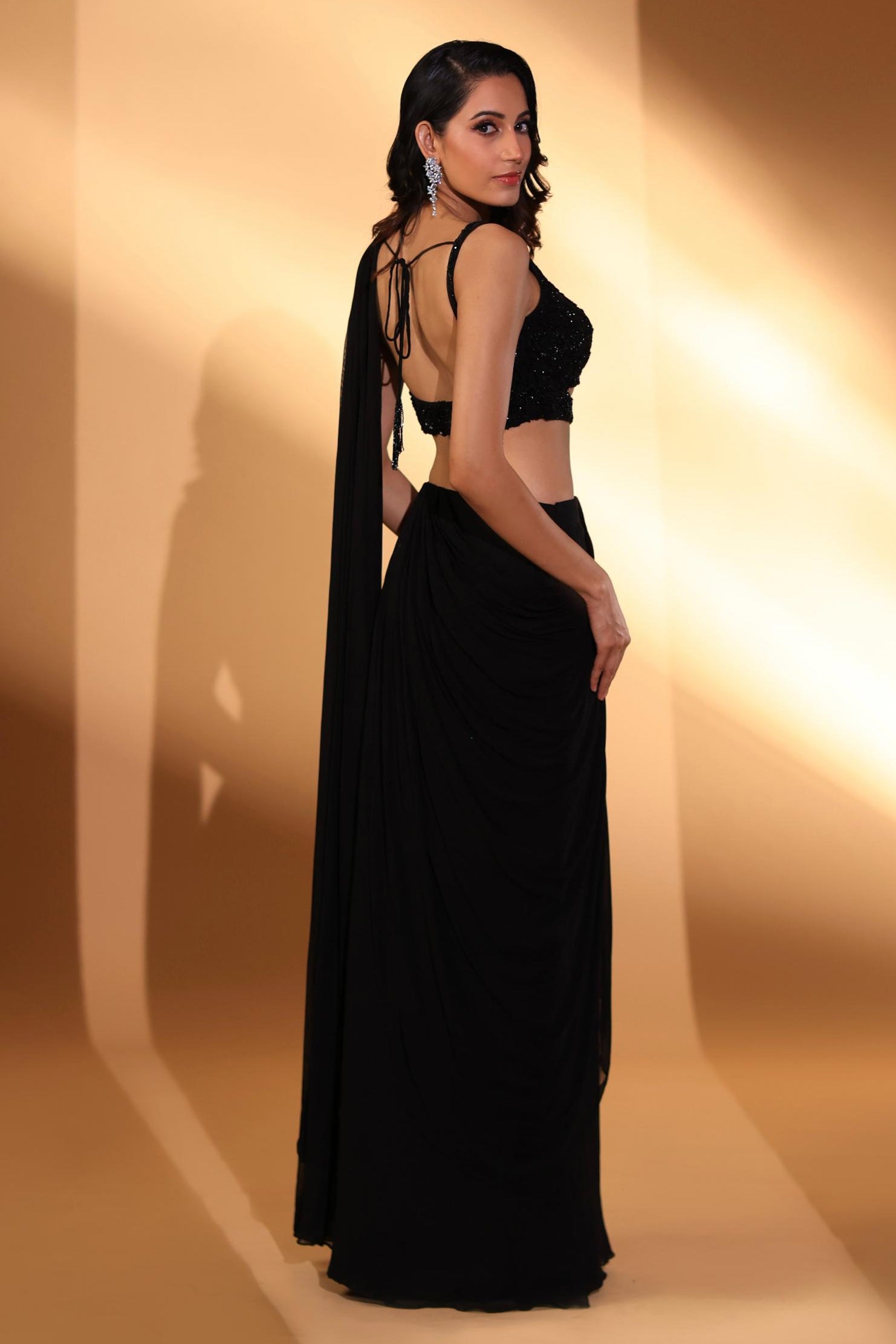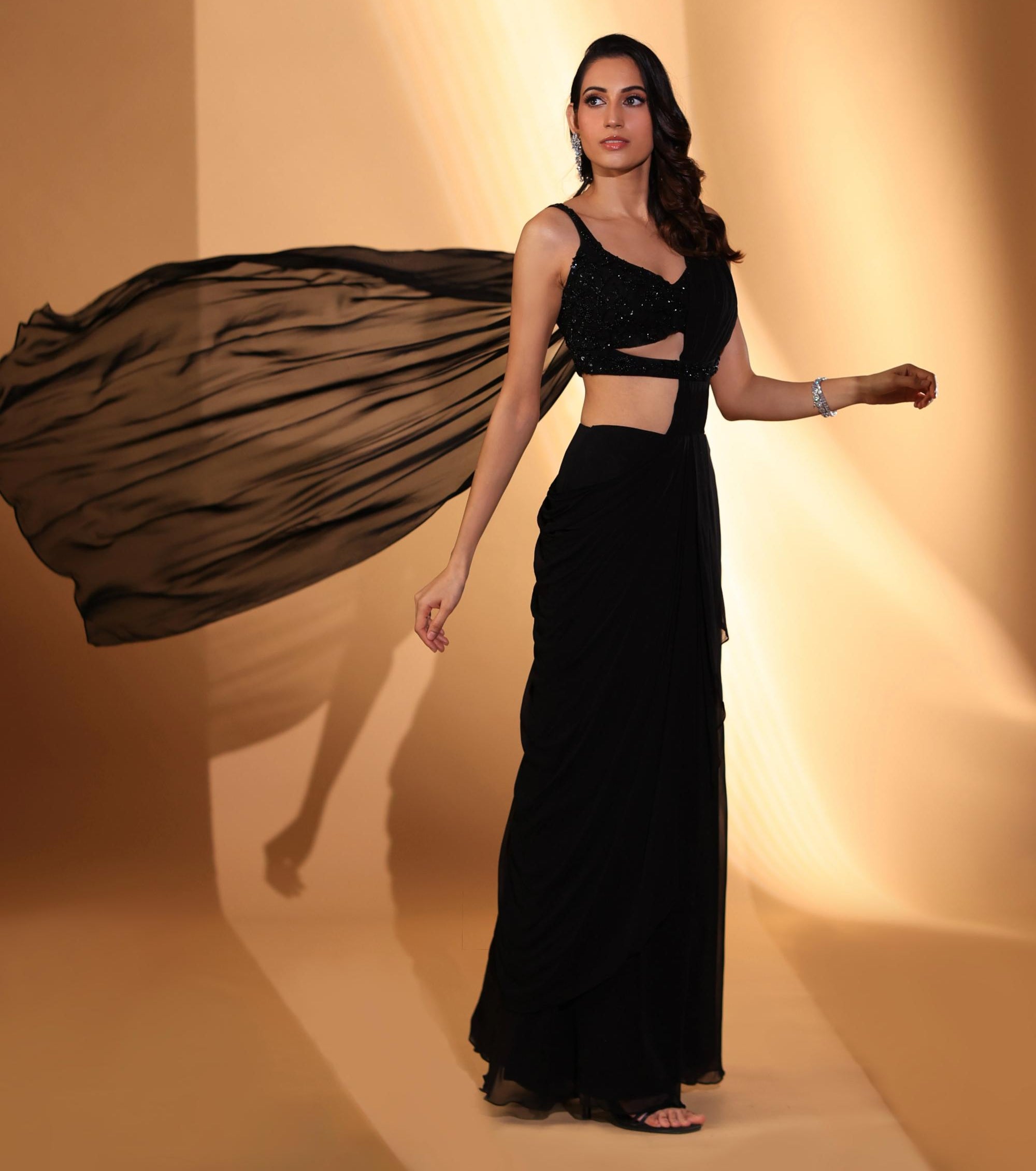The pre-draped saree in black is an elegant choice for evening events, parties, and weddings. Its pre-draped style provides convenience while exuding grace. This pre-draped saree offers effortless sophistication, making it a versatile wardrobe essential. Perfect for formal gatherings, receptions, or festive celebrations, the pre-draped saree combines style and comfort. Accessorize with bold jewelry for a glamorous look or keep it minimal for understated elegance. This pre-draped saree ensures you stand out at any event with poise and refinement.